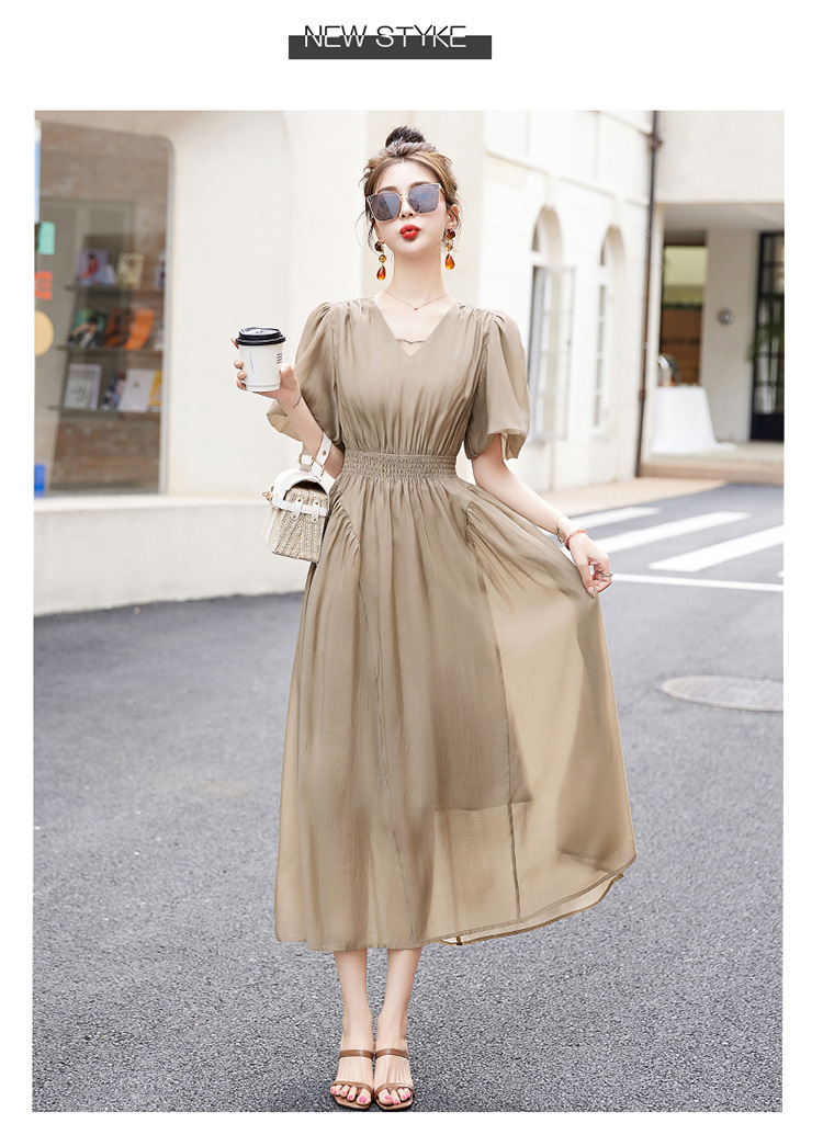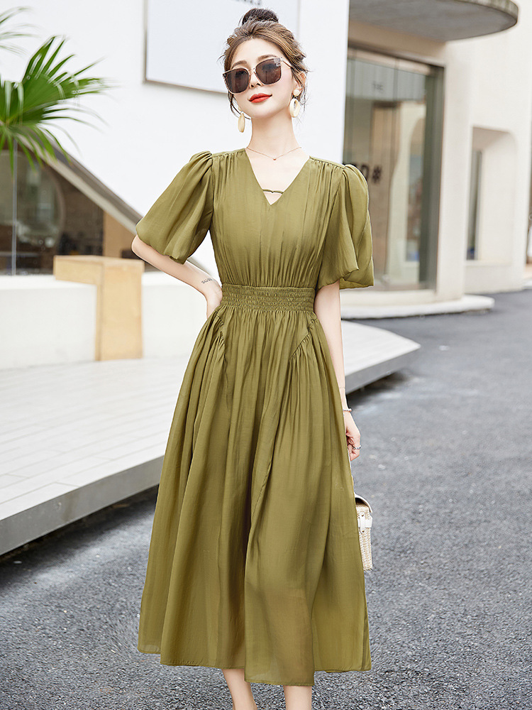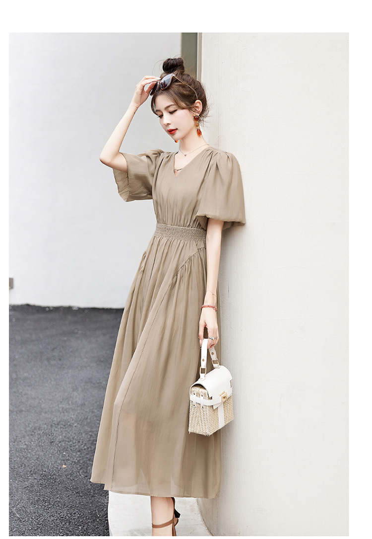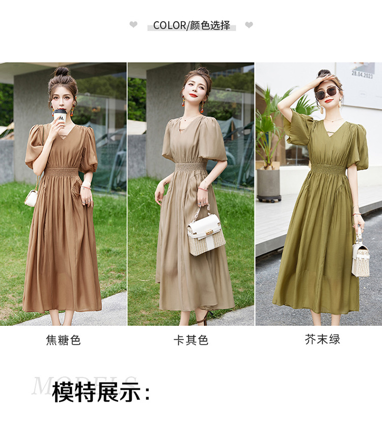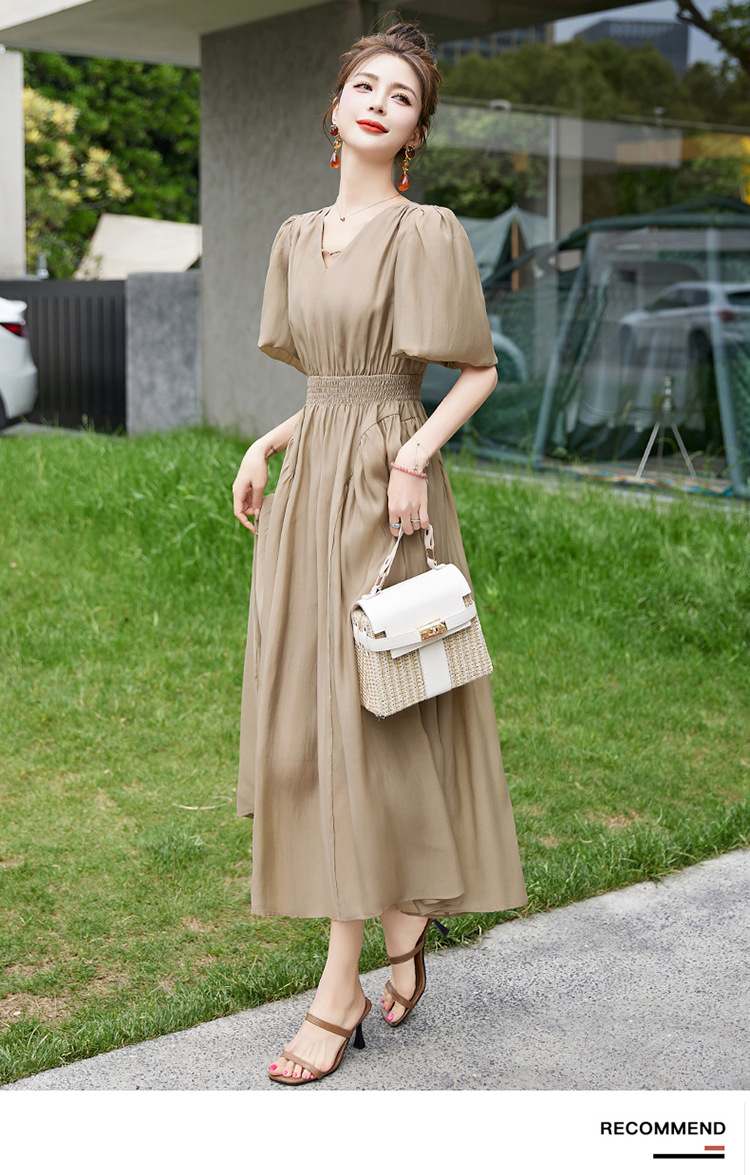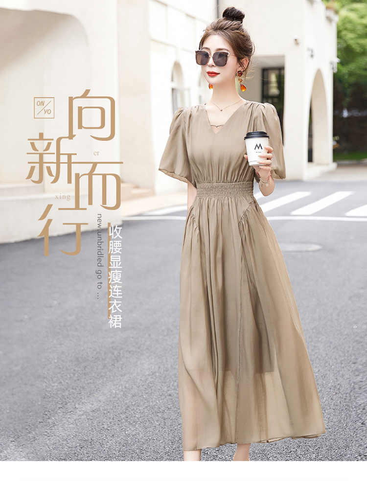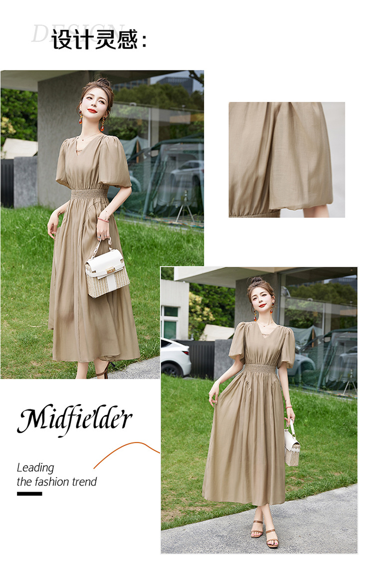 Váy dài thiết kế cổ chữ V tôn dáng, tay điểm nơ nhẹ nhàng. Phần eo được may dạng thun co giãn, ôn hờn và tạo điểm nhấn. Vải dày dặn, chiếc váy có độ xòe đẹp, dáng dài thướt tha phù hợp nhiều dịp. Dễ dàng phối cùng giày dép và phụ kiện. Mặc vào là đẹp, thích hợp cho những ngày hè mát mẻ. | Tên sản phẩm: Váy Đầm Liền Thân Nữ Cổ Chữ V Hàng Mùa Hè Phong Cách Hàn Quốc - Thời Trang Nữ | Mã sản phẩm: K3741 - Giá: 1.390.000đ | Mã nhà sản xuất: HADG-G04Hình ảnh sản phẩm