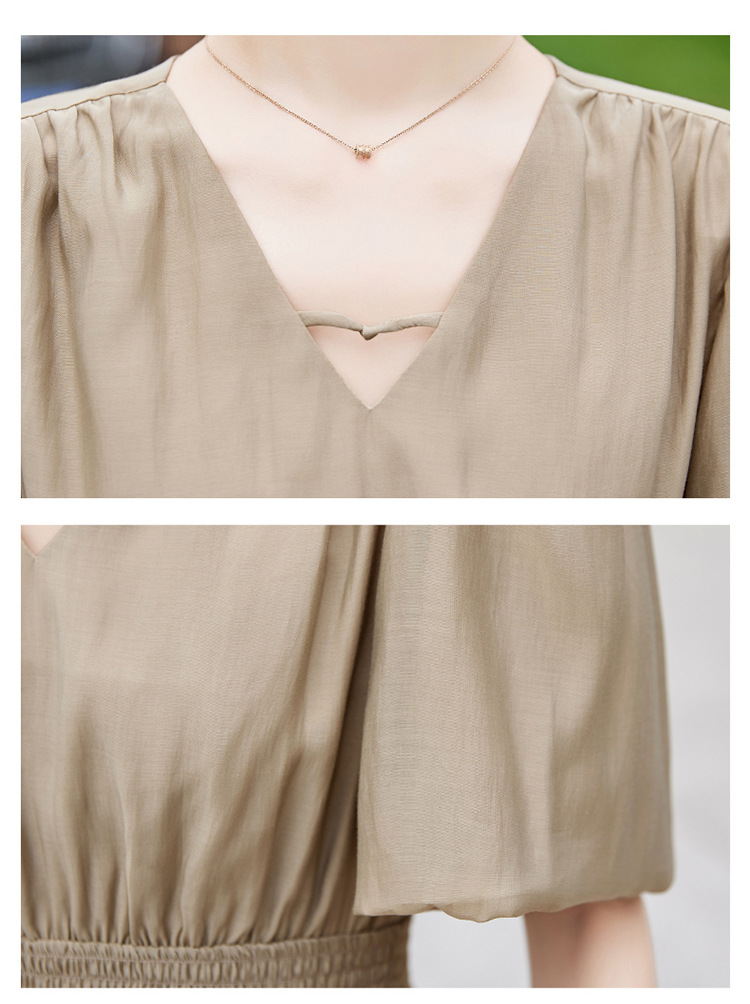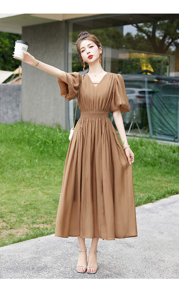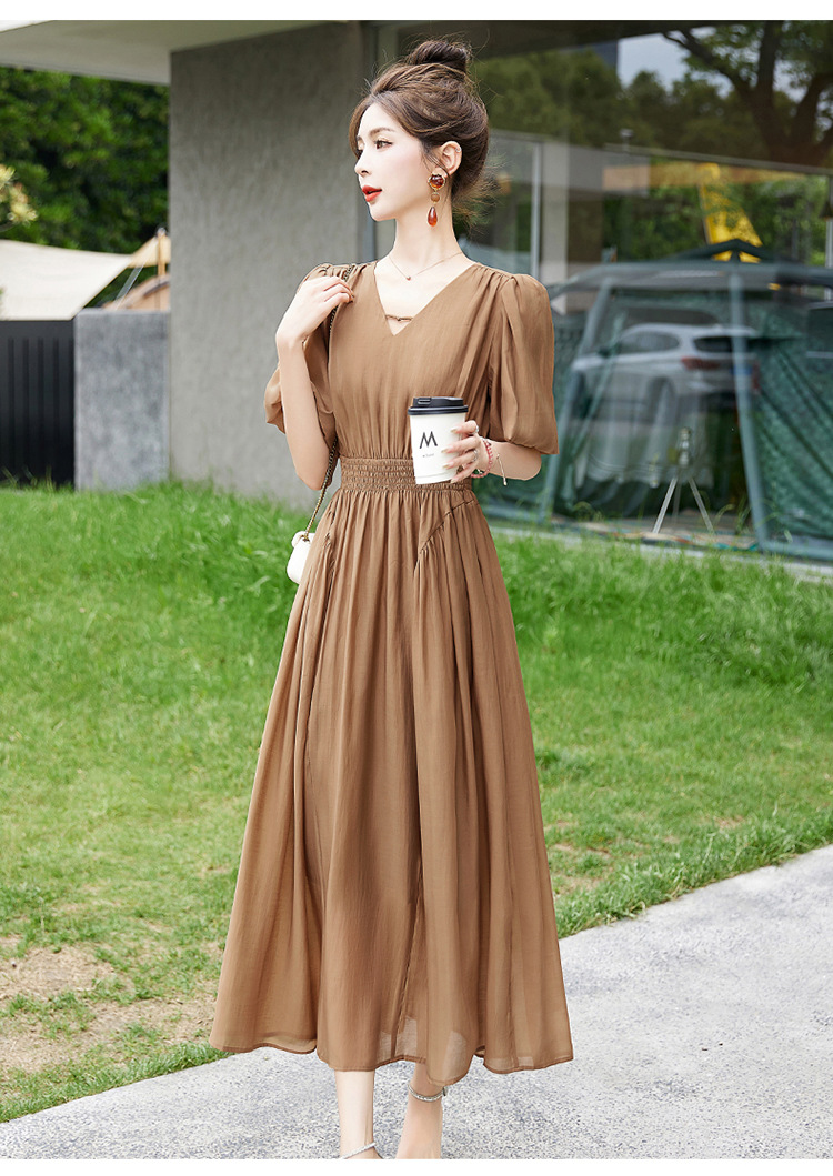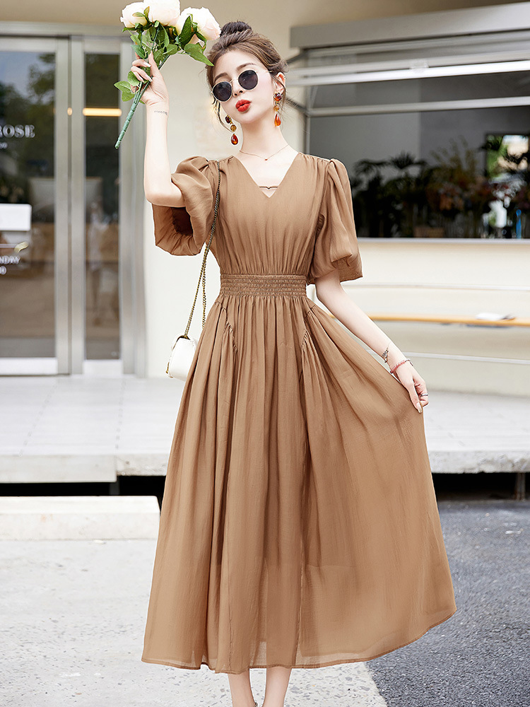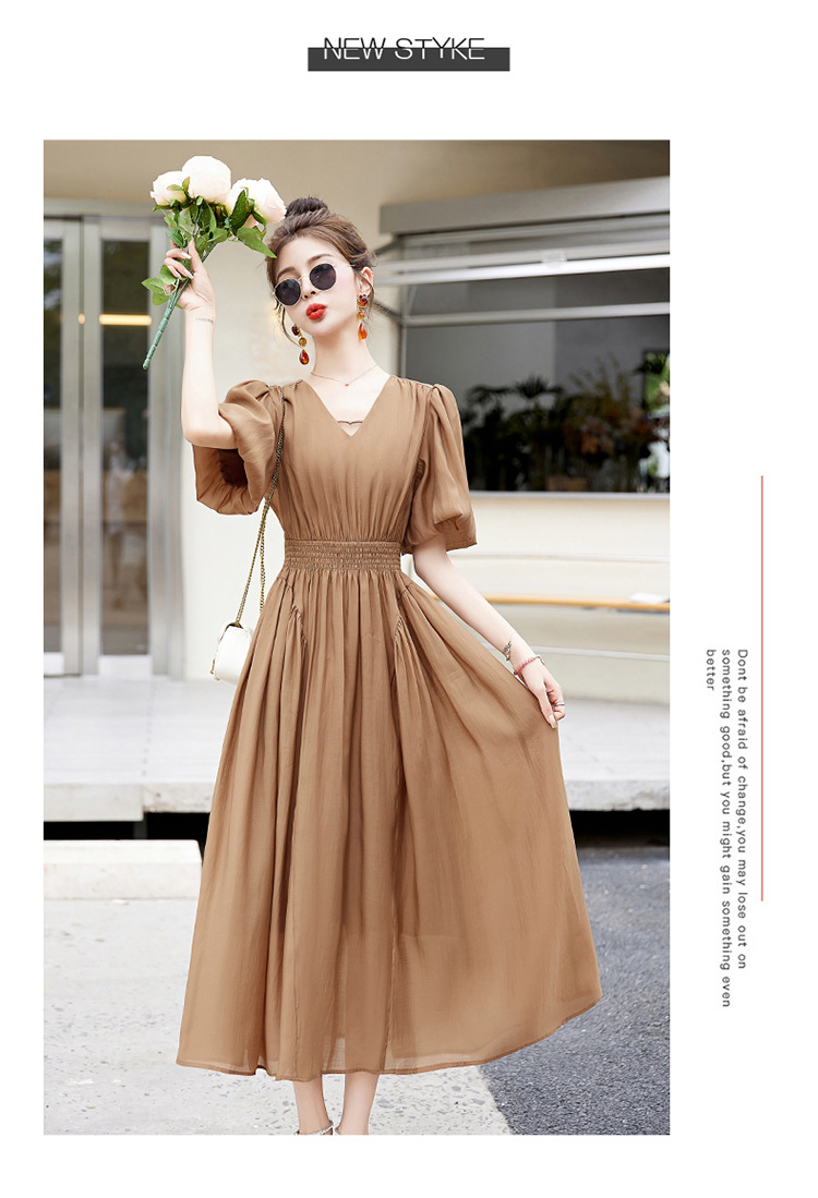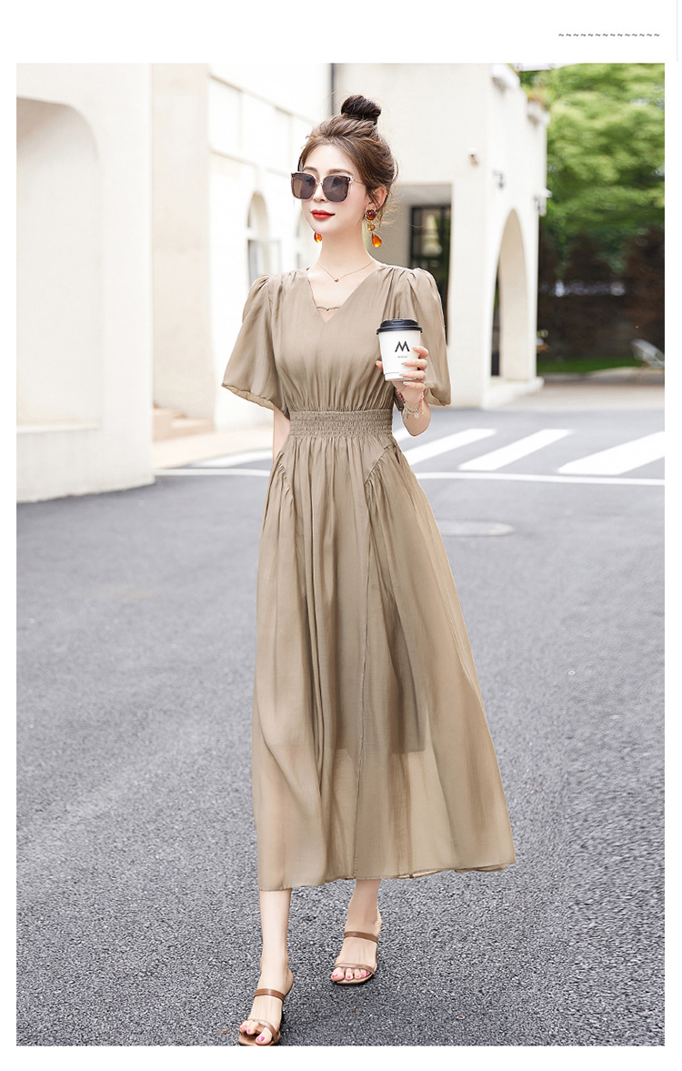 Váy dài thiết kế cổ chữ V tôn dáng, tay điểm nơ nhẹ nhàng. Phần eo được may dạng thun co giãn, ôn hờn và tạo điểm nhấn. Vải dày dặn, chiếc váy có độ xòe đẹp, dáng dài thướt tha phù hợp nhiều dịp. Dễ dàng phối cùng giày dép và phụ kiện. Mặc vào là đẹp, thích hợp cho những ngày hè mát mẻ. | Tên sản phẩm: Váy Đầm Liền Thân Nữ Cổ Chữ V Hàng Mùa Hè Phong Cách Hàn Quốc - Thời Trang Nữ | Mã sản phẩm: K3741 - Giá: 1.390.000đ | Mã nhà sản xuất: HADG-G04Hình ảnh sản phẩm