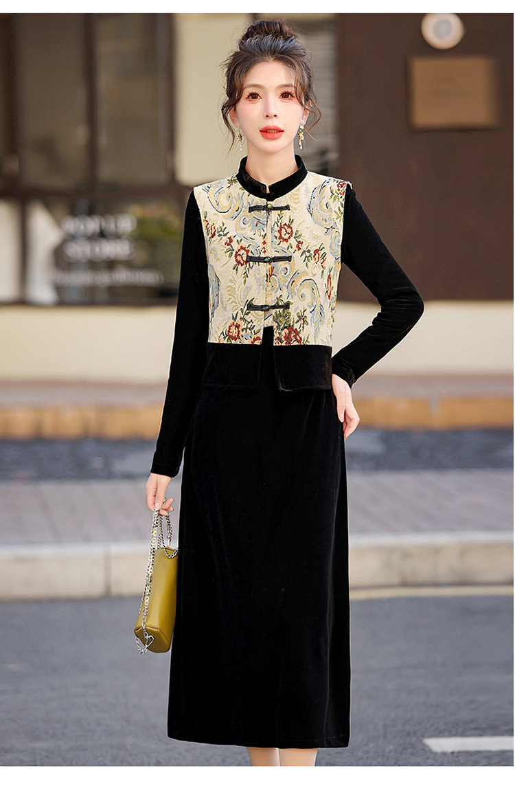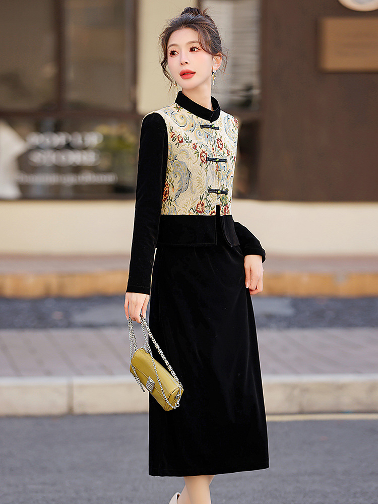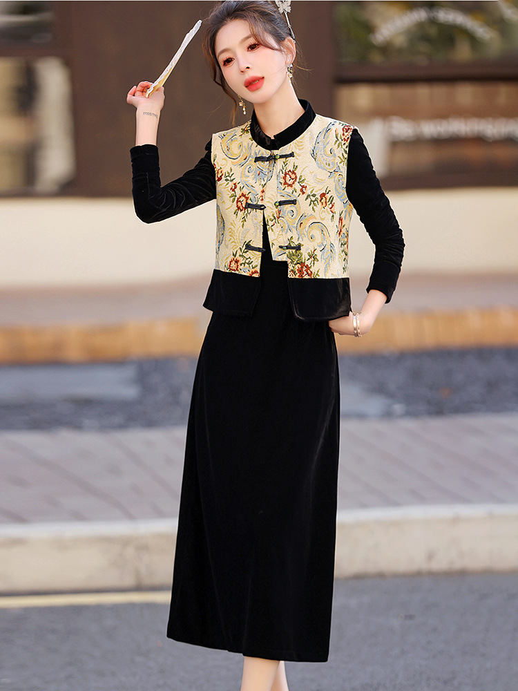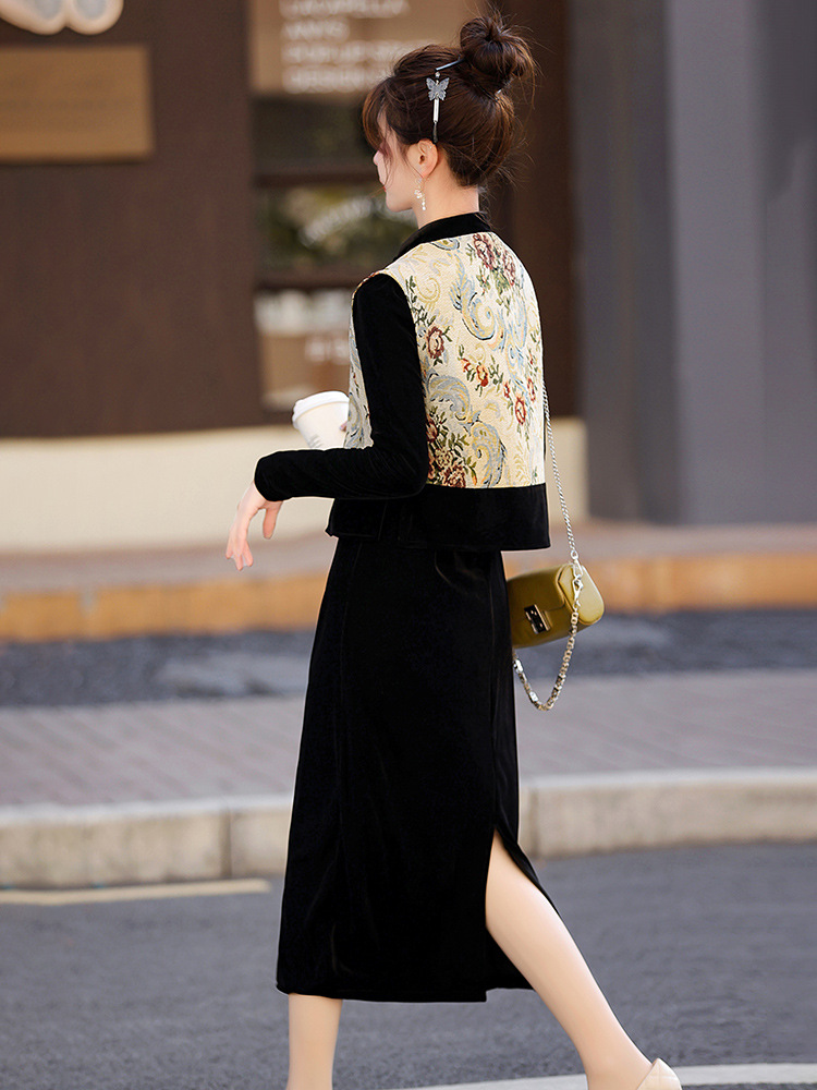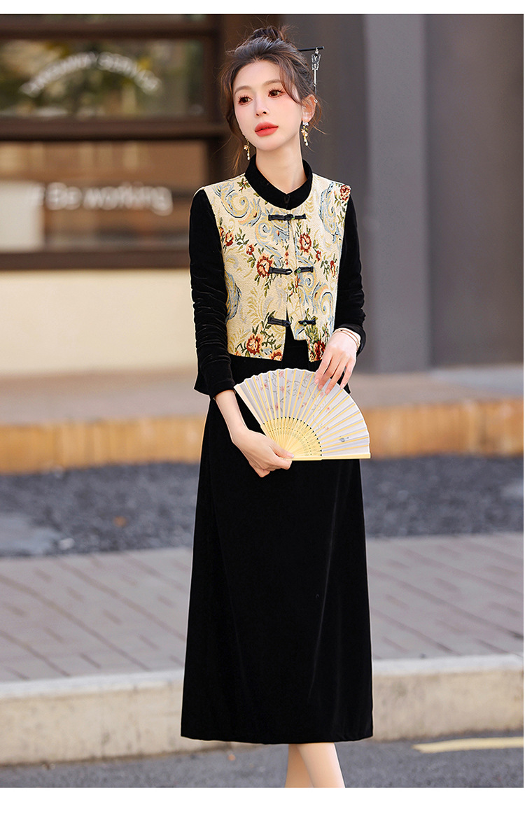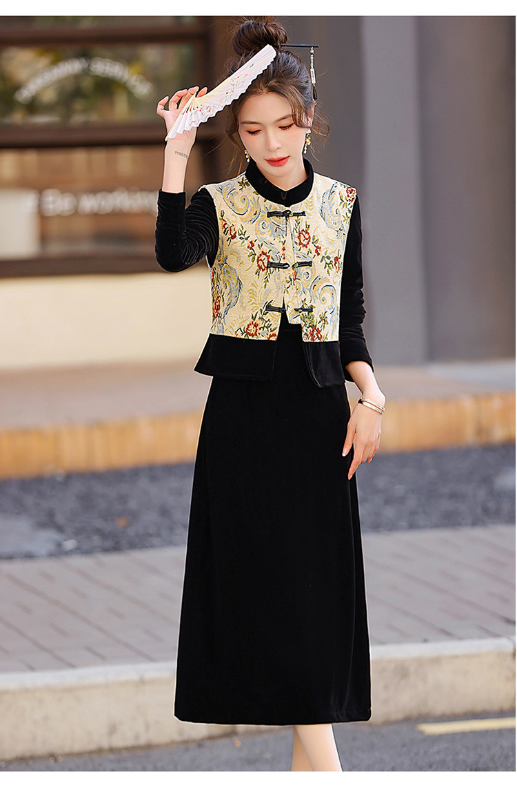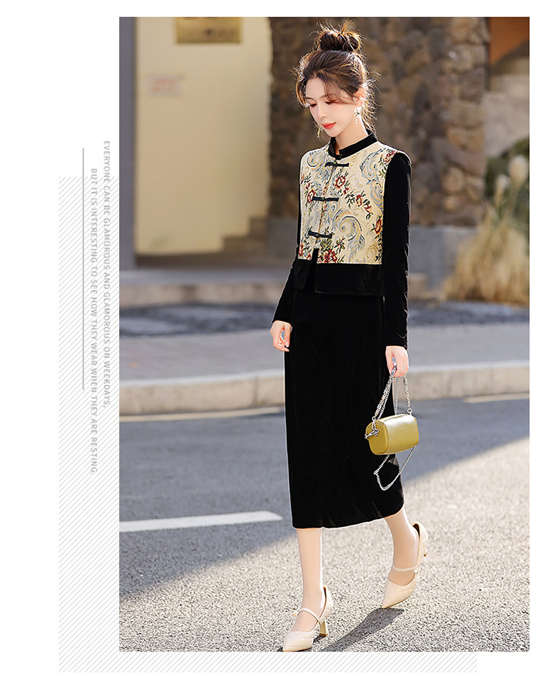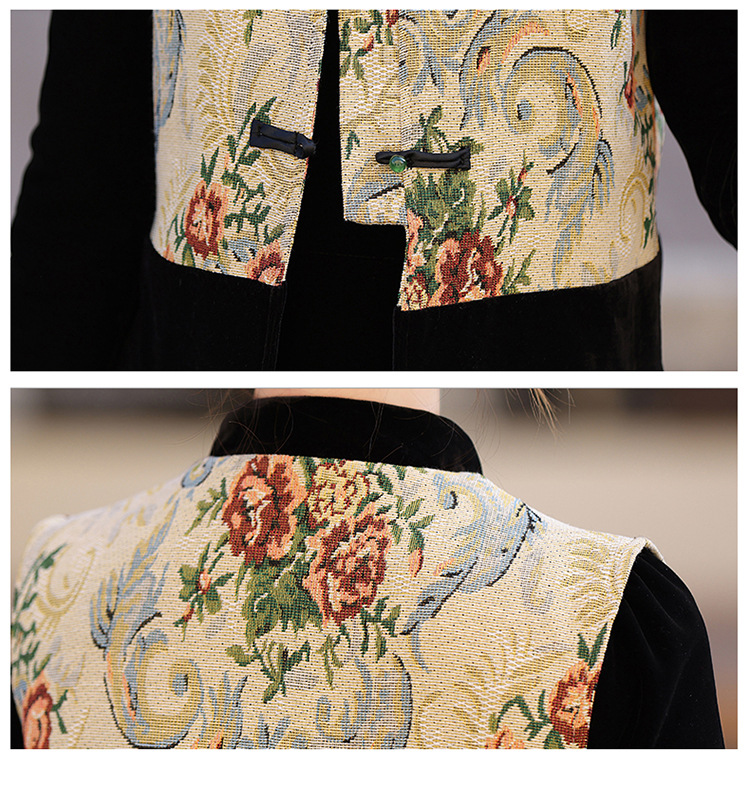 Bộ trang phục hai mảnh này gồm áo vét không tay và đầm dài, mang nét đẹp xưa pha lẫn hiện đại. Chất vải dệt hoa văn tinh tế tạo điểm nhấn ấn tượng. Áo vét mặc bên ngoài, kết hợp cùng đầm suông dáng dài thướt tha bên trong, tạo nên set đồ chỉn chu. Kiểu dáng phù hợp cho nhiều dịp đi làm hoặc dạo phố. Cách phối đồ đơn giản nhưng toát lên vẻ thanh lịch, nhẹ nhàng. | Tên sản phẩm: Váy Đầm Liền Thân Nữ Cả Bộ 2 Món Họa Tiết Hoa Hàng Mùa Xuân Thu Đông Phục Cổ Cổ Điển - Thời Trang Nữ | Mã sản phẩm: K4078 - Giá: 2.020.000đ | Mã nhà sản xuất: HADG-G05Hình ảnh sản phẩm