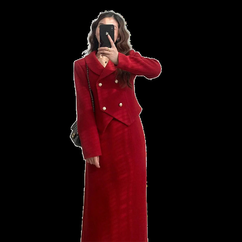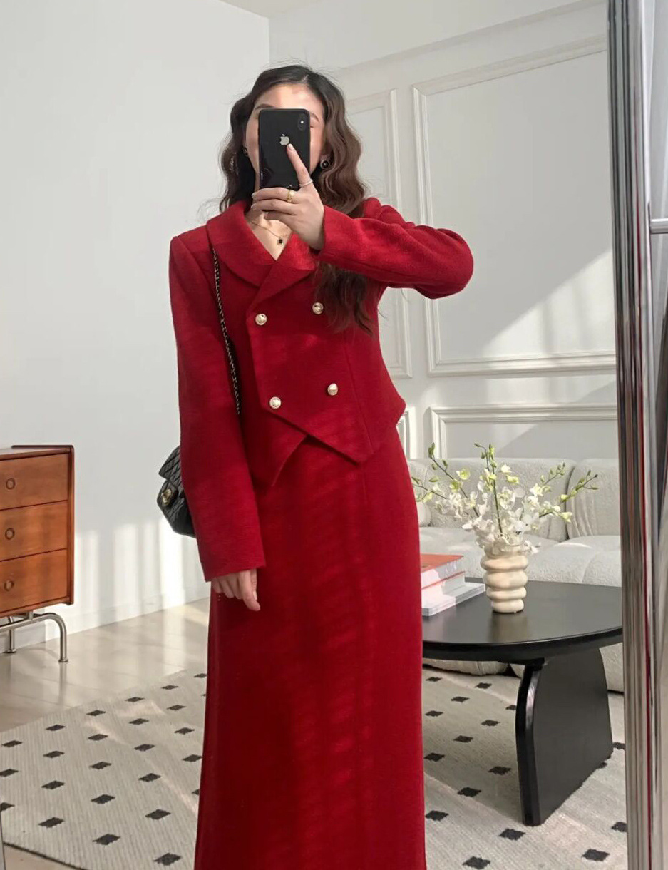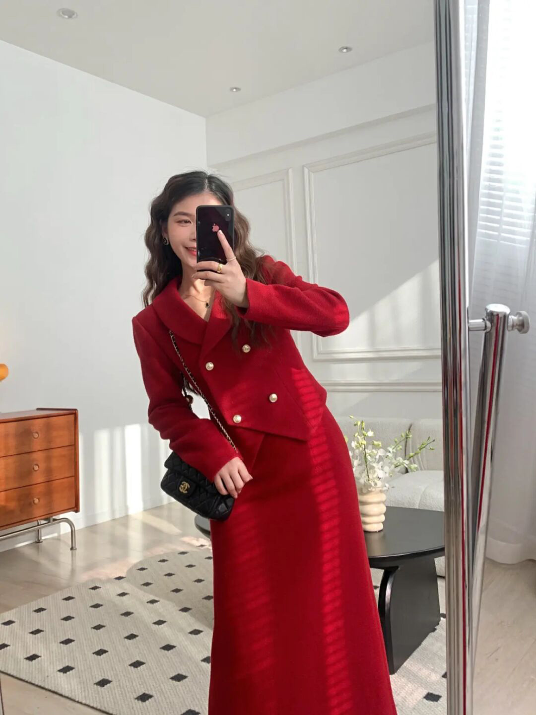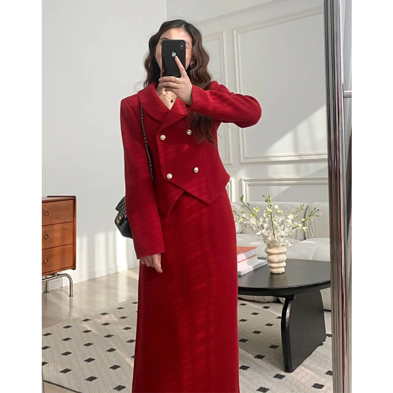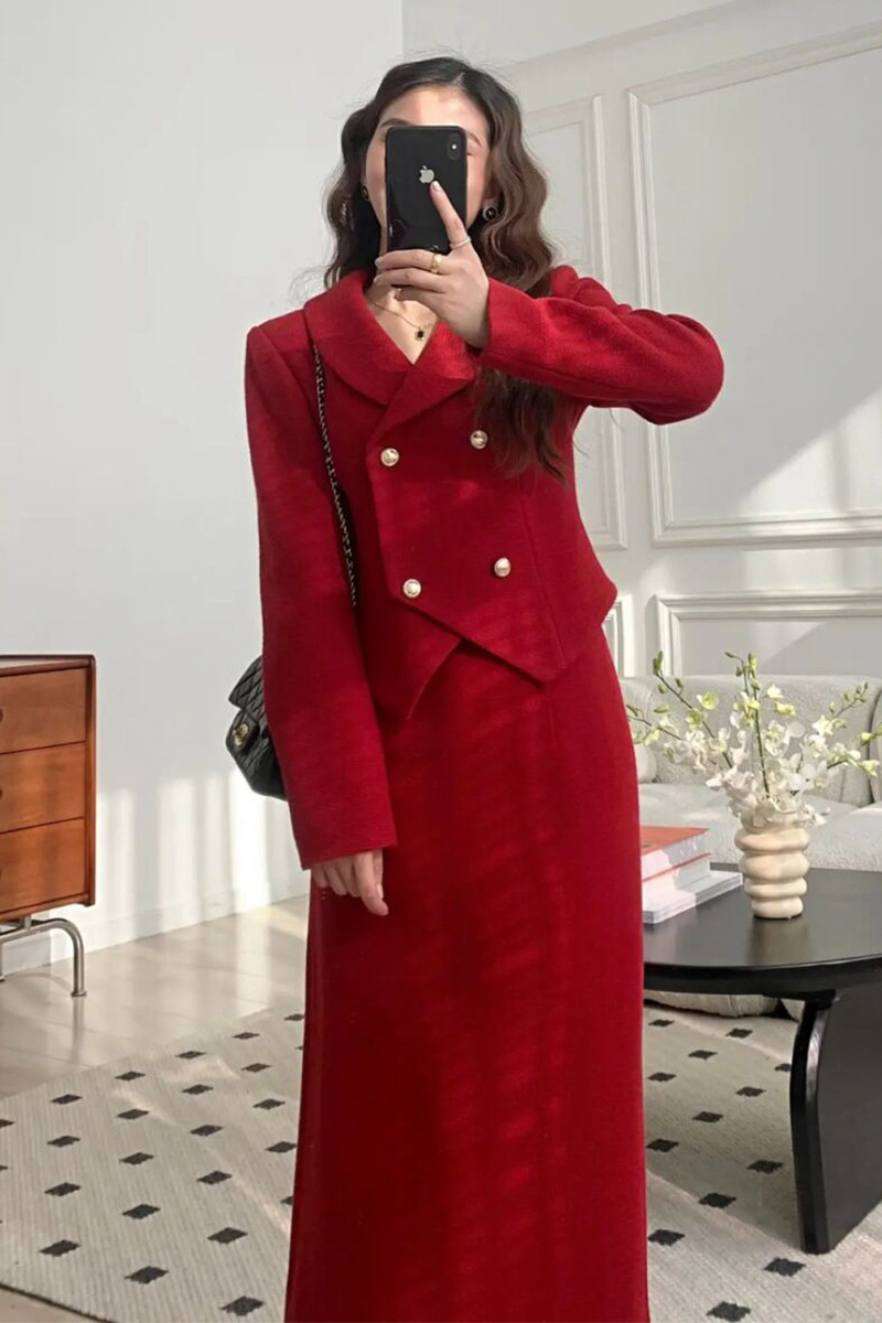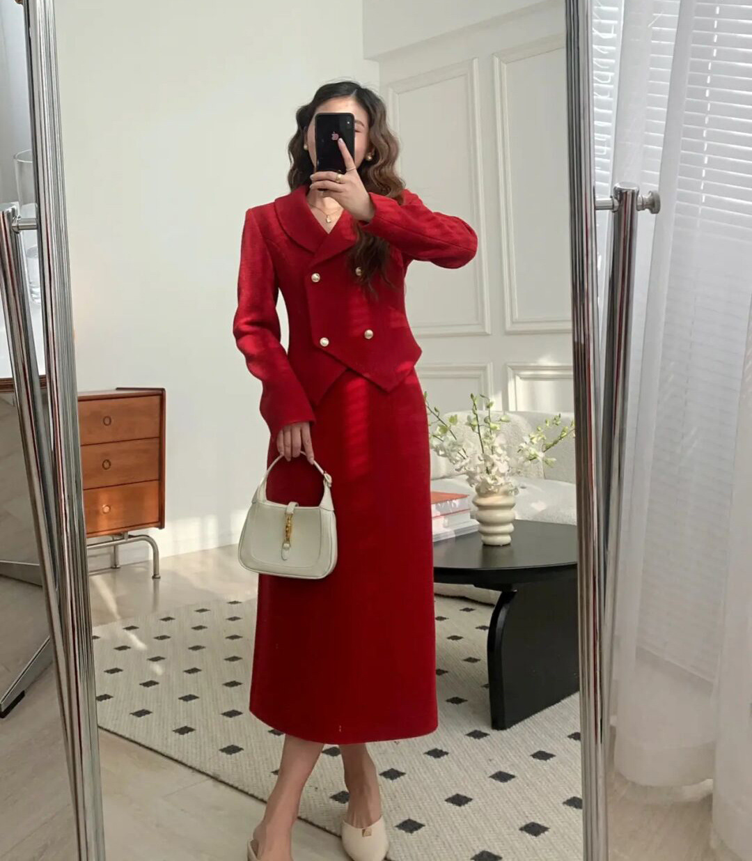Bộ trang phục hai mảnh màu đỏ thắm, mang phong cách thanh lịch, phù hợp cho tiết trời mát mẻ. Chất liệu dệt may ấm áp, tạo cảm giác dễ chịu khi mặc. Kiểu dáng kết hợp hài hòa giữa vẻ đẹp năng động và lịch sự nơi công sở. Có thể phối cùng áo sơ mi trắng bên trong và giày cao gót để hoàn thiện bộ trang phục. Sản phẩm thích hợp dùng trong nhiều hoàn cảnh khác nhau, từ đi làm đến các buổi gặp mặt. | Tên sản phẩm: Đồ Bộ Nữ Cả Bộ 2 Món Hàng Mùa Xuân Thu Đông Đồ Công Sở - Thời Trang Nữ | Mã sản phẩm: K4942 - Giá: 1.730.000đ | Mã nhà sản xuất: DODAP-G05Hình ảnh sản phẩm