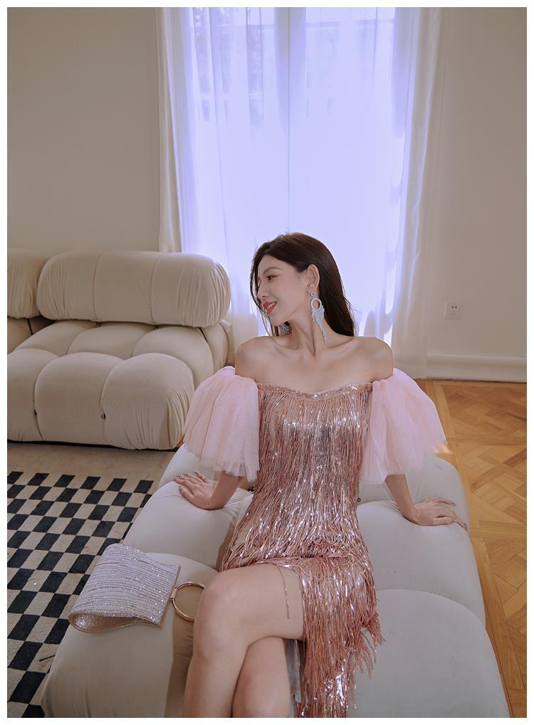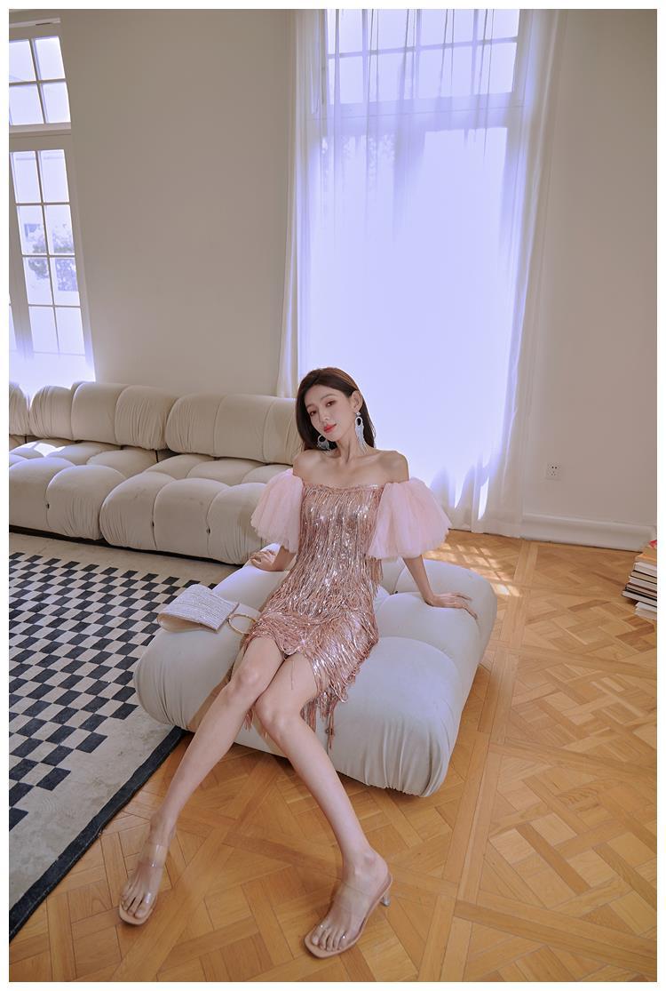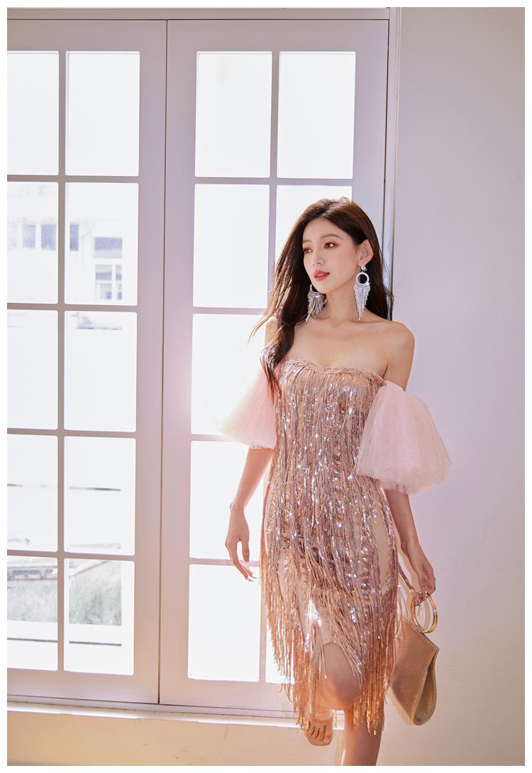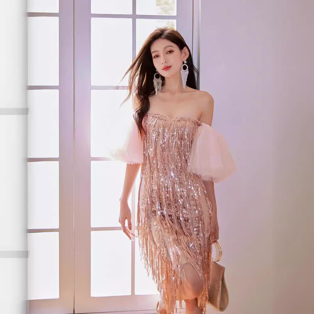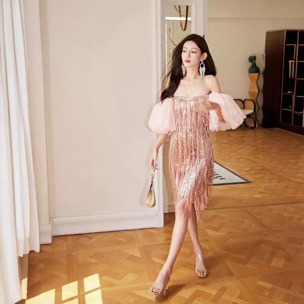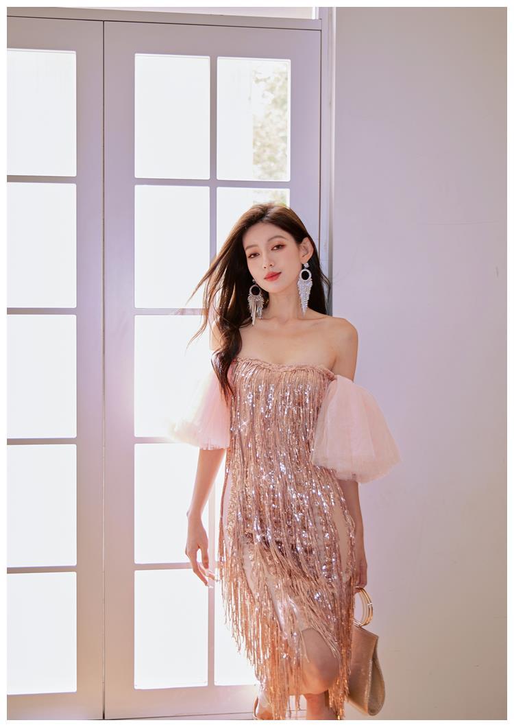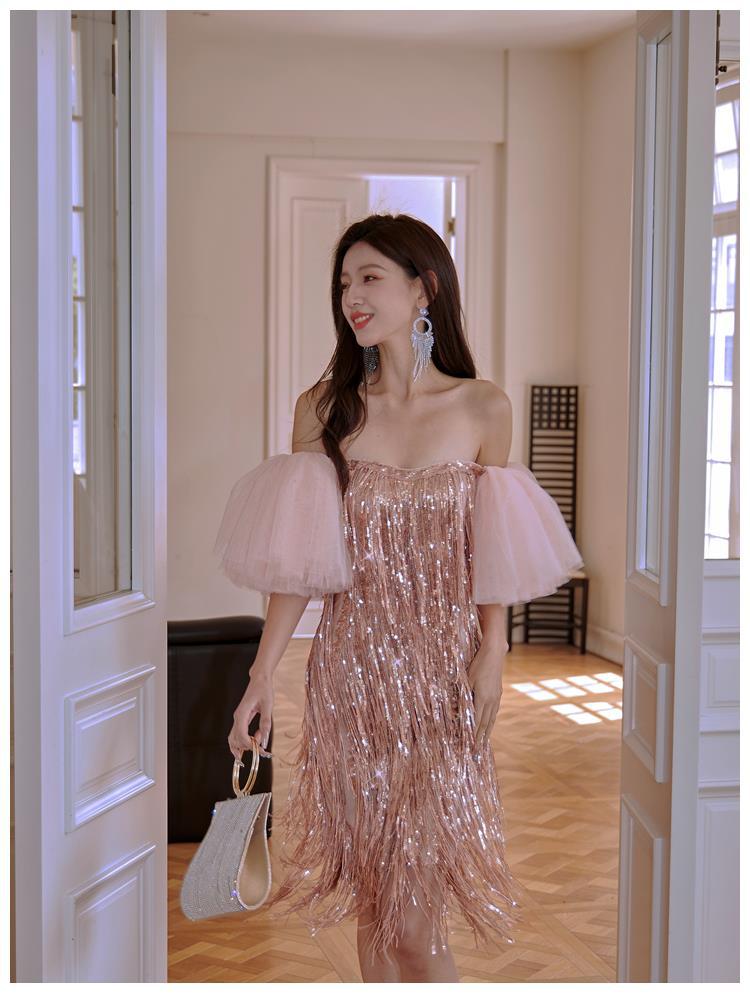Đầm dự tiệc với thiết kế cổ ngực trần, tay phồng cách điệu tạo điểm nhấn nổi bật. Điểm cộng hoàn hảo là những sợi tua rua lấp lánh phản chiếu ánh sáng, tựa như ánh sao đêm, giúp bạn tỏa sáng trong các buổi tiệc sinh nhật hay sự kiện. Mặc cùng giày cao gót và phụ kiện tôn dáng để có vẻ ngoài ấn tượng và duyên dáng. | Tên sản phẩm: Váy Đầm Liền Thân Nữ Tay Phồng - Thời Trang Nữ | Mã sản phẩm: K6396 - Giá: 2.190.000đ | Mã nhà sản xuất: LURYMI-G05Hình ảnh sản phẩm