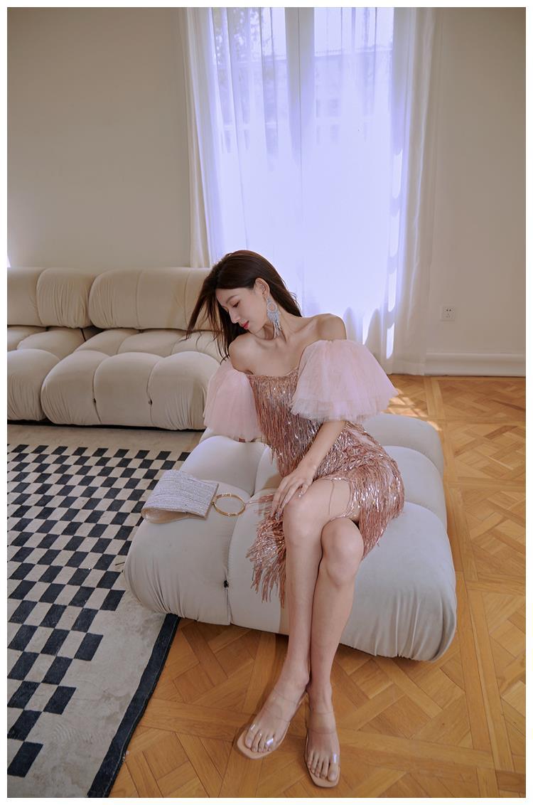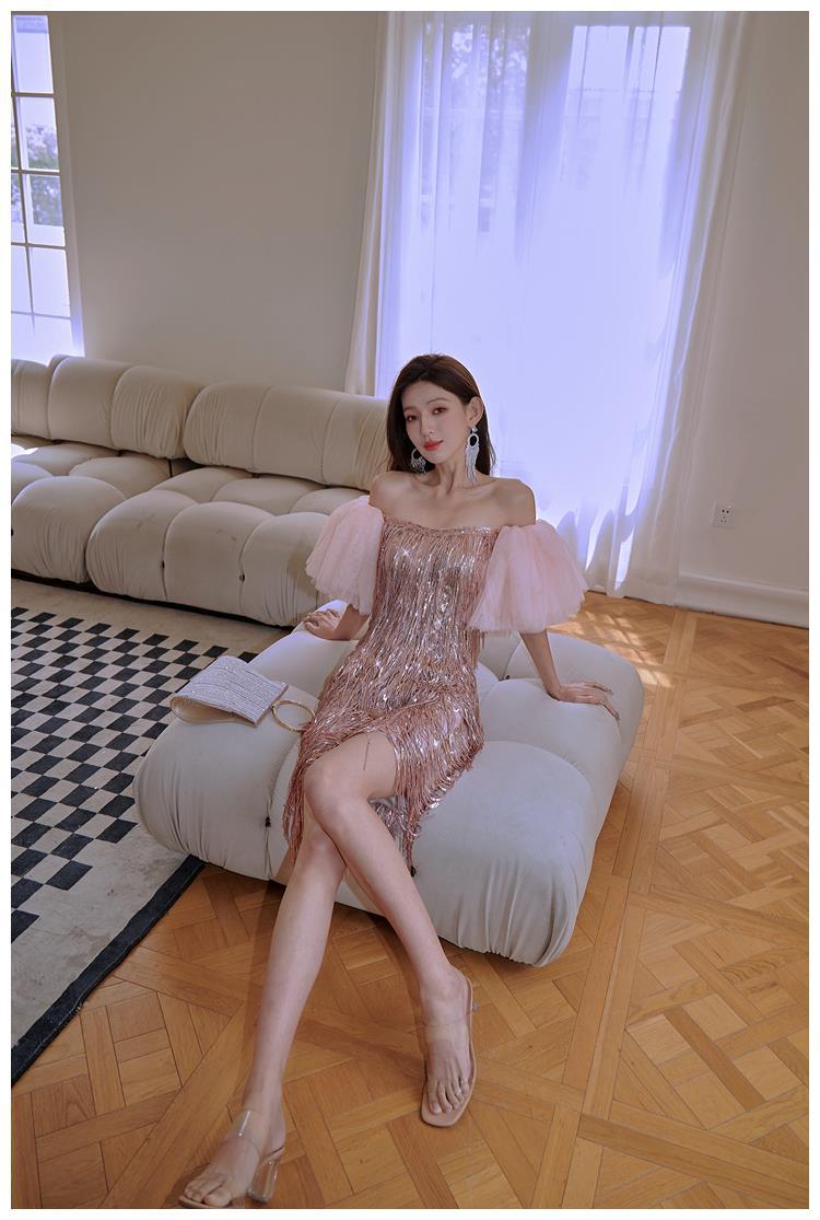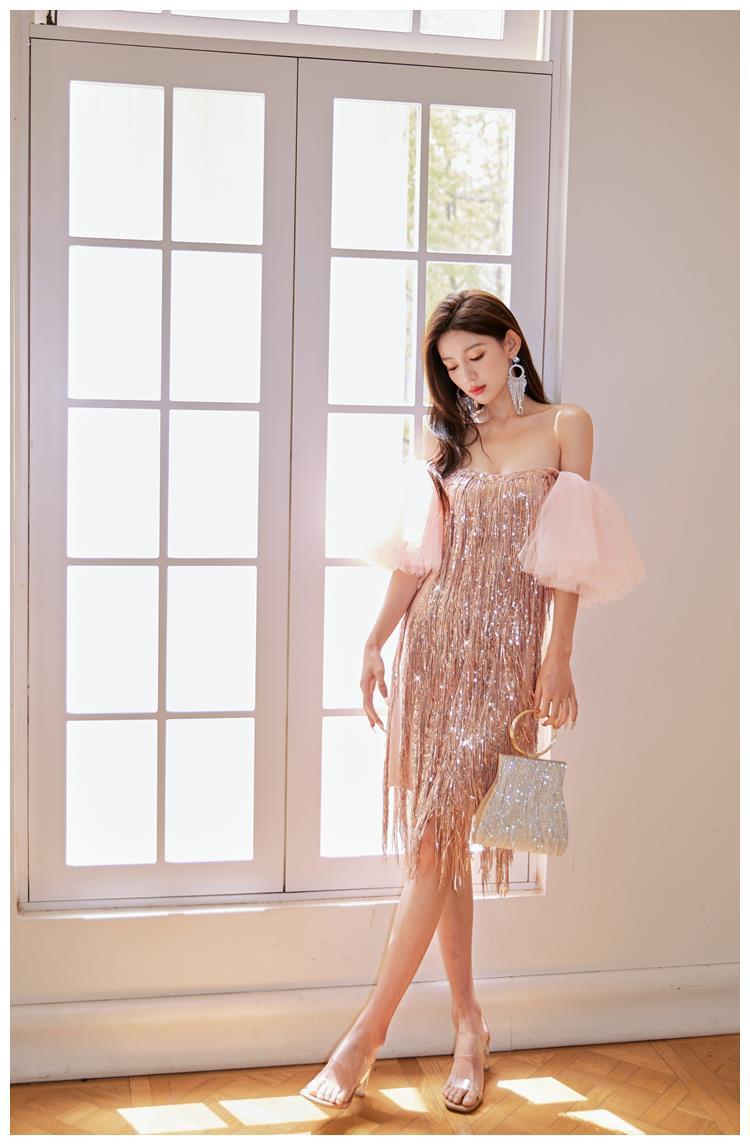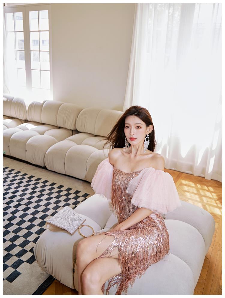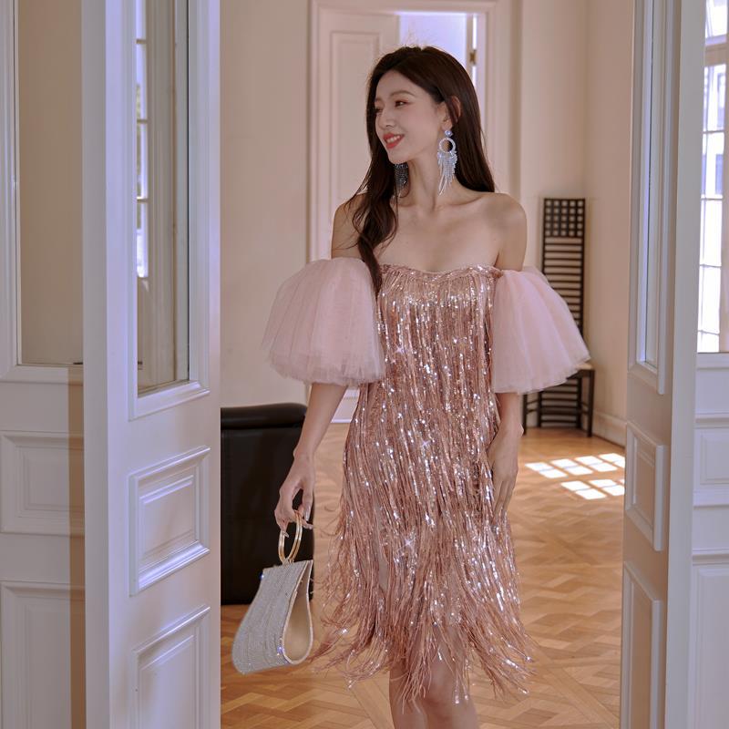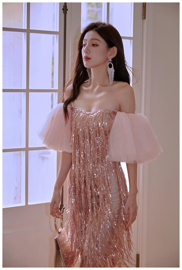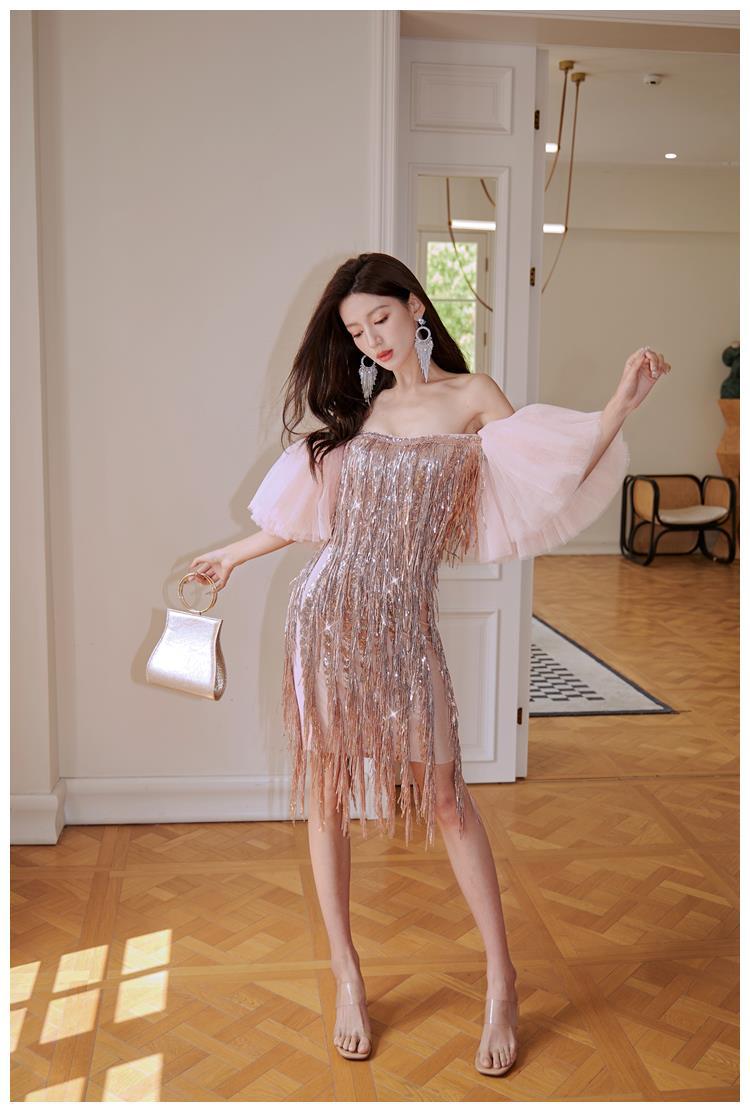 Đầm dự tiệc với thiết kế cổ ngực trần, tay phồng cách điệu tạo điểm nhấn nổi bật. Điểm cộng hoàn hảo là những sợi tua rua lấp lánh phản chiếu ánh sáng, tựa như ánh sao đêm, giúp bạn tỏa sáng trong các buổi tiệc sinh nhật hay sự kiện. Mặc cùng giày cao gót và phụ kiện tôn dáng để có vẻ ngoài ấn tượng và duyên dáng. | Tên sản phẩm: Váy Đầm Liền Thân Nữ Tay Phồng - Thời Trang Nữ | Mã sản phẩm: K6396 - Giá: 2.190.000đ | Mã nhà sản xuất: LURYMI-G05Hình ảnh sản phẩm