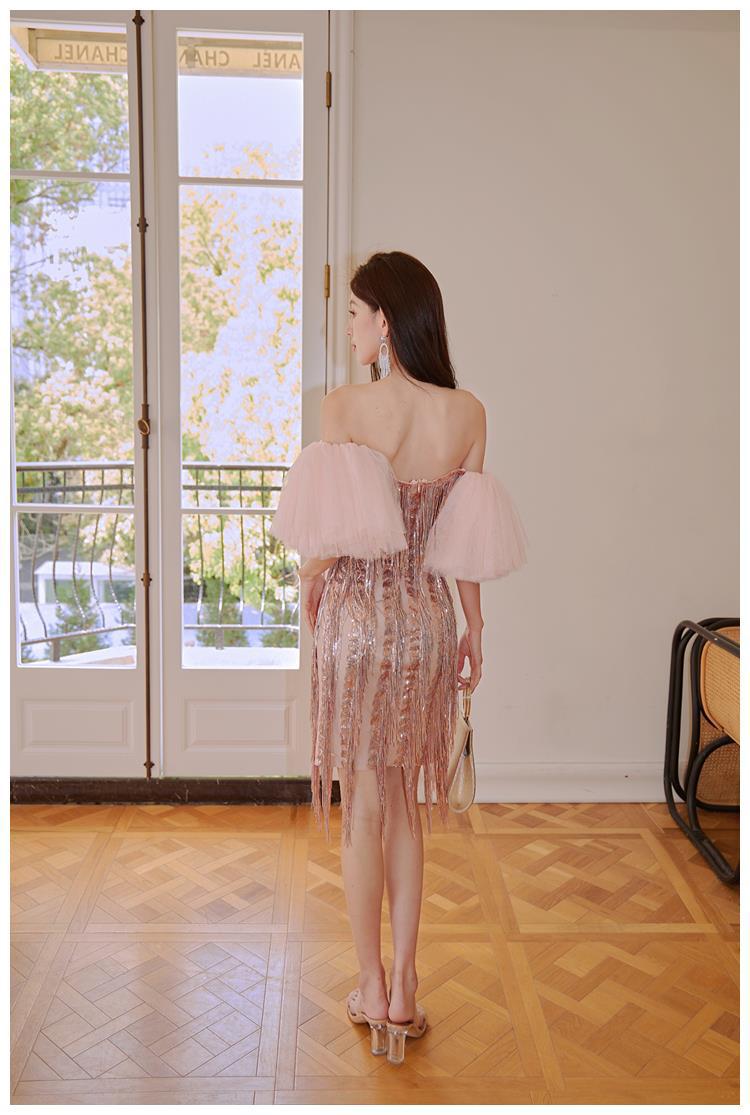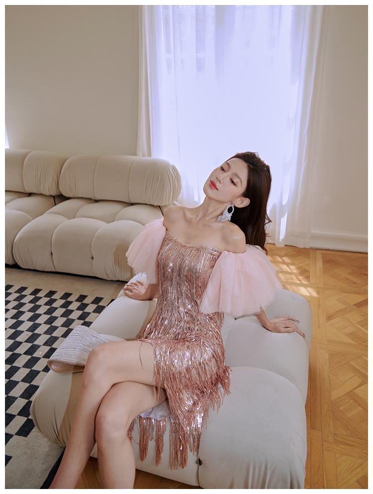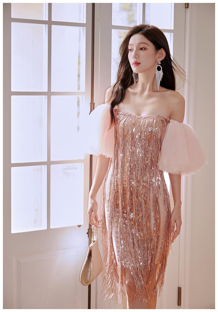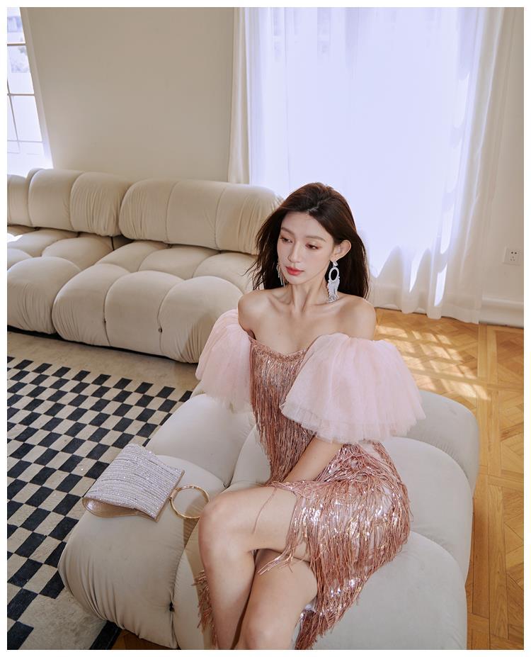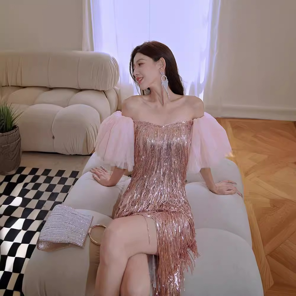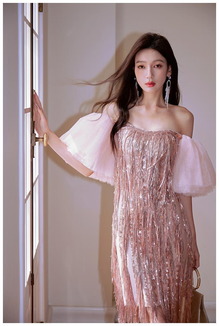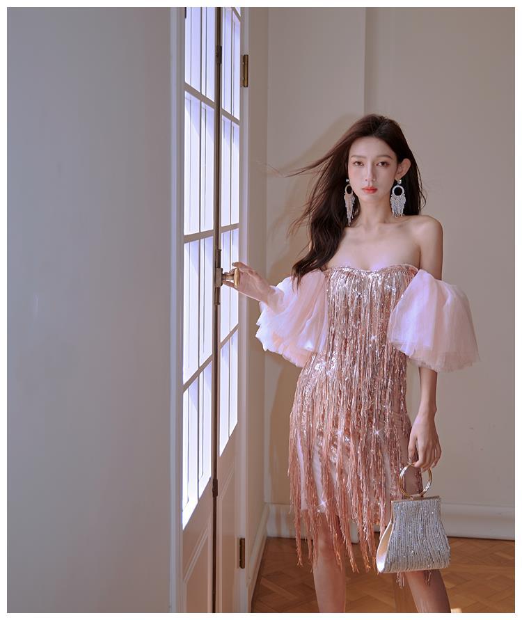 Đầm dự tiệc với thiết kế cổ ngực trần, tay phồng cách điệu tạo điểm nhấn nổi bật. Điểm cộng hoàn hảo là những sợi tua rua lấp lánh phản chiếu ánh sáng, tựa như ánh sao đêm, giúp bạn tỏa sáng trong các buổi tiệc sinh nhật hay sự kiện. Mặc cùng giày cao gót và phụ kiện tôn dáng để có vẻ ngoài ấn tượng và duyên dáng. | Tên sản phẩm: Váy Đầm Liền Thân Nữ Tay Phồng - Thời Trang Nữ | Mã sản phẩm: K6396 - Giá: 2.190.000đ | Mã nhà sản xuất: LURYMI-G05Hình ảnh sản phẩm