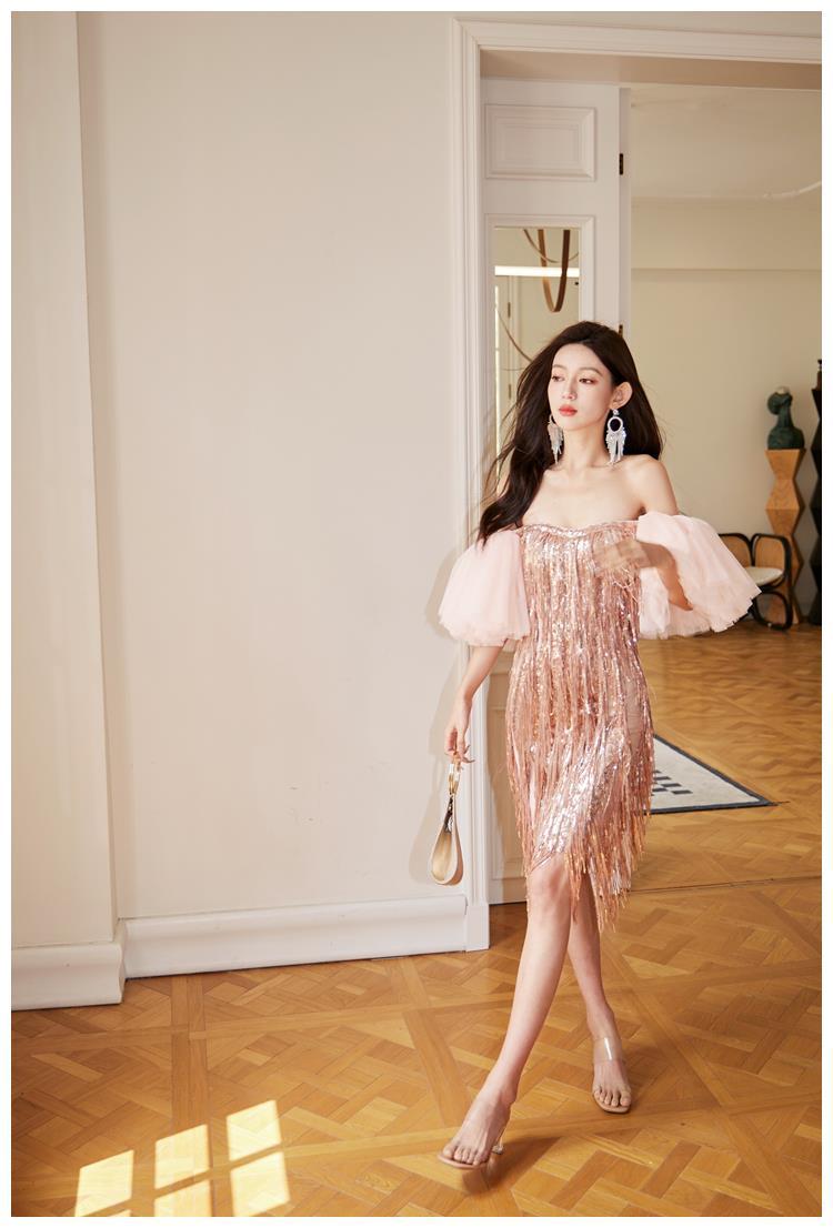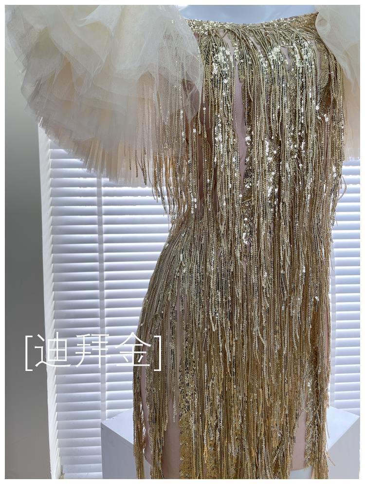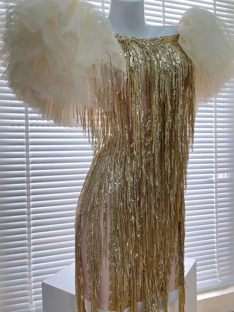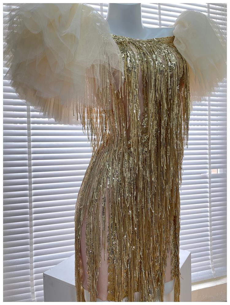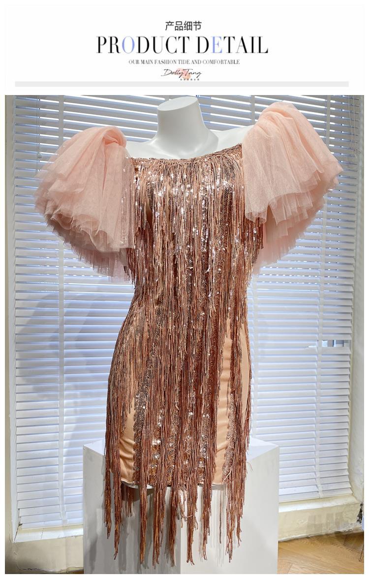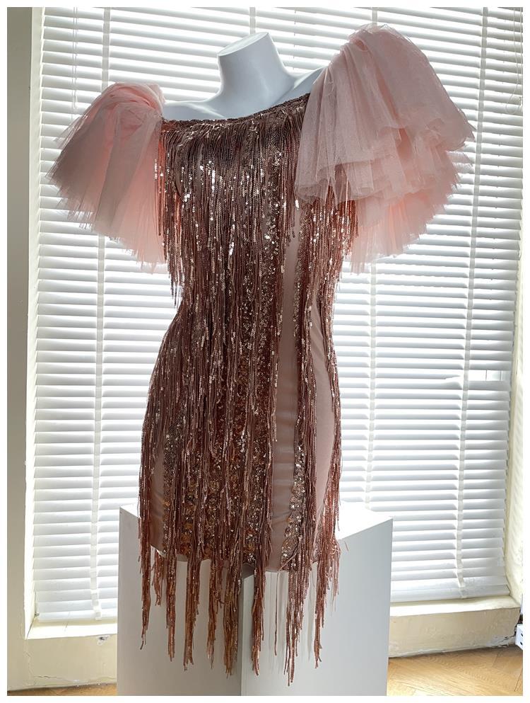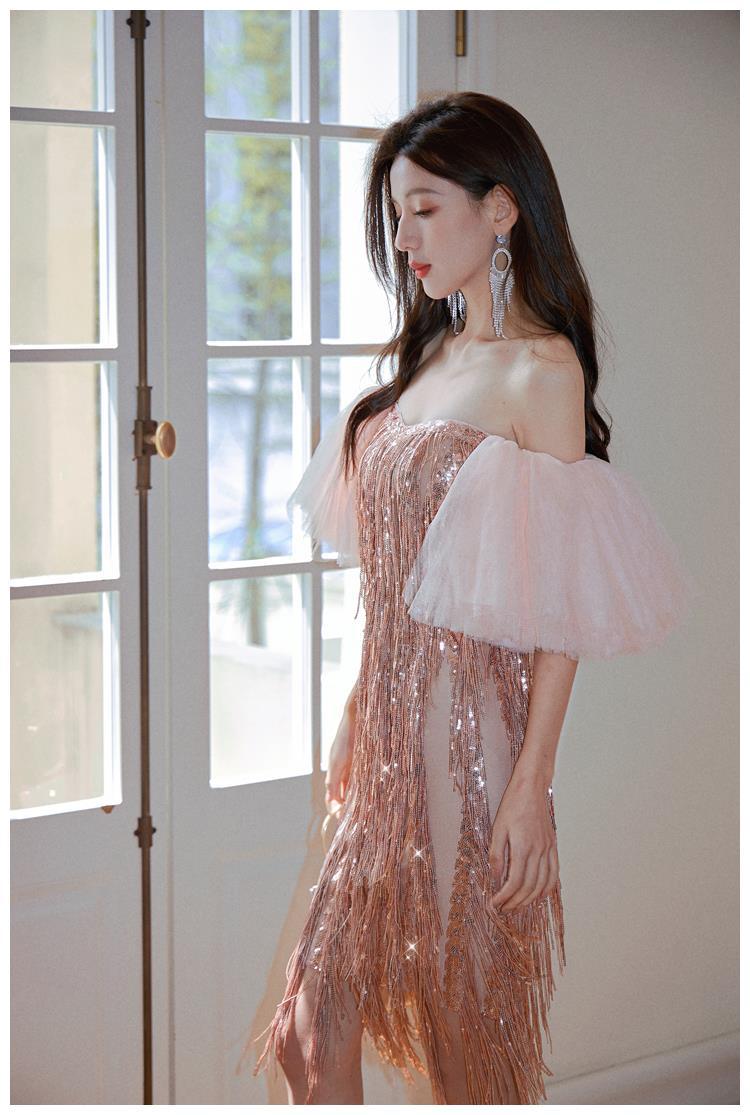 Đầm dự tiệc với thiết kế cổ ngực trần, tay phồng cách điệu tạo điểm nhấn nổi bật. Điểm cộng hoàn hảo là những sợi tua rua lấp lánh phản chiếu ánh sáng, tựa như ánh sao đêm, giúp bạn tỏa sáng trong các buổi tiệc sinh nhật hay sự kiện. Mặc cùng giày cao gót và phụ kiện tôn dáng để có vẻ ngoài ấn tượng và duyên dáng. | Tên sản phẩm: Váy Đầm Liền Thân Nữ Tay Phồng - Thời Trang Nữ | Mã sản phẩm: K6396 - Giá: 2.190.000đ | Mã nhà sản xuất: LURYMI-G05Hình ảnh sản phẩm