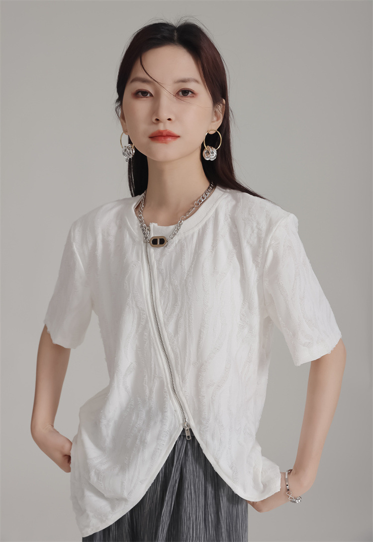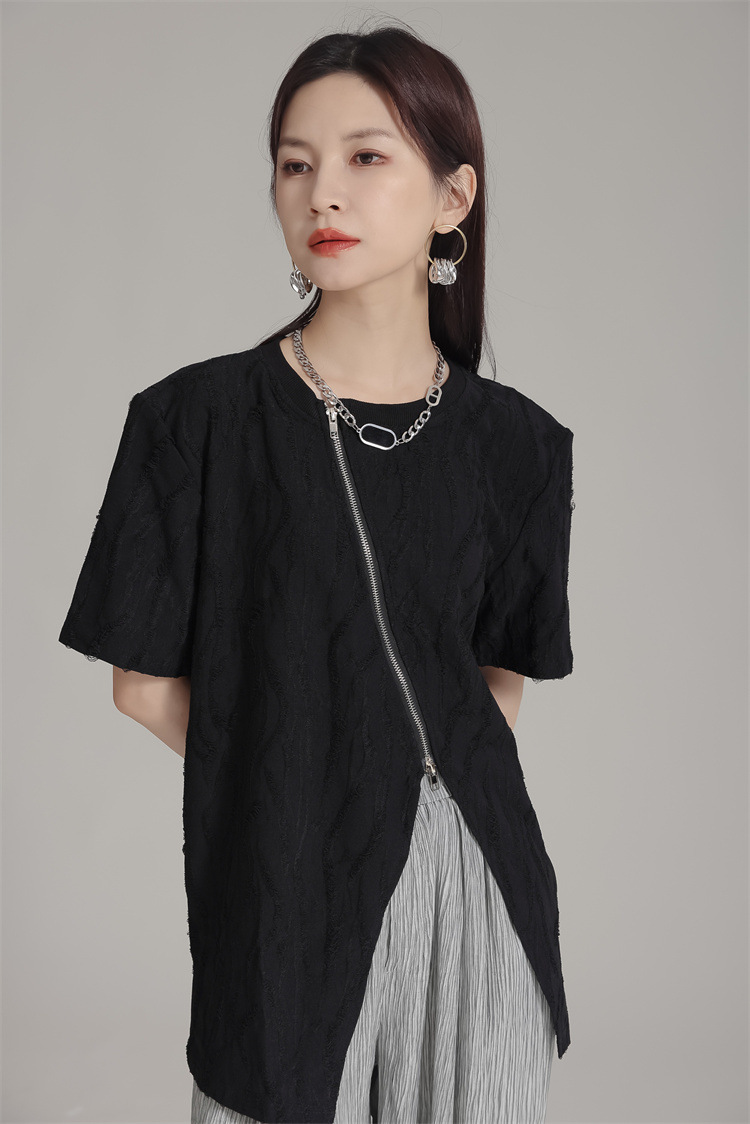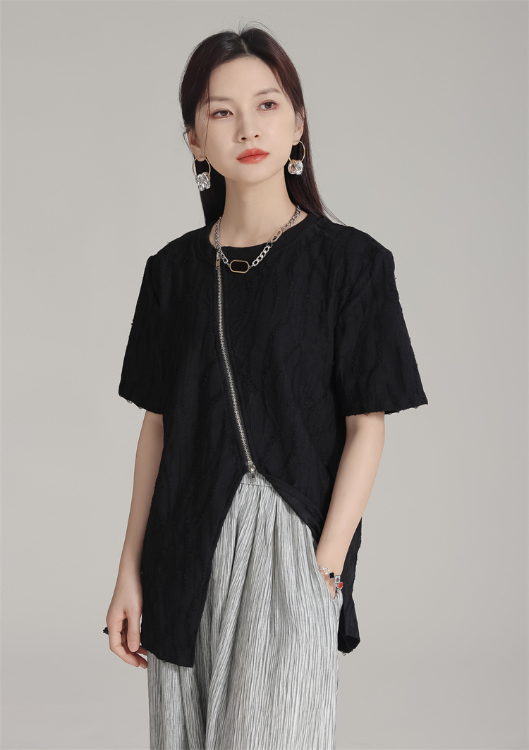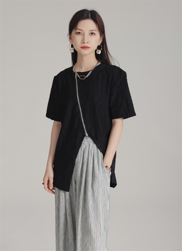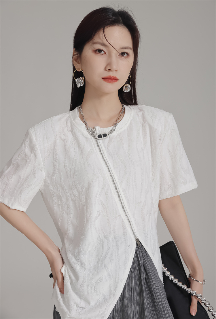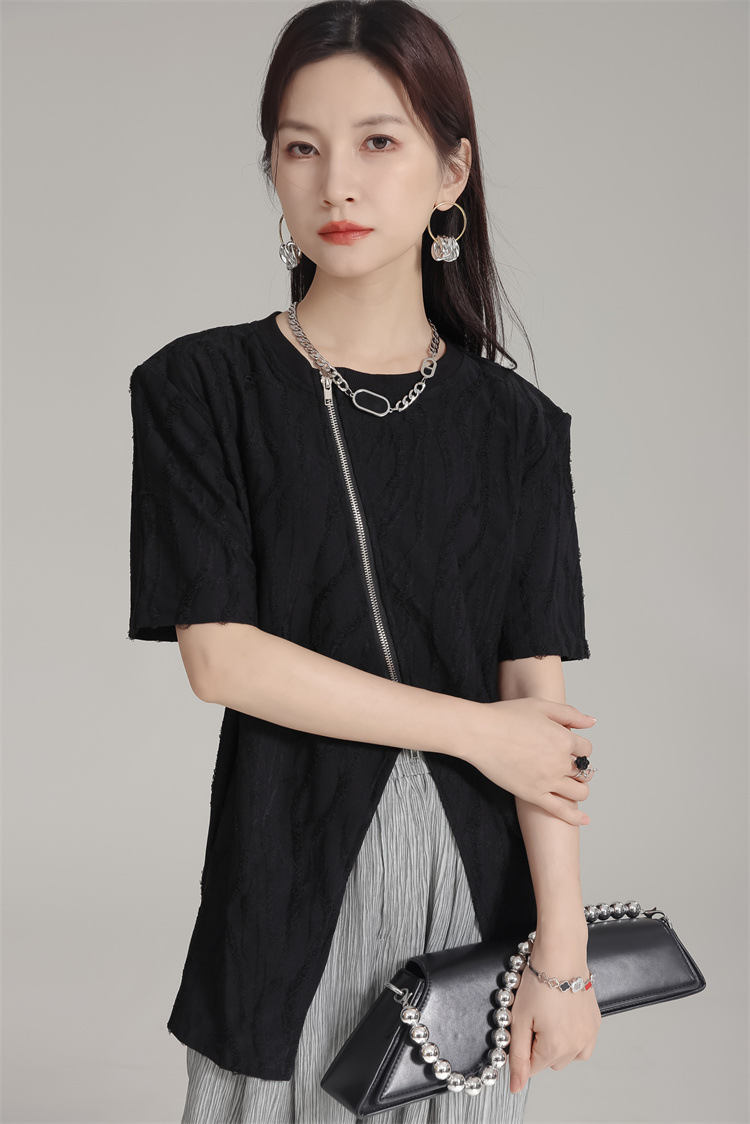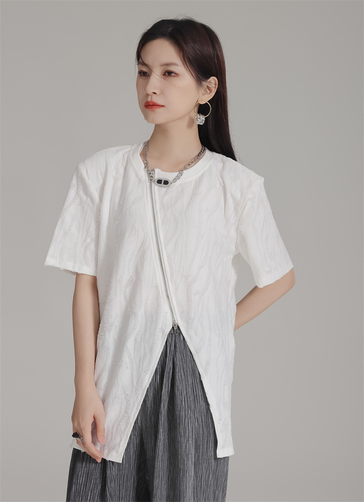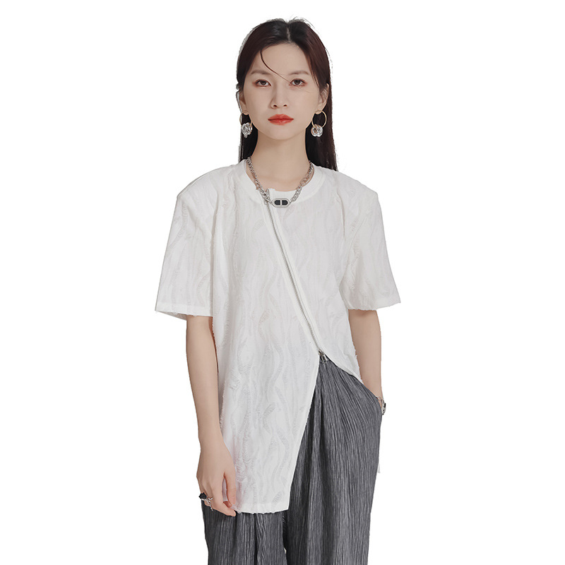 Áo ngắn tay nữ với thiết kế đường kéo mở phía dưới tạo điểm nhấn độc đáo. Chất vải mềm mại, form dáng rộng rãi thoải mái, phù hợp cho mùa hè. Kiểu áo có đường cắt xẻ kèm họa tiết sóng uốn lượn không đều, mang đến vẻ ngoại hình trẻ trung, năng động. Dễ dàng phối cùng quần shorts hoặc chân váy để tạo nên những bộ trang phục hàng ngày. | Tên sản phẩm: Áo Thun Nữ Ngắn Tay Hàng Mùa Hè - Thời Trang Nữ | Mã sản phẩm: K6585 - Giá: 880.000đ | Mã nhà sản xuất: GUDOR-G03Hình ảnh sản phẩm