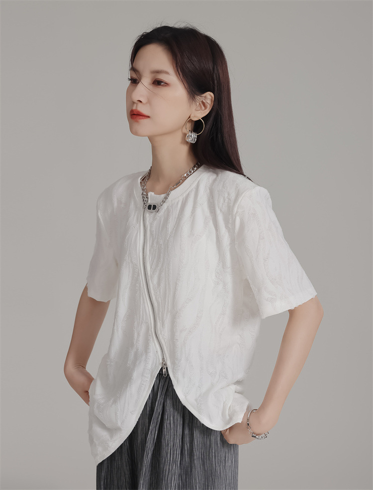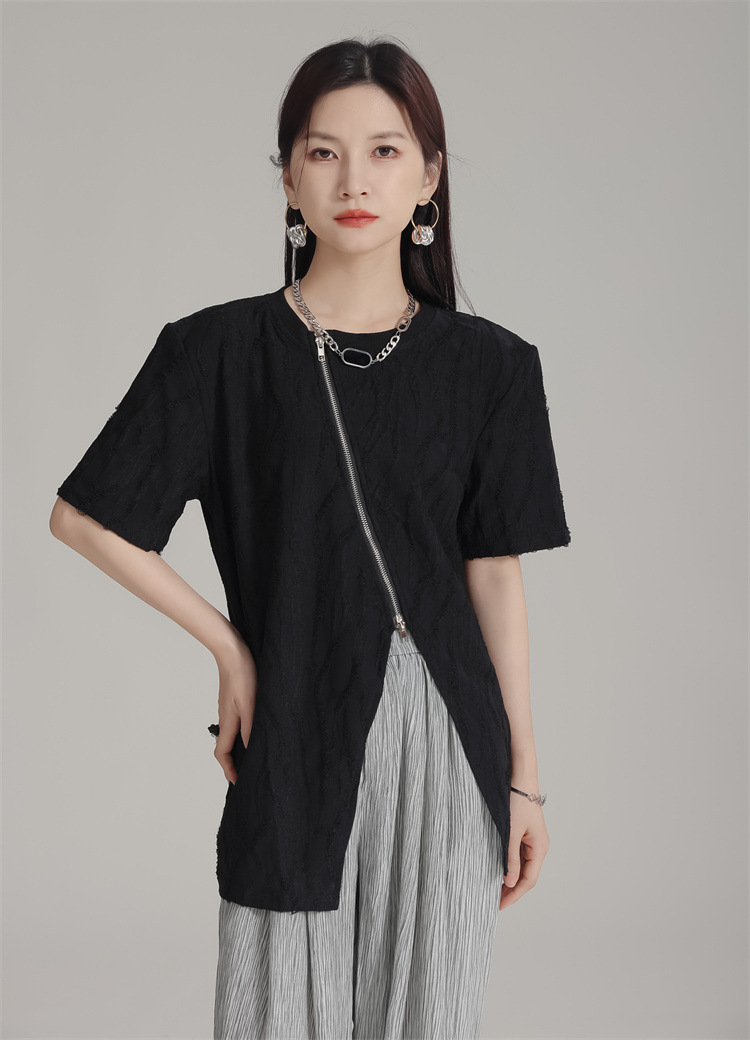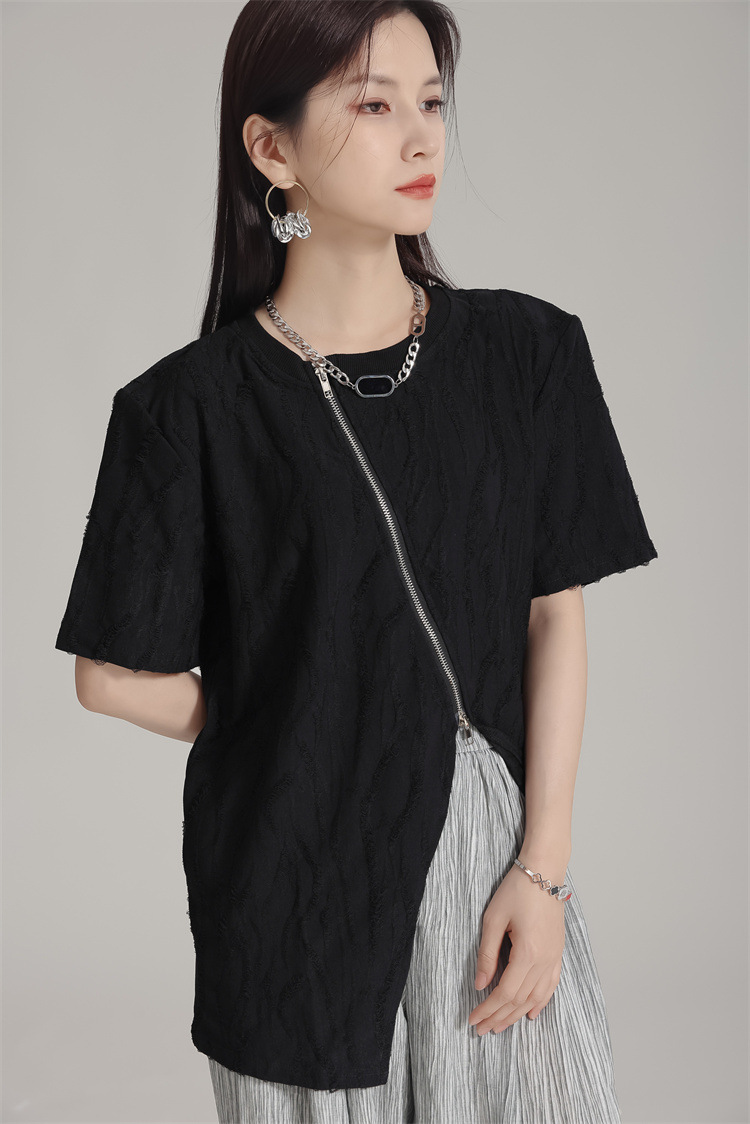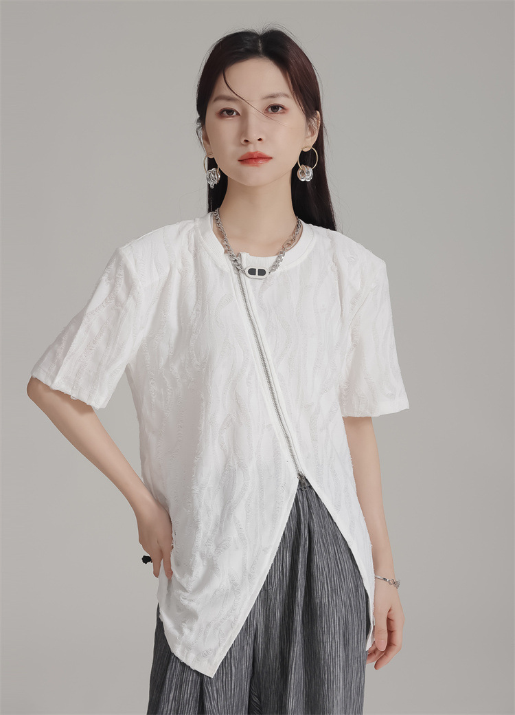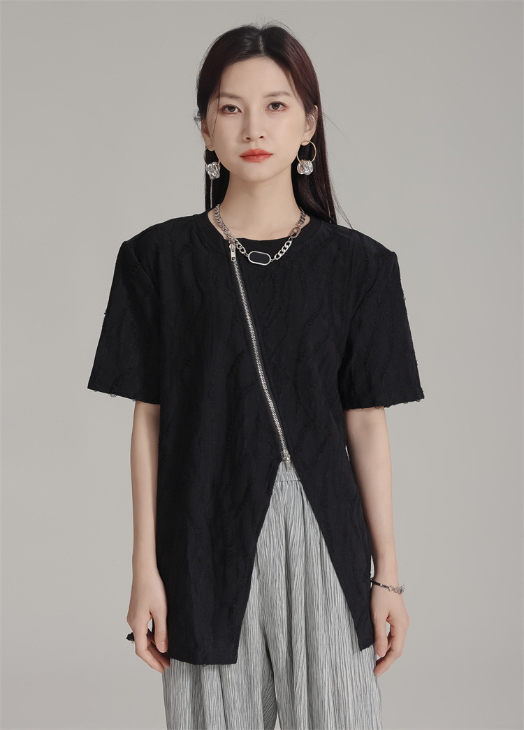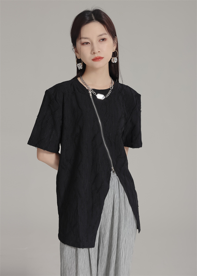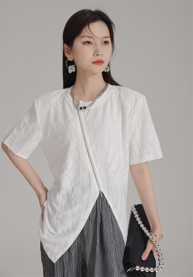 Áo ngắn tay nữ với thiết kế đường kéo mở phía dưới tạo điểm nhấn độc đáo. Chất vải mềm mại, form dáng rộng rãi thoải mái, phù hợp cho mùa hè. Kiểu áo có đường cắt xẻ kèm họa tiết sóng uốn lượn không đều, mang đến vẻ ngoại hình trẻ trung, năng động. Dễ dàng phối cùng quần shorts hoặc chân váy để tạo nên những bộ trang phục hàng ngày. | Tên sản phẩm: Áo Thun Nữ Ngắn Tay Hàng Mùa Hè - Thời Trang Nữ | Mã sản phẩm: K6585 - Giá: 880.000đ | Mã nhà sản xuất: GUDOR-G03Hình ảnh sản phẩm