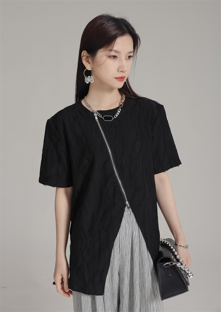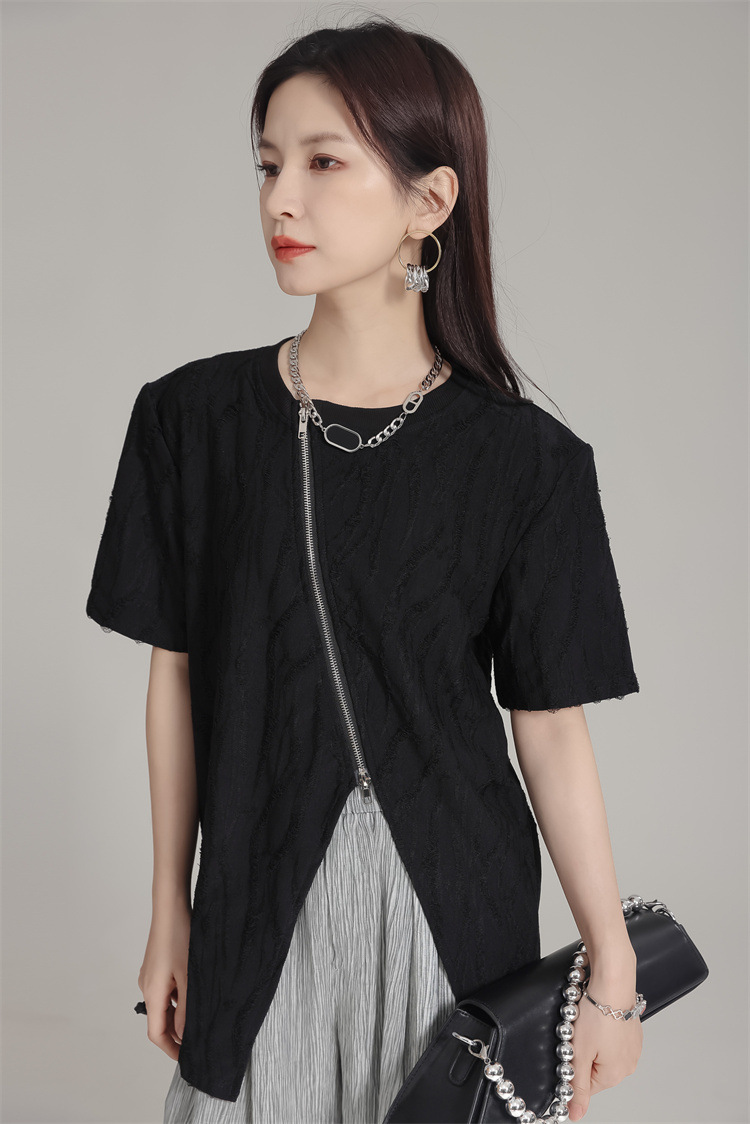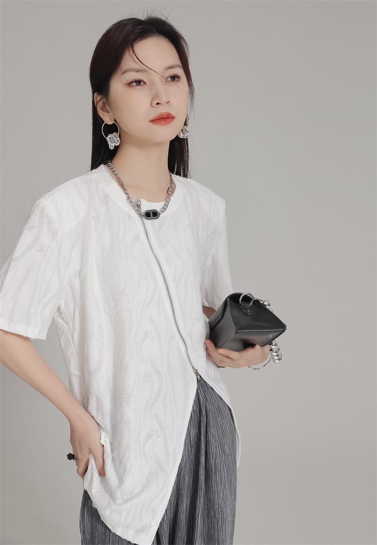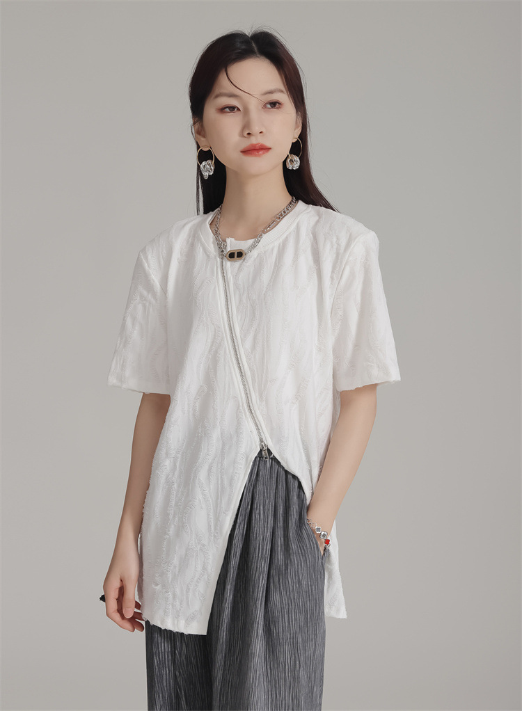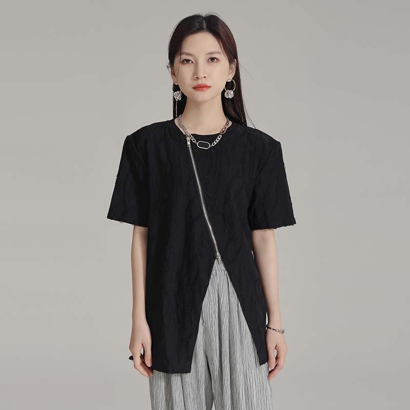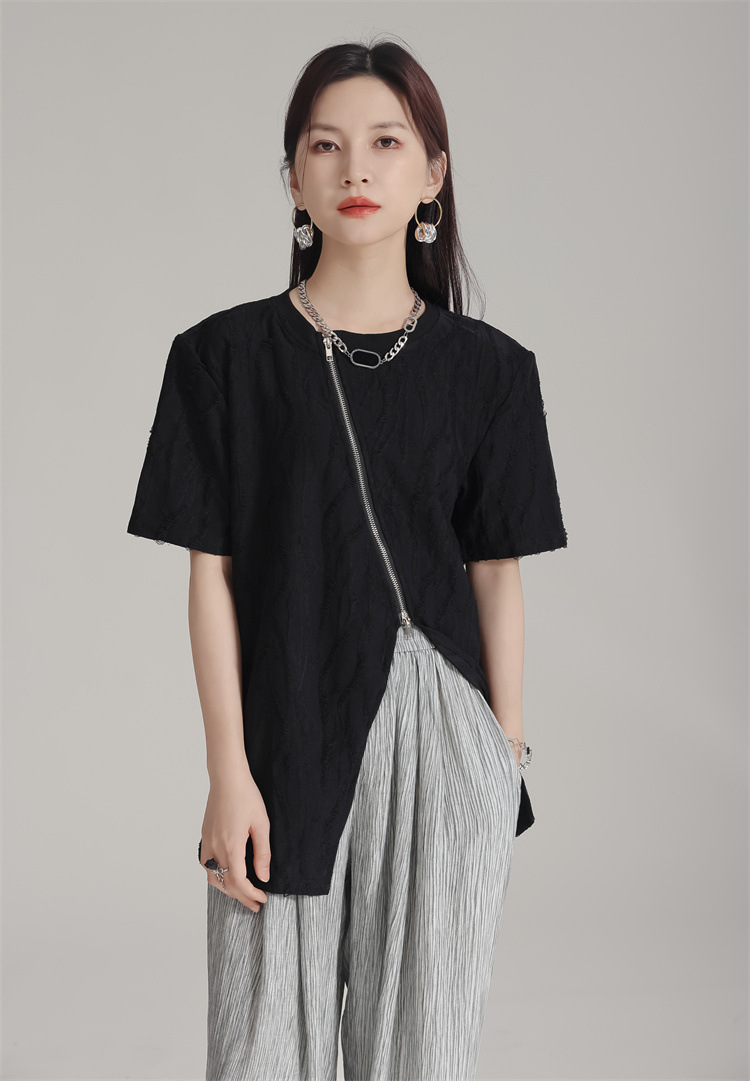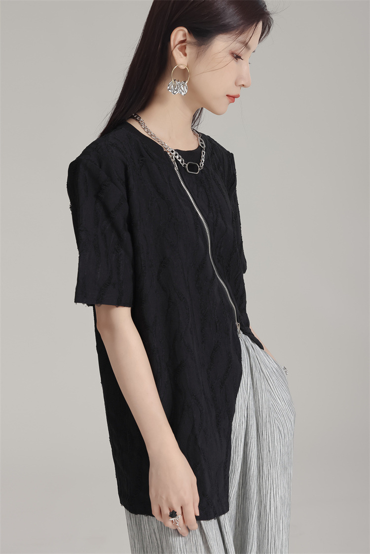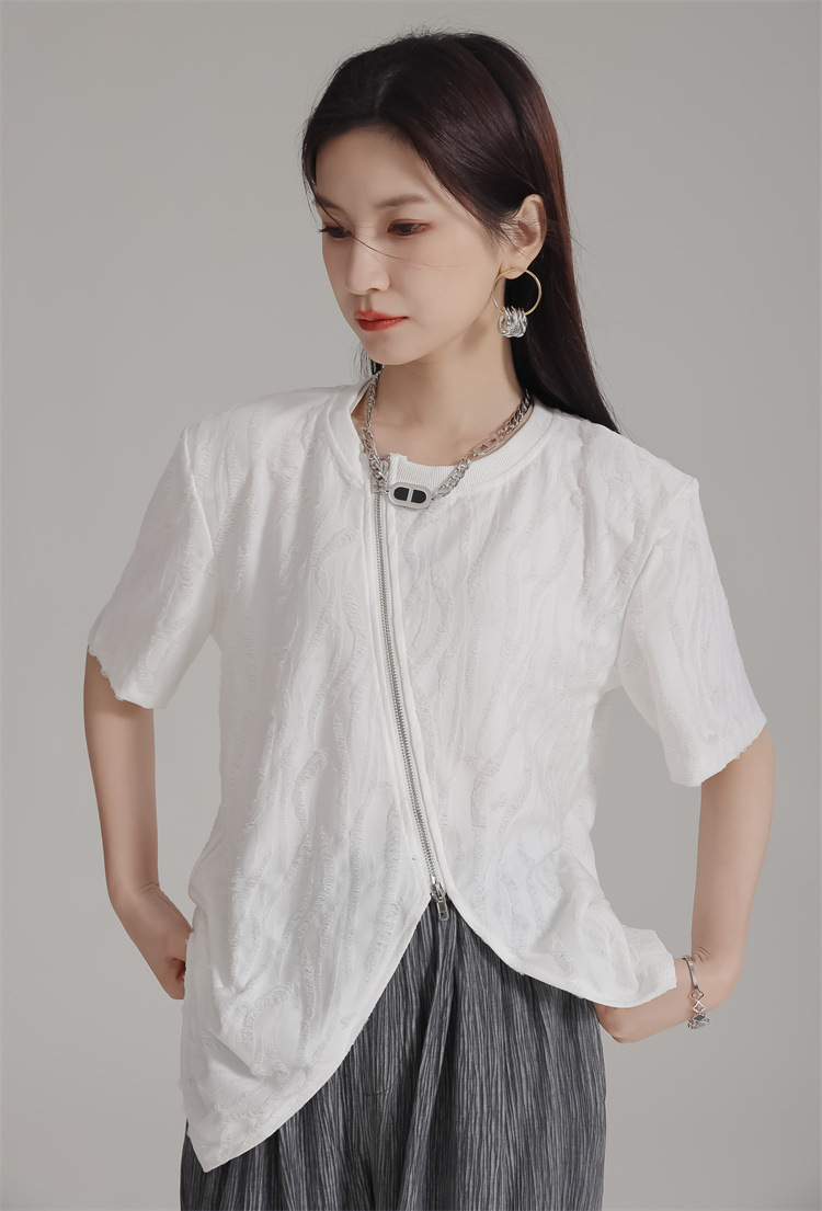 Áo ngắn tay nữ với thiết kế đường kéo mở phía dưới tạo điểm nhấn độc đáo. Chất vải mềm mại, form dáng rộng rãi thoải mái, phù hợp cho mùa hè. Kiểu áo có đường cắt xẻ kèm họa tiết sóng uốn lượn không đều, mang đến vẻ ngoại hình trẻ trung, năng động. Dễ dàng phối cùng quần shorts hoặc chân váy để tạo nên những bộ trang phục hàng ngày. | Tên sản phẩm: Áo Thun Nữ Ngắn Tay Hàng Mùa Hè - Thời Trang Nữ | Mã sản phẩm: K6585 - Giá: 880.000đ | Mã nhà sản xuất: GUDOR-G03Hình ảnh sản phẩm
