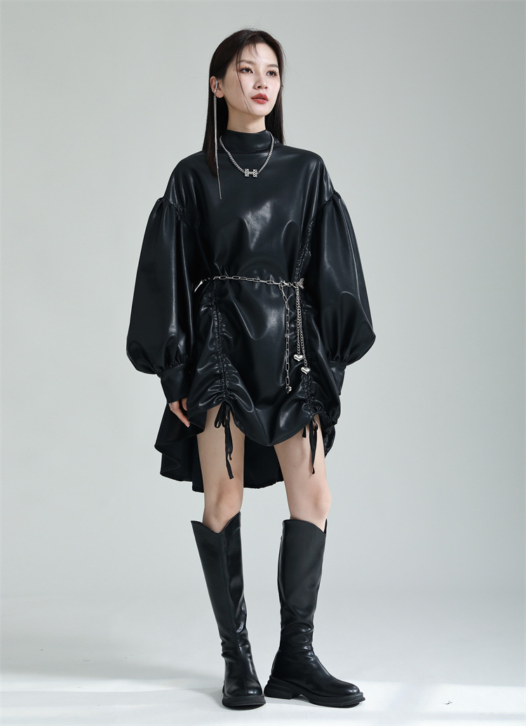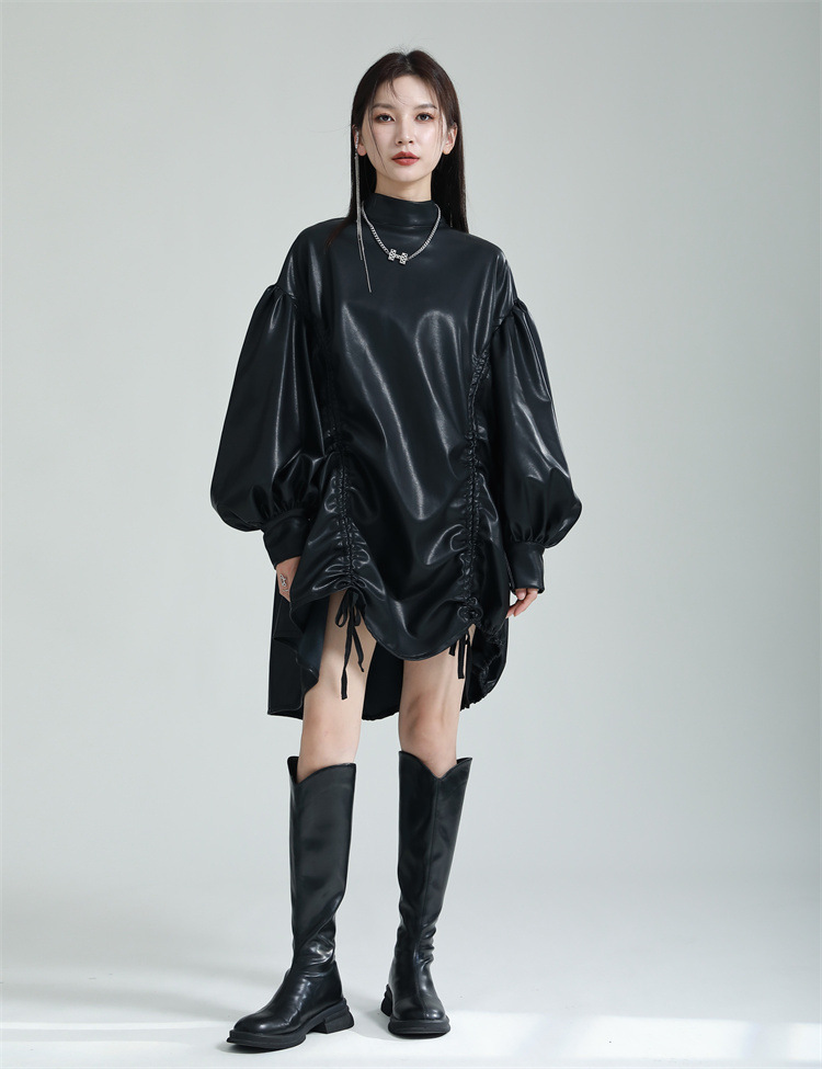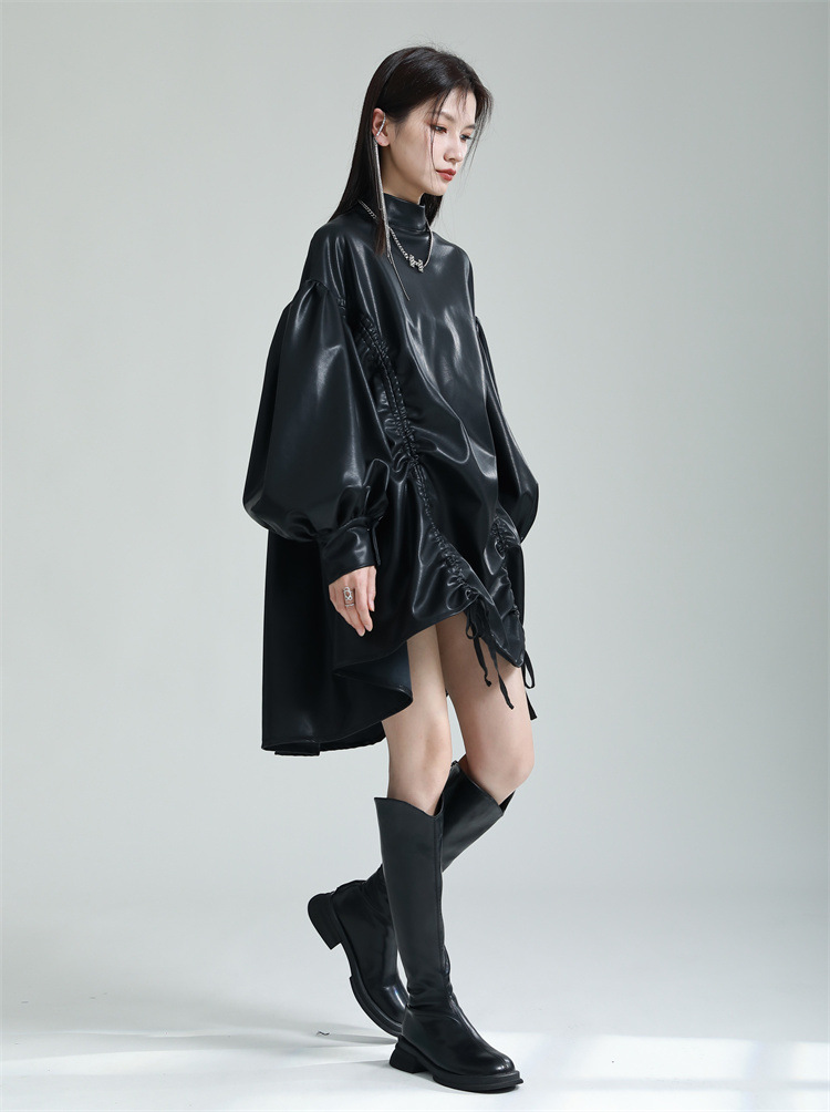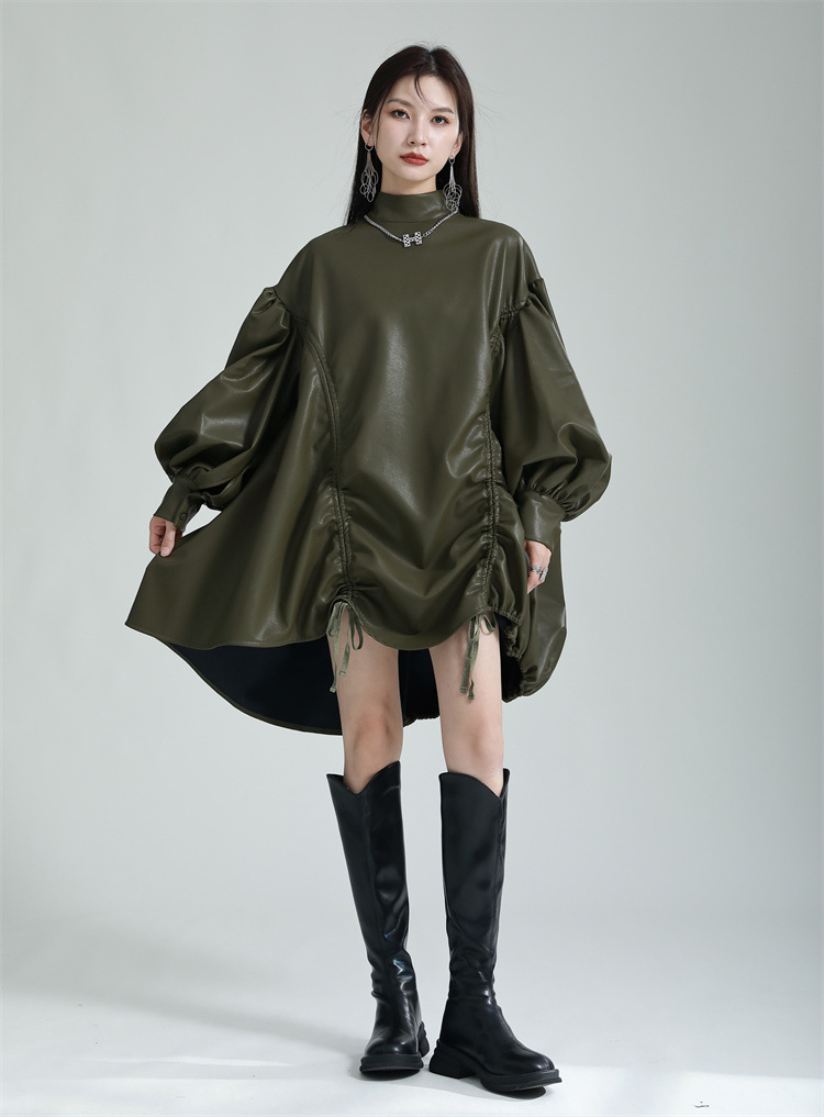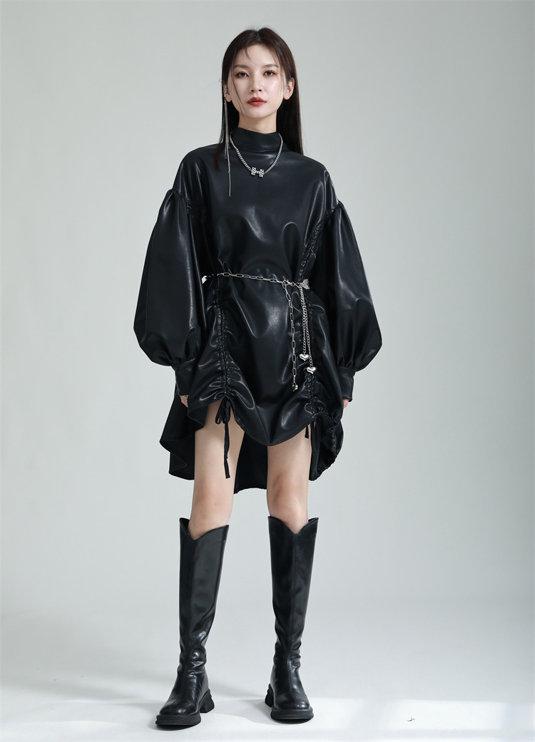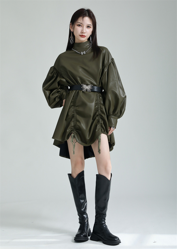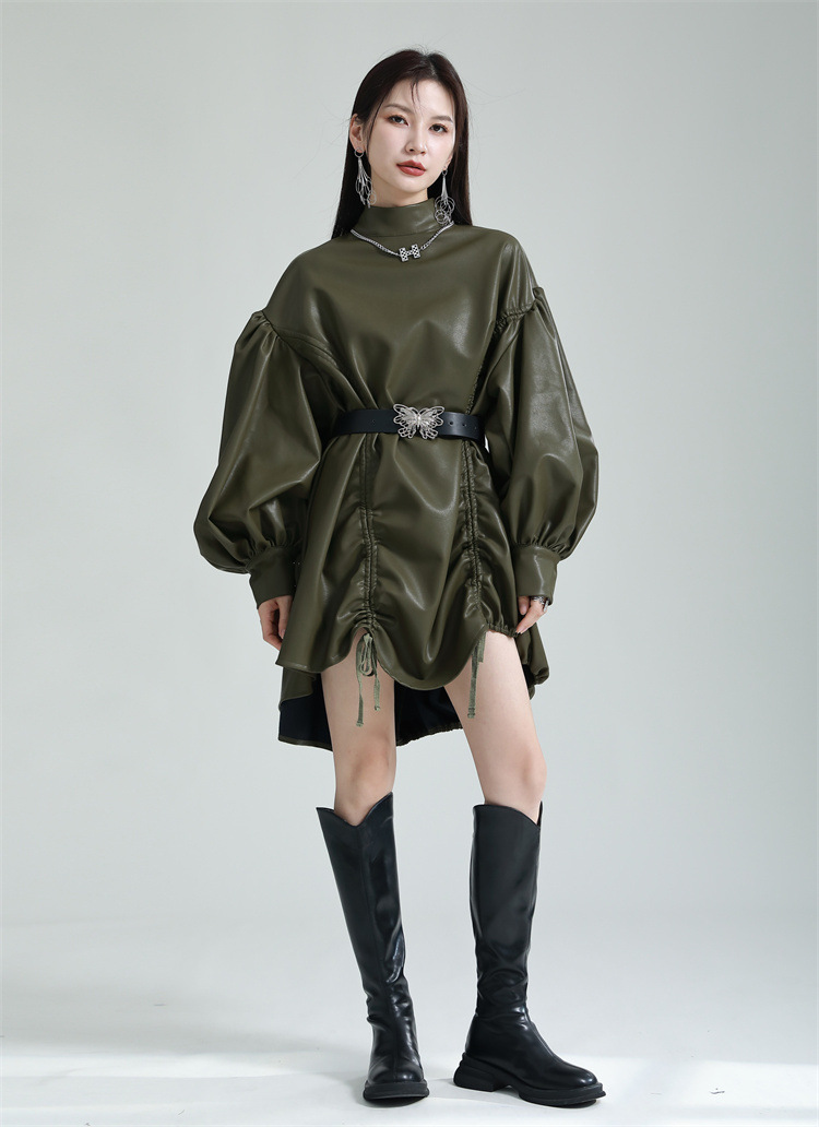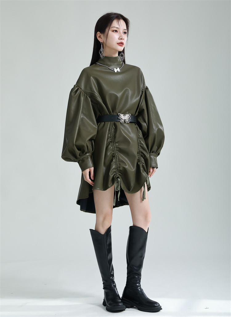 Chiếc đầm dáng áo choàng với cổ dựng đứng và dây rút tạo đường nét không đối xứng, mang phong cách riêng biệt. Tay áo phồng nhẹ ở v rồi thon dần về phía cổ tay, tạo điểm nhấn thanh thoát. Chất liệu da tổng hợp mềm mại giúp tôn dáng người mặc. Sản phẩm phù hợp để phối cùng giày bốt và túi xách có thiết kế mạnh mẽ, dùng cho các dịp dạo phố hoặc gặp gỡ bạn bè. | Tên sản phẩm: Váy Đầm Liền Thân Nữ - Thời Trang Nữ | Mã sản phẩm: K6641 - Giá: 1.070.000đ | Mã nhà sản xuất: GUDOR-G03Hình ảnh sản phẩm