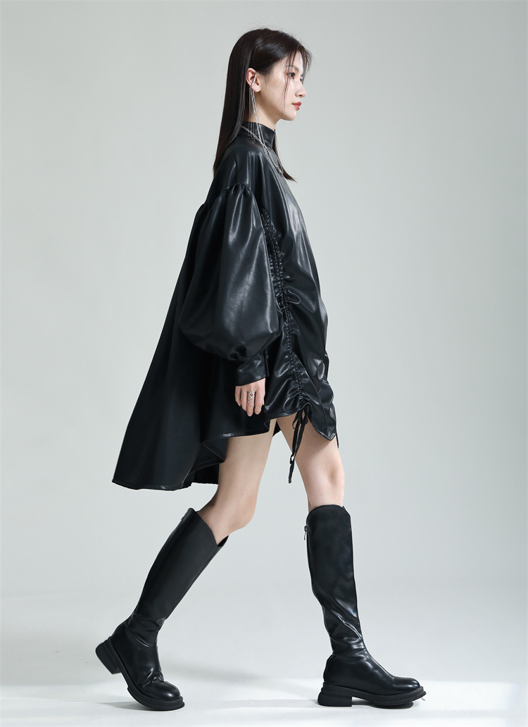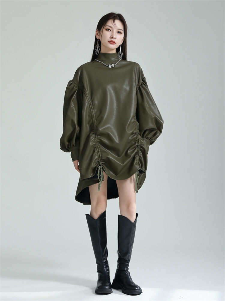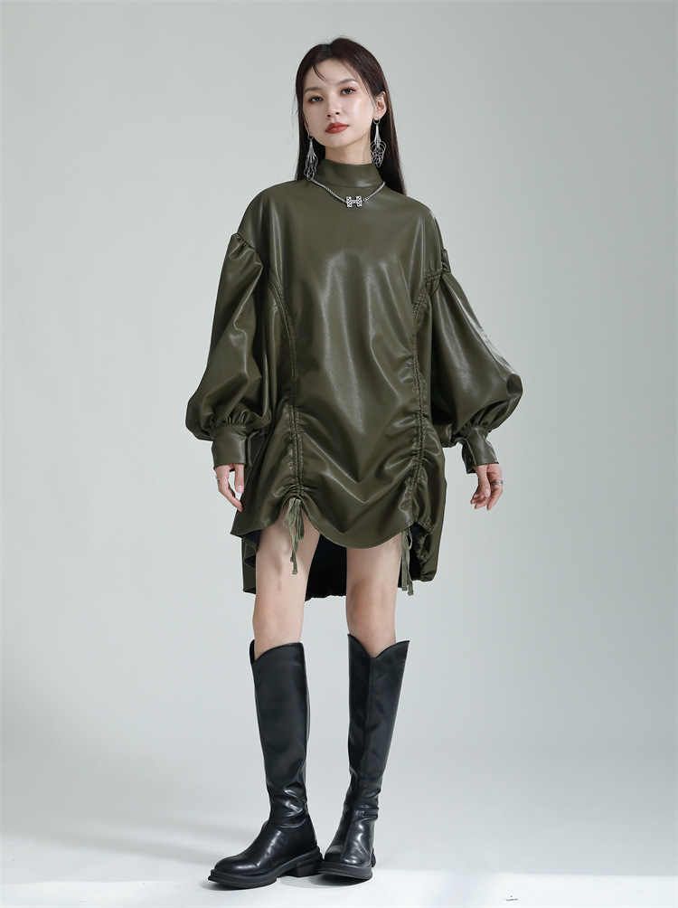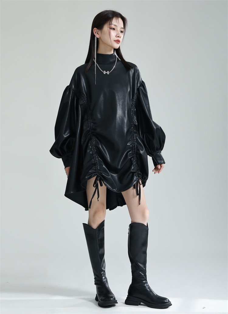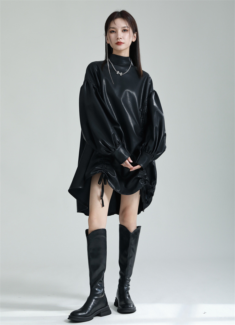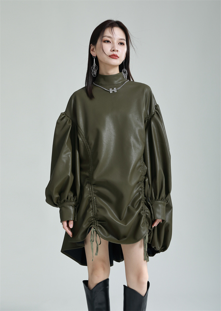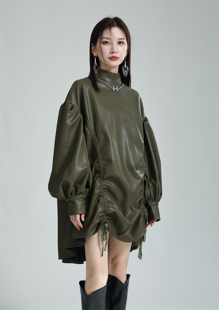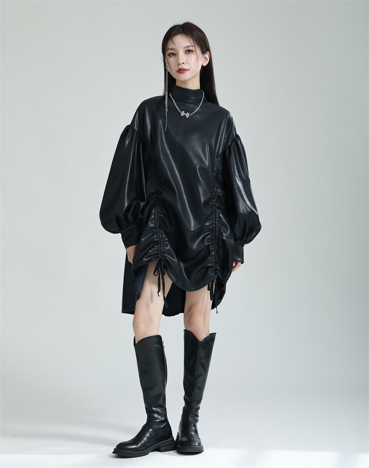 Chiếc đầm dáng áo choàng với cổ dựng đứng và dây rút tạo đường nét không đối xứng, mang phong cách riêng biệt. Tay áo phồng nhẹ ở v rồi thon dần về phía cổ tay, tạo điểm nhấn thanh thoát. Chất liệu da tổng hợp mềm mại giúp tôn dáng người mặc. Sản phẩm phù hợp để phối cùng giày bốt và túi xách có thiết kế mạnh mẽ, dùng cho các dịp dạo phố hoặc gặp gỡ bạn bè. | Tên sản phẩm: Váy Đầm Liền Thân Nữ - Thời Trang Nữ | Mã sản phẩm: K6641 - Giá: 1.070.000đ | Mã nhà sản xuất: GUDOR-G03Hình ảnh sản phẩm