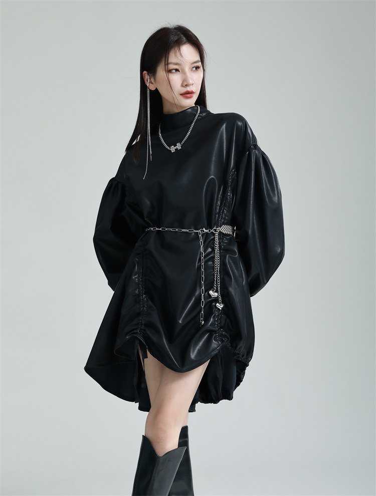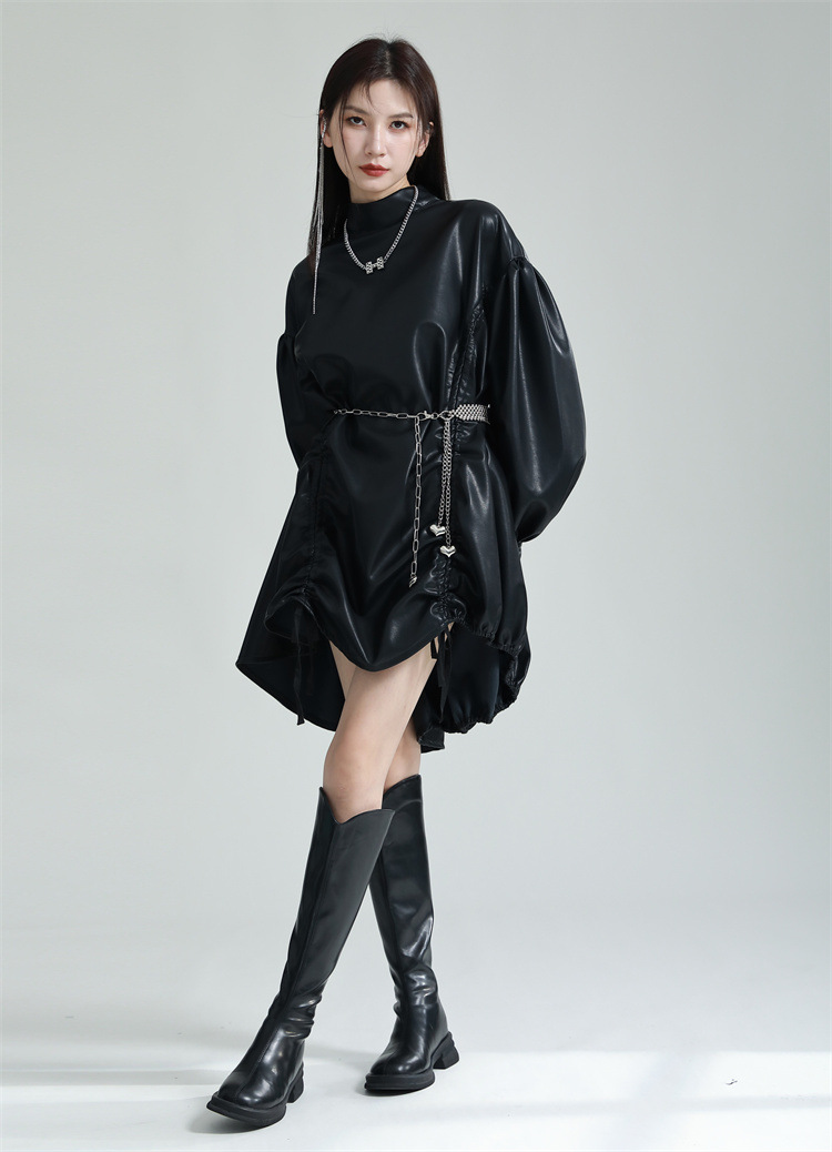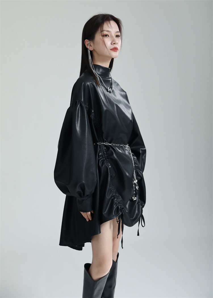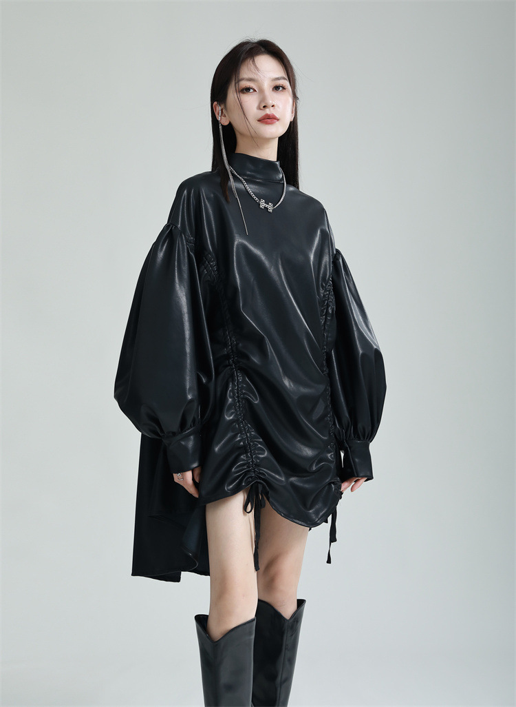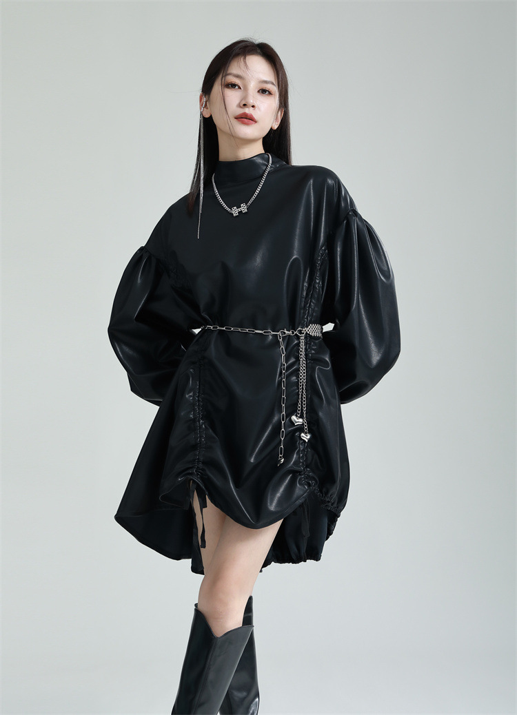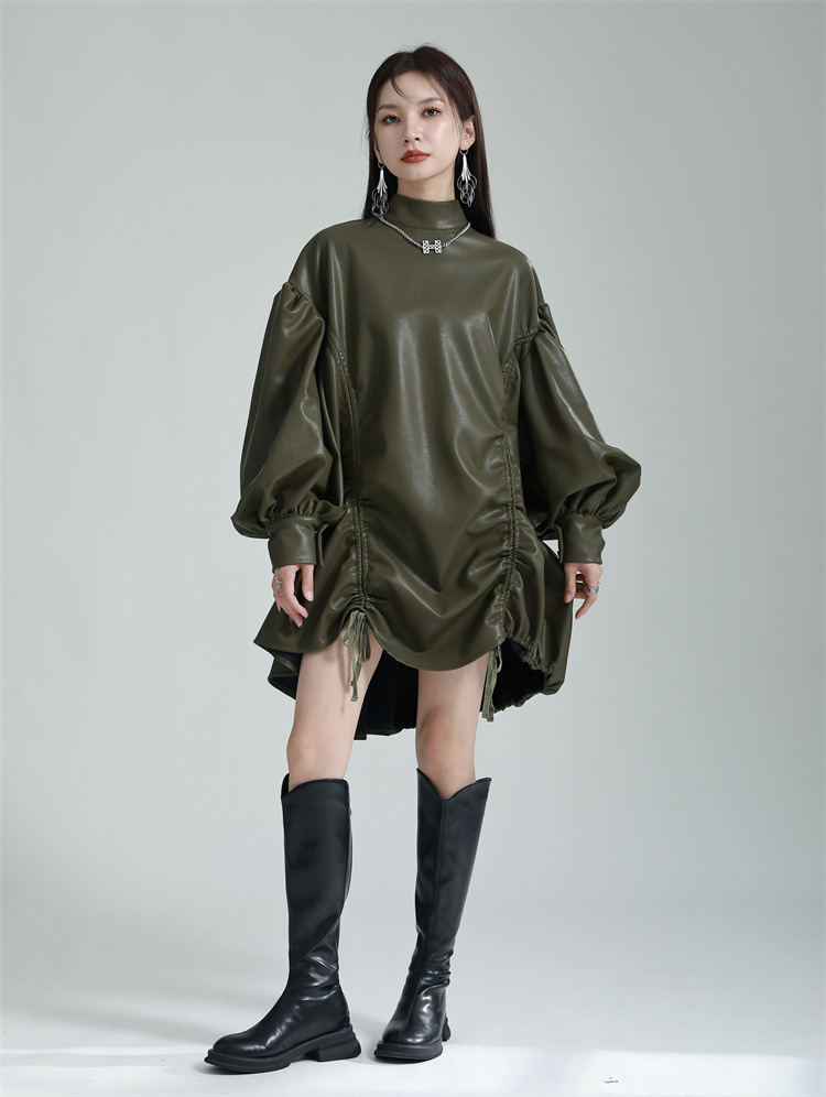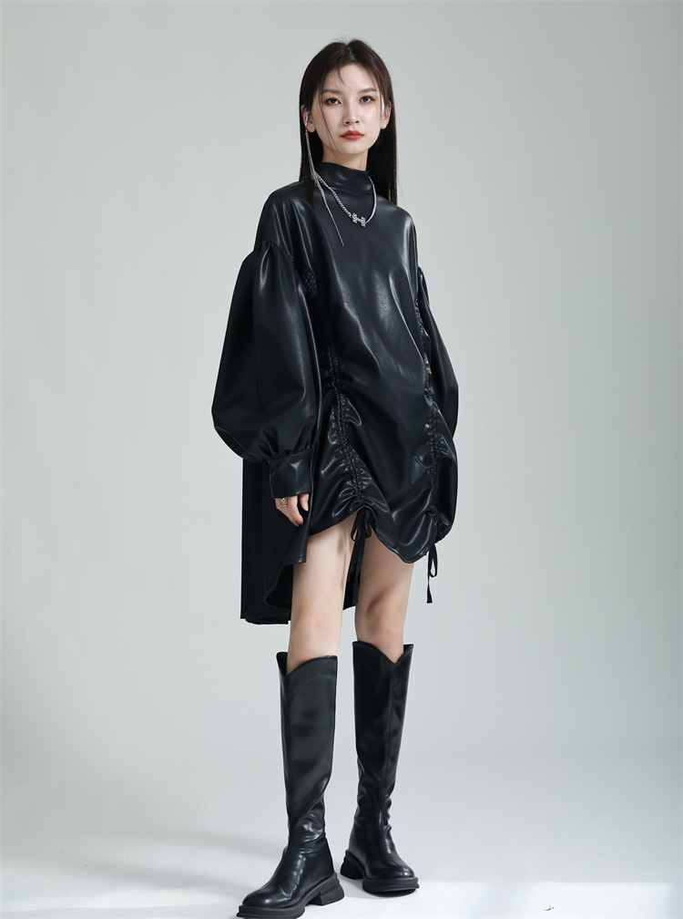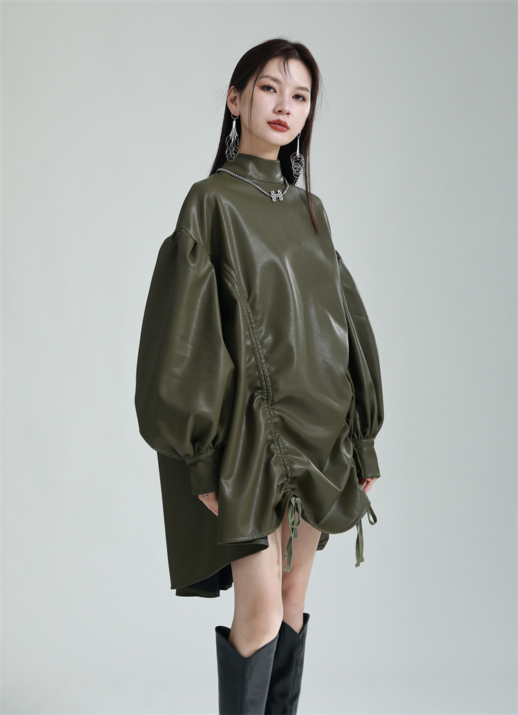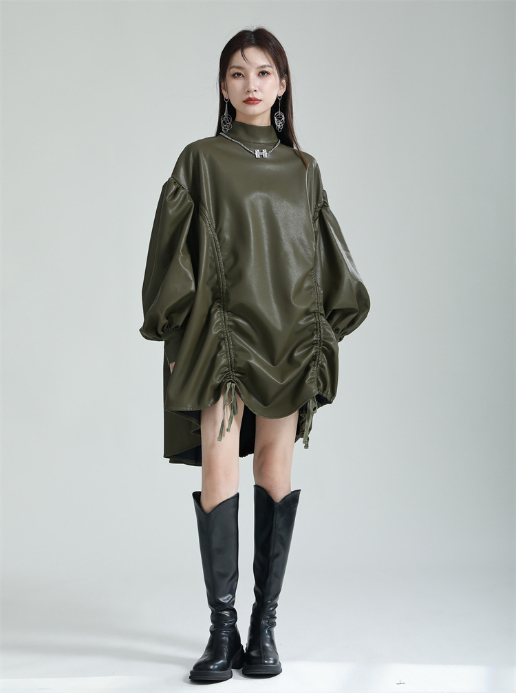 Chiếc đầm dáng áo choàng với cổ dựng đứng và dây rút tạo đường nét không đối xứng, mang phong cách riêng biệt. Tay áo phồng nhẹ ở v rồi thon dần về phía cổ tay, tạo điểm nhấn thanh thoát. Chất liệu da tổng hợp mềm mại giúp tôn dáng người mặc. Sản phẩm phù hợp để phối cùng giày bốt và túi xách có thiết kế mạnh mẽ, dùng cho các dịp dạo phố hoặc gặp gỡ bạn bè. | Tên sản phẩm: Váy Đầm Liền Thân Nữ - Thời Trang Nữ | Mã sản phẩm: K6641 - Giá: 1.070.000đ | Mã nhà sản xuất: GUDOR-G03Hình ảnh sản phẩm