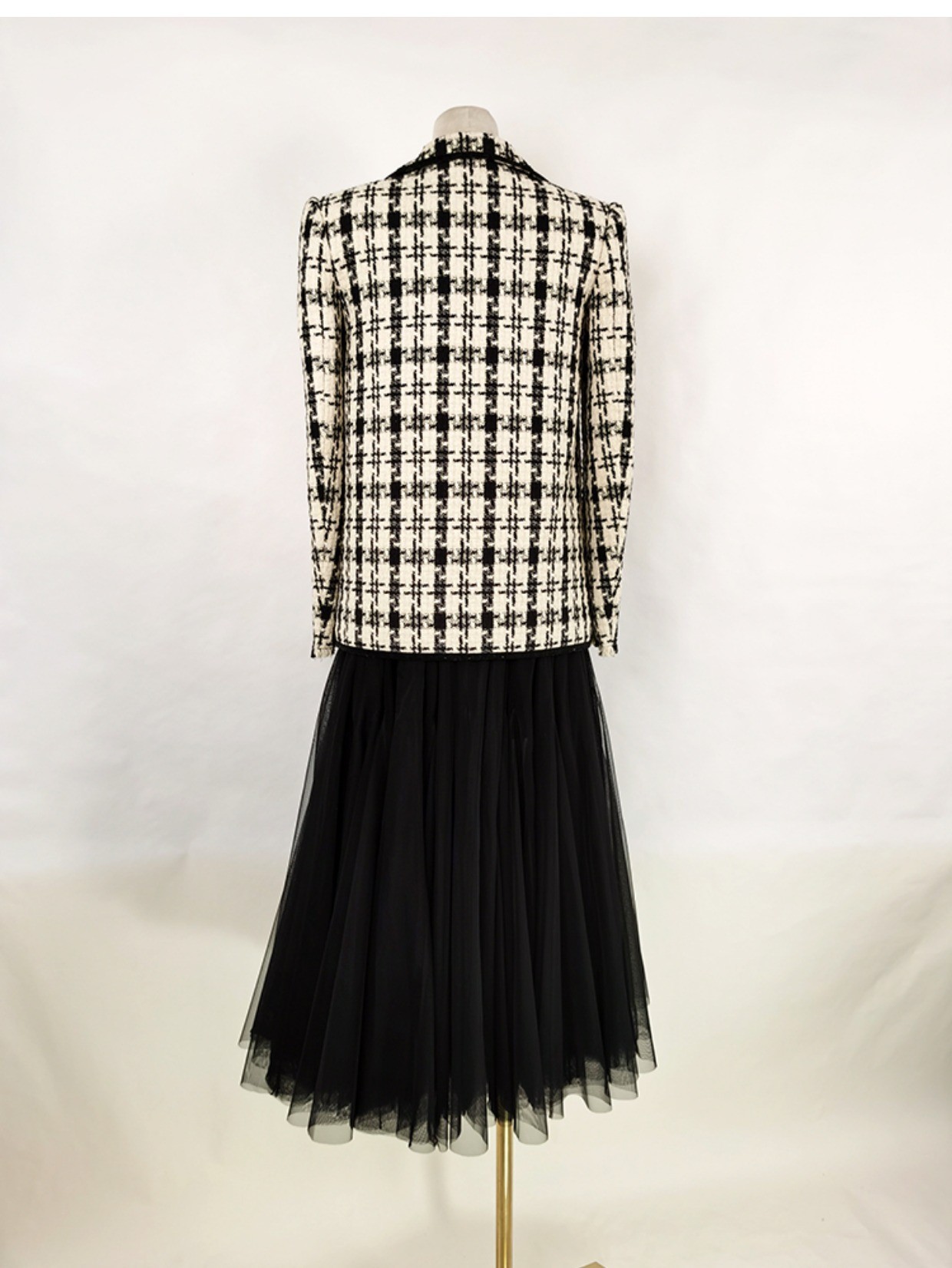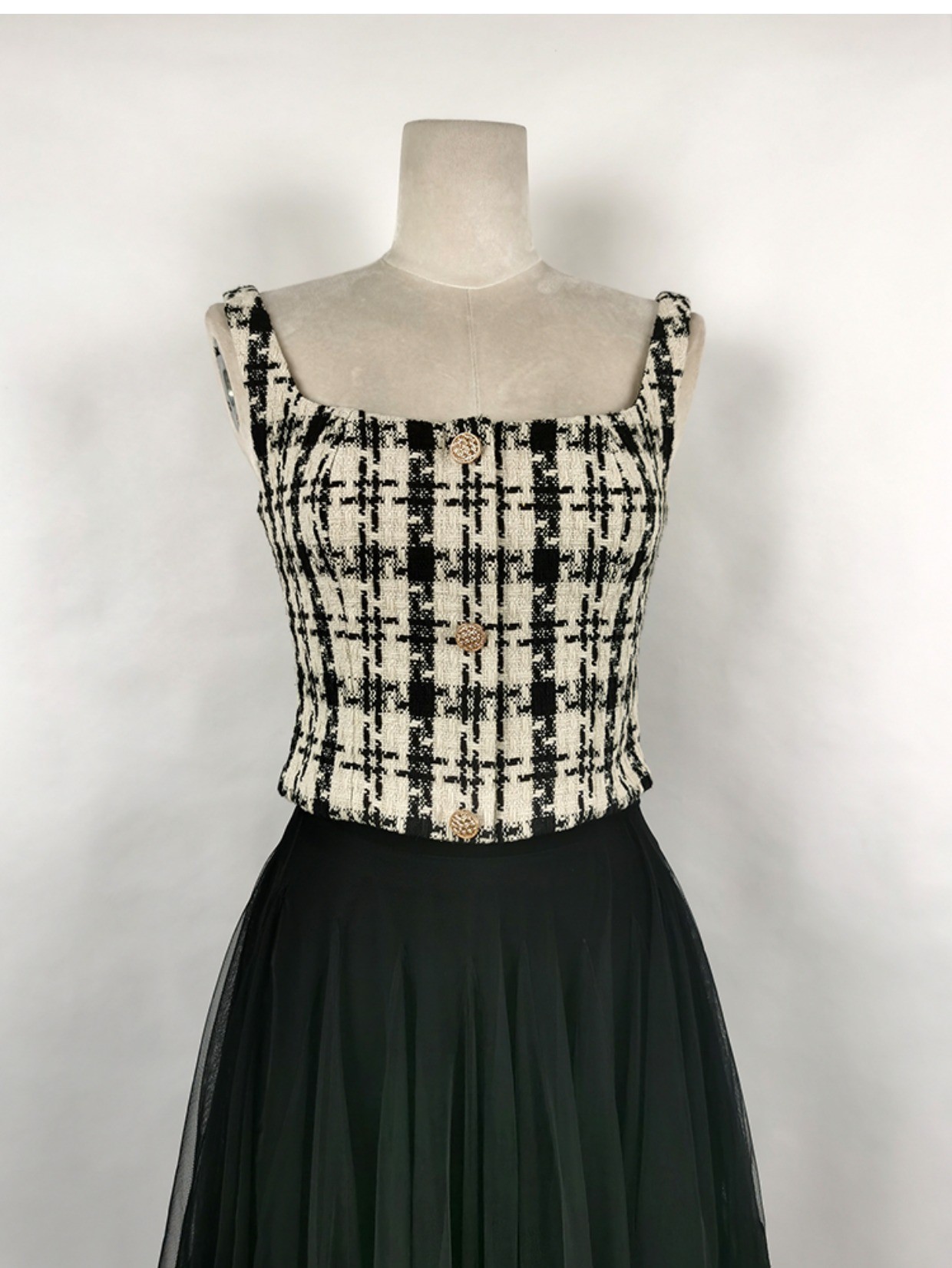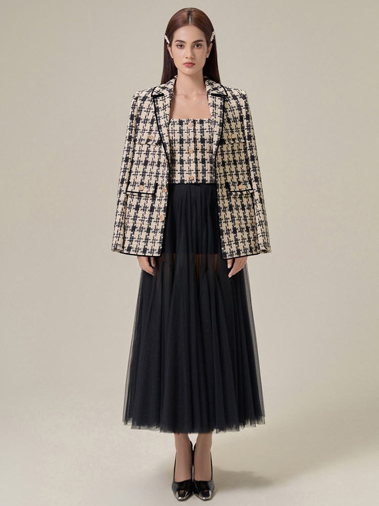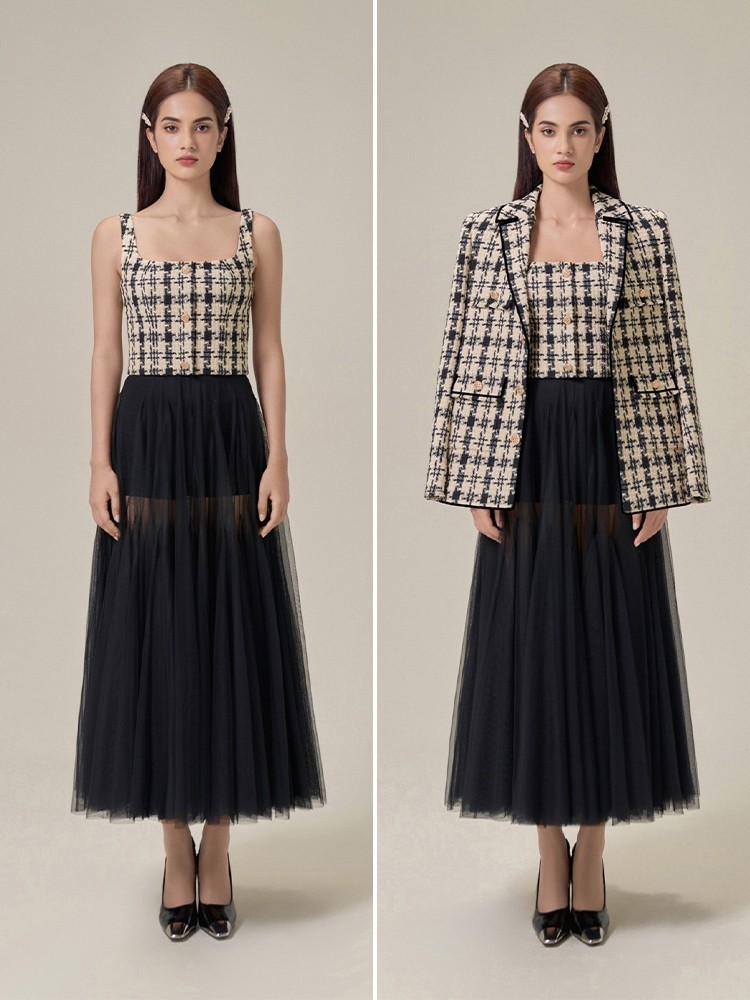 Bộ trang phục này gồm chân váy và quần legging mặc bên trong, rất phù hợp cho dịp đi làm hoặc dạo phố vào mùa thu đông. Chân váy kiểu áo khoác ngoài có họa tiết caro đặc trưng, tạo điểm nhấn thanh lịch. Dáng thiết kế dễ phối cùng nhiều loại áo khác nhau. Quần legging co giãn ôm nhẹ, giữ ấm và tạo sự thoải mái khi vận động. Có thể mặc nguyên bộ hoặc tách rời để tạo nên những phong cách đa dạng. | Tên sản phẩm: Áo Vest Nữ Vest Kẻ Caro Kẻ Caro Hàng Mùa Xuân Thu Đông - Thời Trang Nữ | Mã sản phẩm: K6707 - Giá: 2.260.000đ | Mã nhà sản xuất: FORYCT-G05Hình ảnh sản phẩm