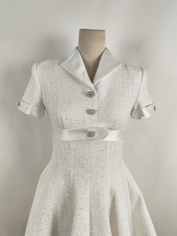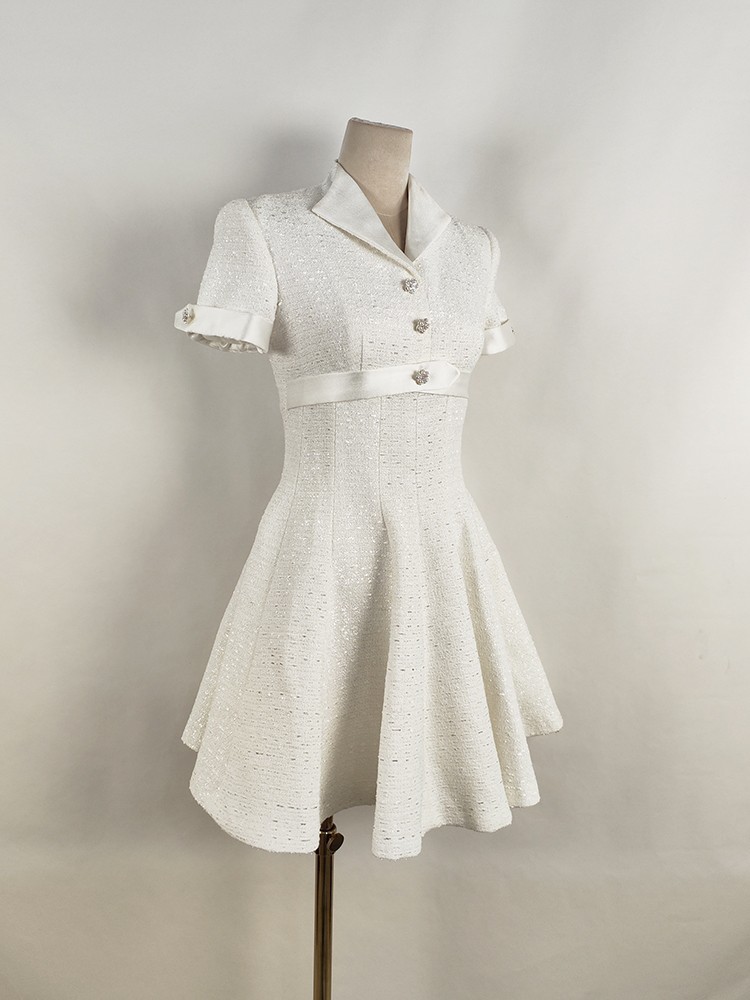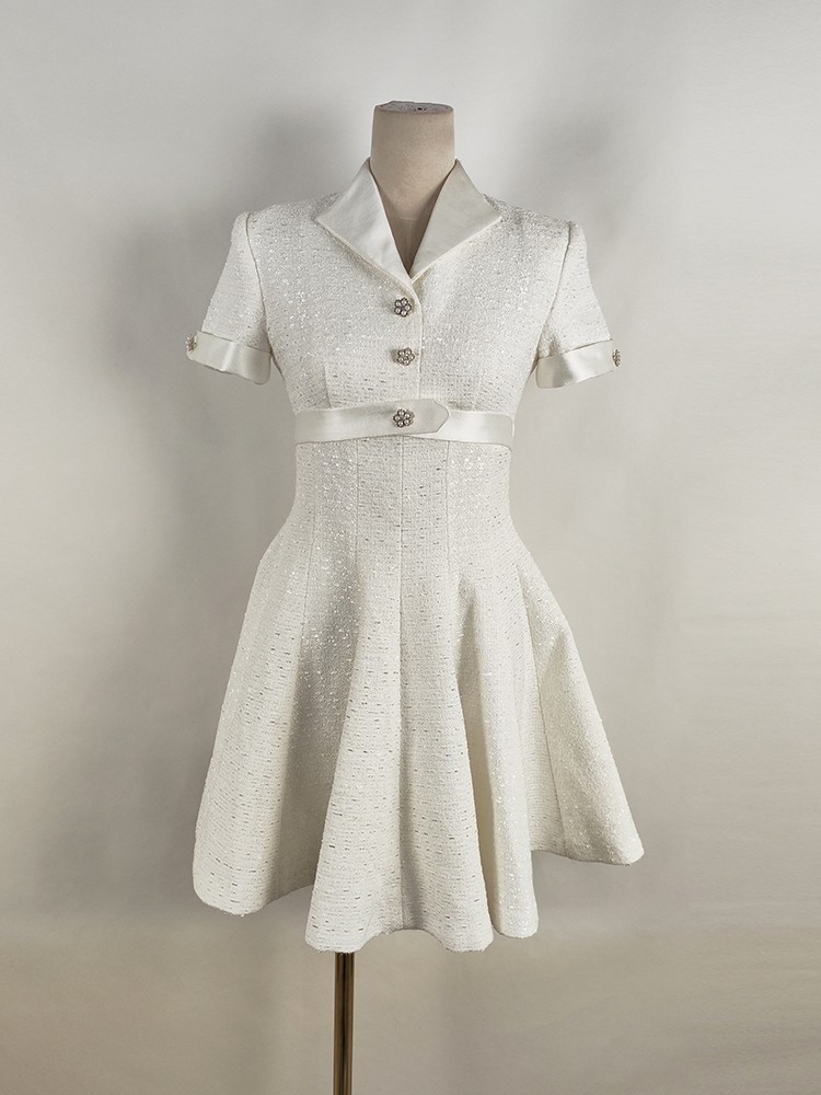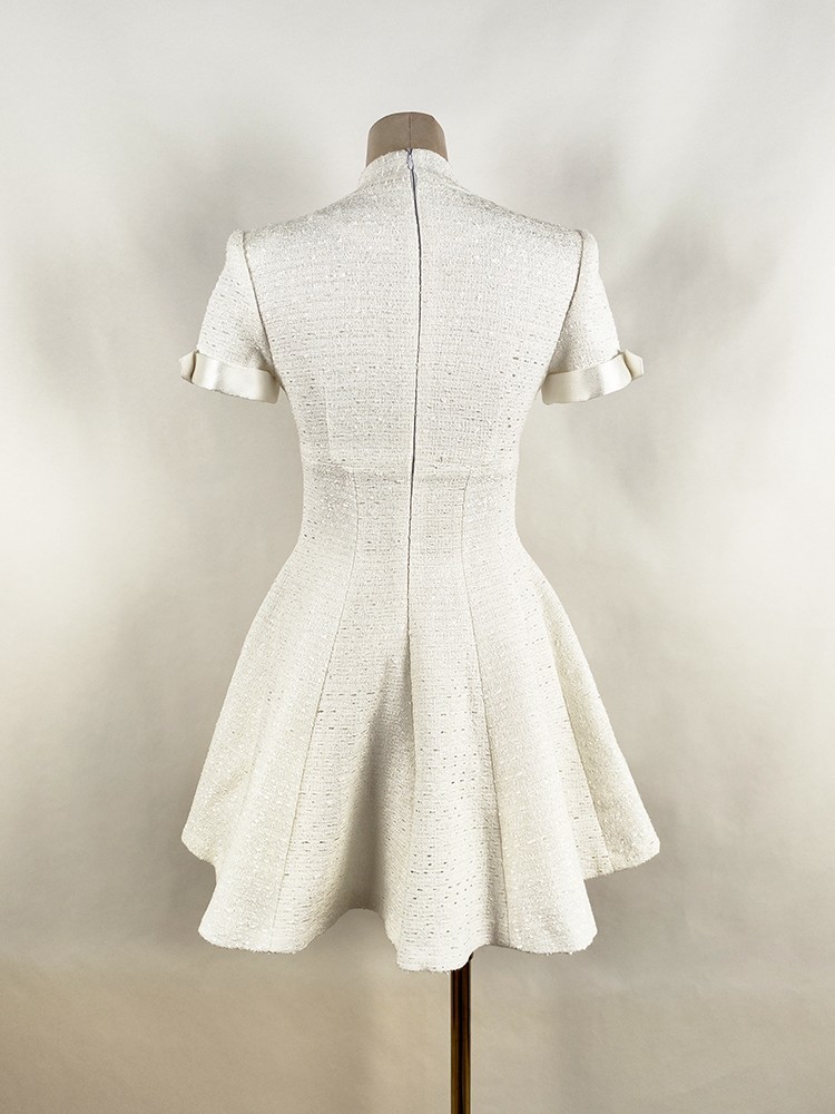 Chiếc áo dài tay ngắn này được thiết kế bởi nhà tạo mẫu Việt Nam, hoàn toàn phù hợp cho mùa xuân hè. Cổ áo kiểu bẻ mang đến vẻ ngoại hình chỉn chu. Phần thân dưới xòe nhẹ theo dáng chữ A, tạo cảm giác duyên dáng và che bớt khuyết điểm vòng eo. Chất vải màu trắng mát mẻ, thoáng khí giúp bạn dễ chịu khi mặc. Sản phẩm dễ dàng phối cùng giày sandal hoặc giày thể thao cho những dịp đi chơi hàng ngày. | Tên sản phẩm: Váy Đầm Liền Thân Nữ Dáng Chữ A Ngắn Tay Kín Cổ Hàng Mùa Hè - Thời Trang Nữ | Mã sản phẩm: K6729 - Giá: 2.760.000đ | Mã nhà sản xuất: FORYCT-G06Hình ảnh sản phẩm