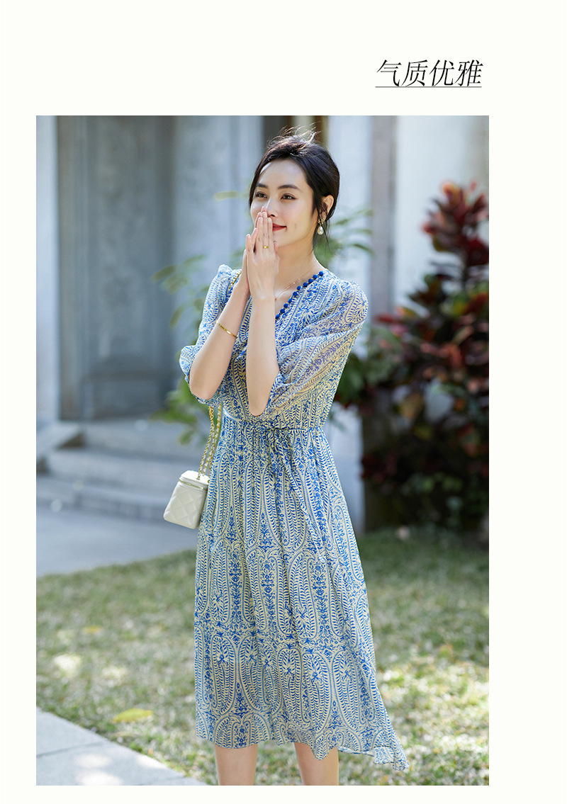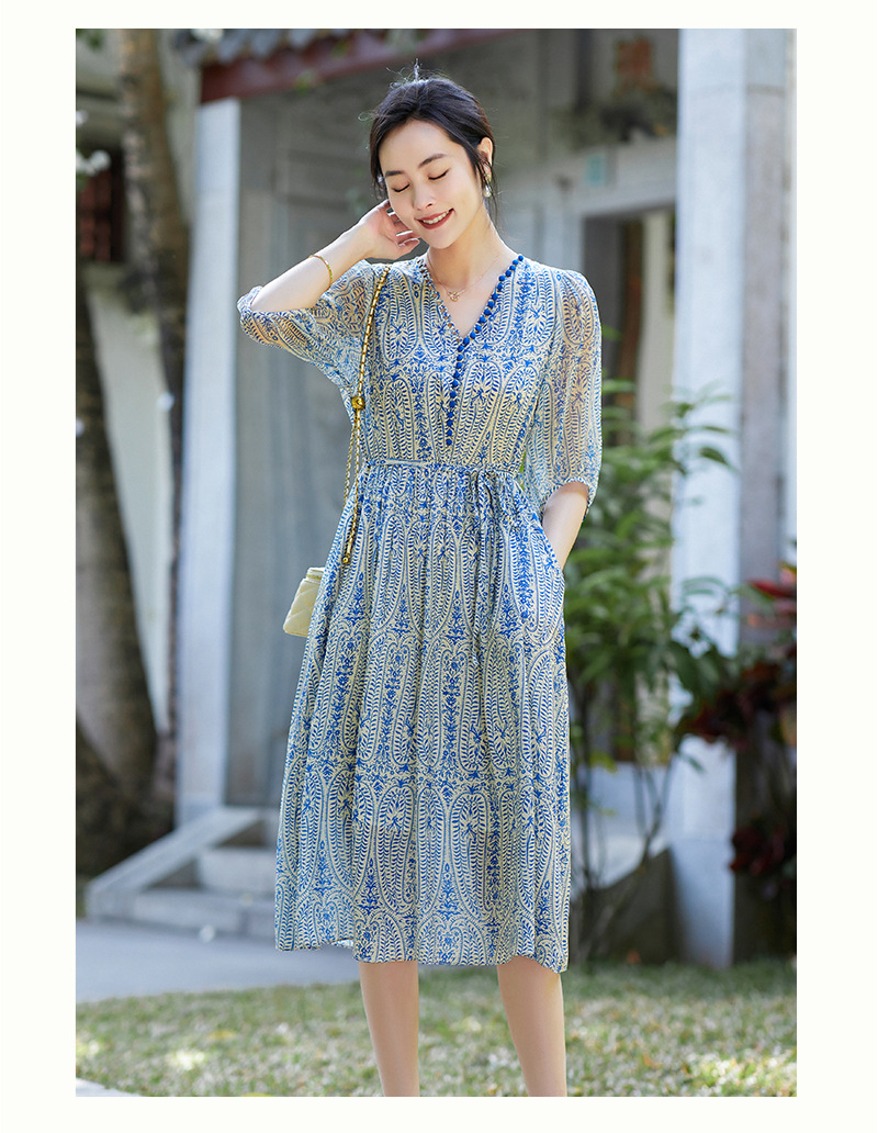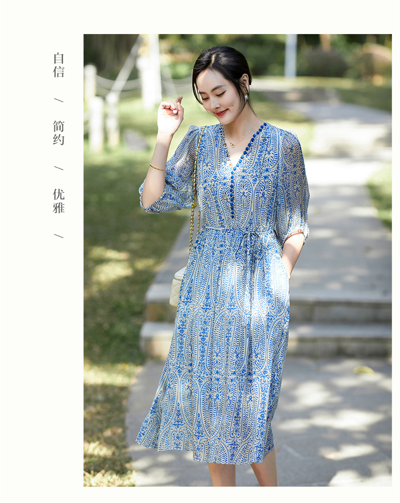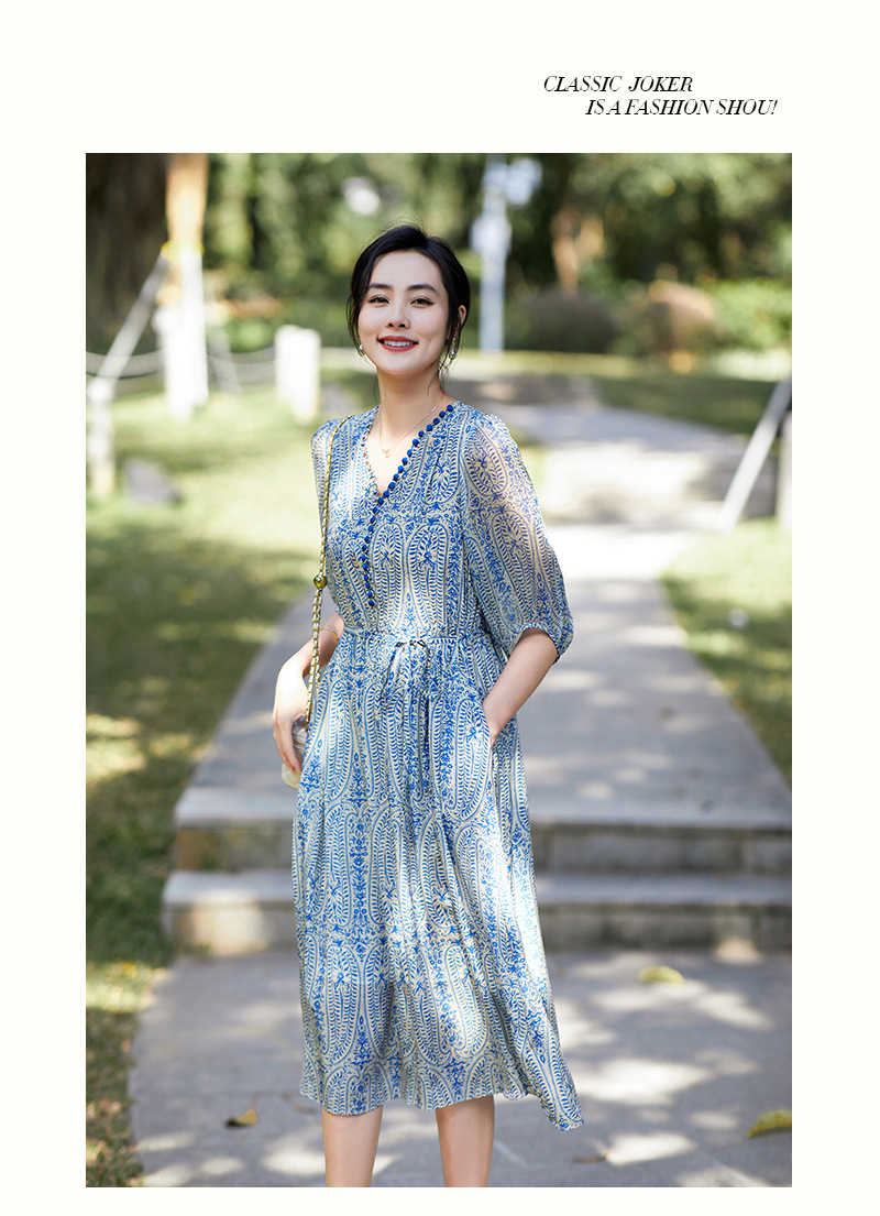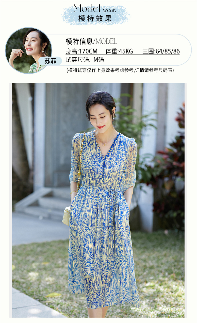 Chiếc đầm dành cho những ngày hè, được làm từ chất liệu lụa mềm mại, thoáng mát. Thiết kế cổ chữ V và tay ngắn tôn lên vẻ nữ tính. Form dáng xòe nhẹ phía dưới giúp che khuyết điểm và dễ dàng di chuyển. Hoa văn trên vải mang cảm hứng từ họa tiết gốm cổ điển, tạo điểm nhấn tinh tế. Sản phẩm phù hợp để mặc đi làm hoặc dự những buổi gặp mặt. | Tên sản phẩm: Váy Đầm Liền Thân Nữ Chất Liệu Lụa Tơ Tằm Dáng Chữ A Họa Tiết Hoa Cổ Chữ V Hàng Mùa Hè - Thời Trang Nữ | Mã sản phẩm: K6981 - Giá: 2.960.000đ | Mã nhà sản xuất: SHDA-G06Hình ảnh sản phẩm