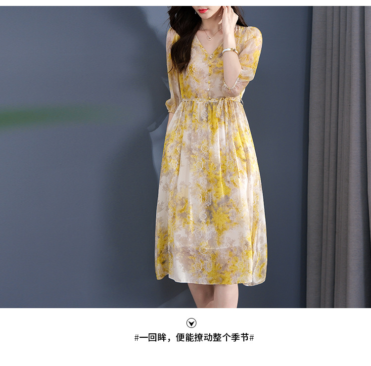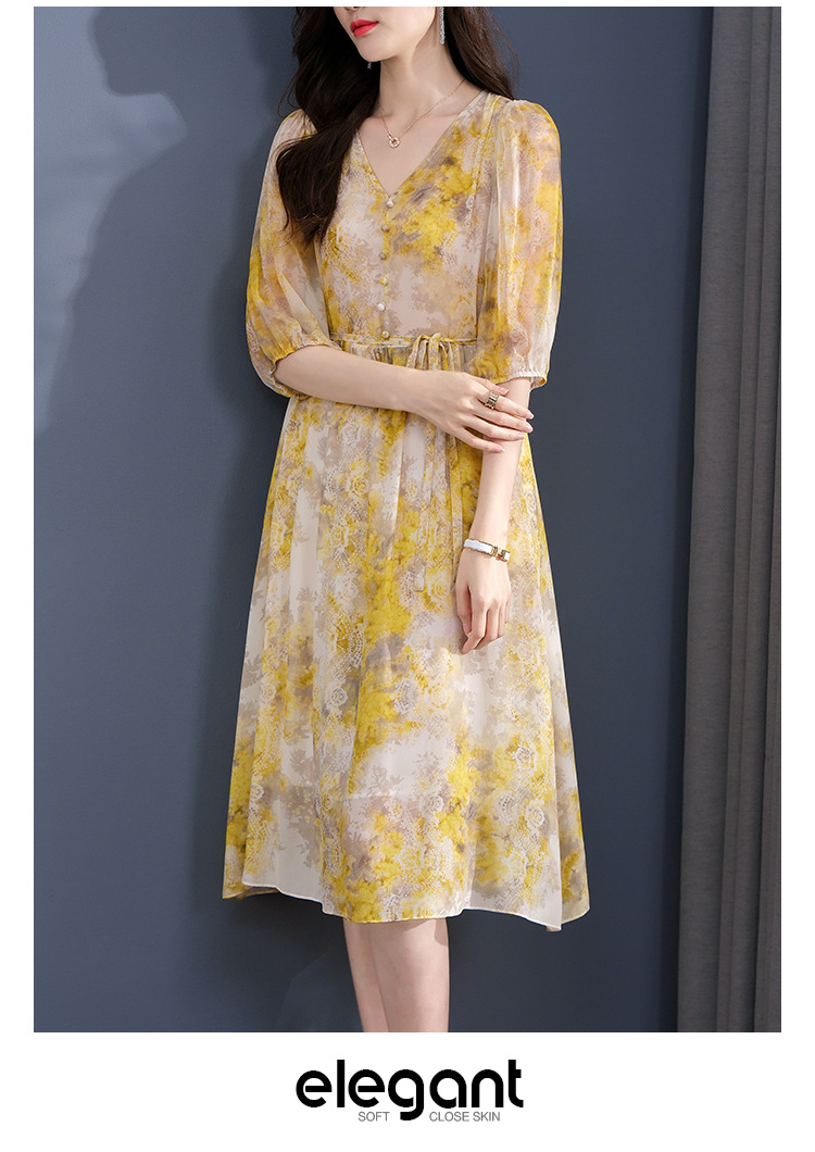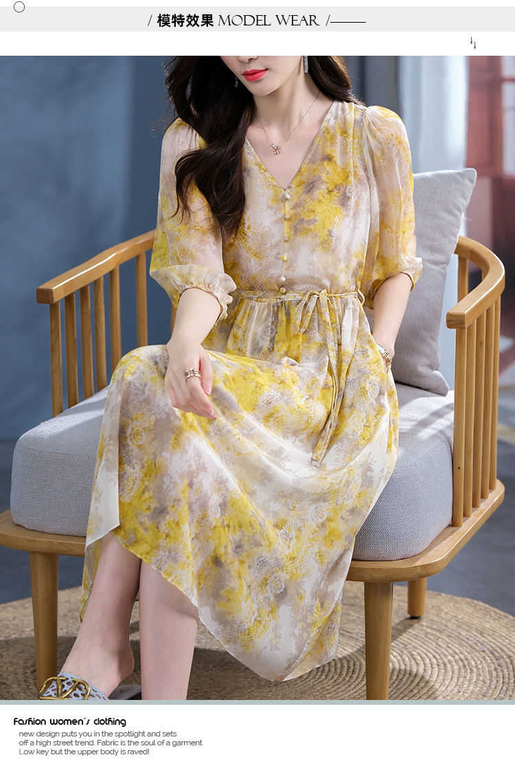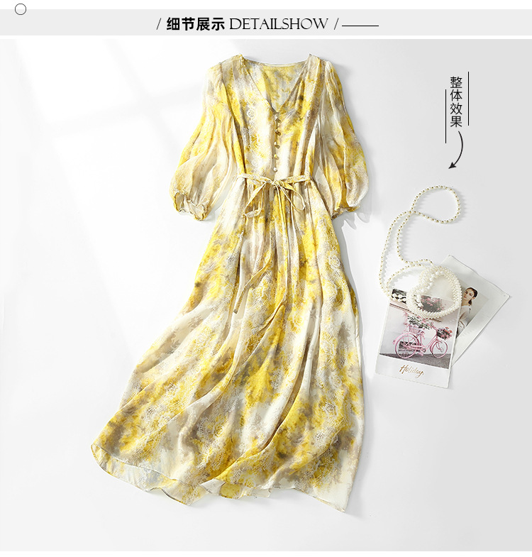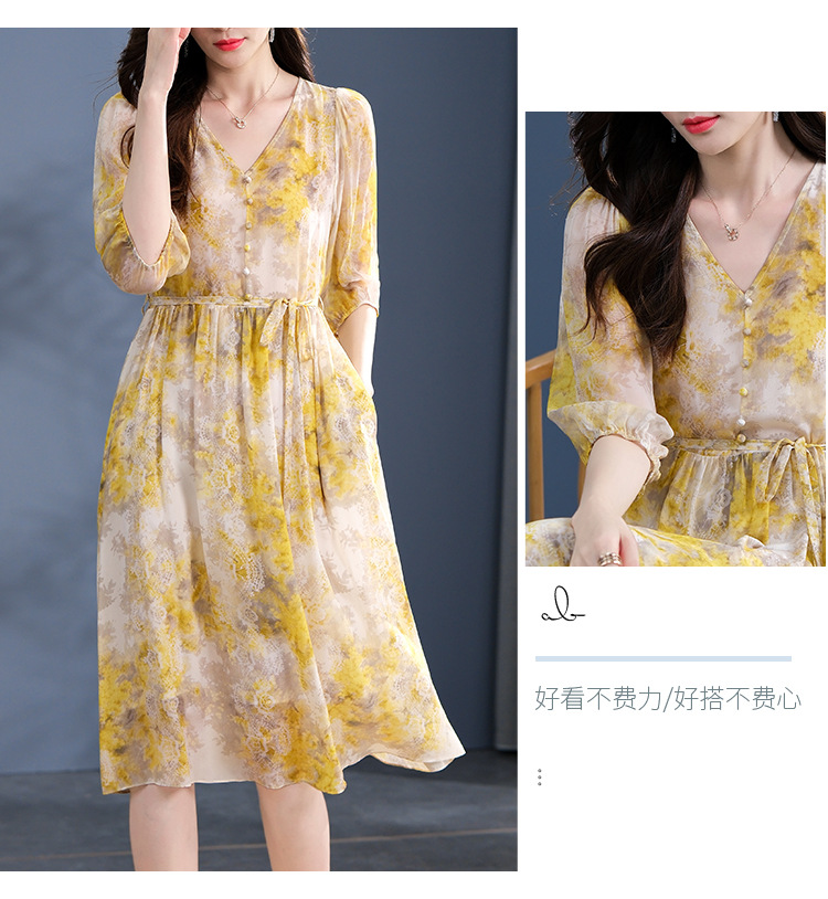 Chiếc đầm dành cho nữ, điểm nhấn từ cổ chữ V cùng dây thắt nơ tạo đường nét thanh thoát. Họa tiết in đậm chất Âu Mỹ sinh động, kết hợp chất liệu tơ tự nhiên mềm mại giúp người mặc cảm thấy dễ chịu. Tay áo dài ba phần tay mang đến vẻ ngoại hình lịch sự. Sản phẩm phù hợp cho những dịp gặp mặt thường ngày, dễ dàng phối cùng giày sandal hoặc giày gót thấp. Giặt bằng tay và phơi trong bóng mát để giữ độ bền đẹp. | Tên sản phẩm: Váy Đầm Liền Thân Nữ Chất Liệu Lụa Tơ Tằm Họa Tiết Hoa Cổ Chữ V Hàng Mùa Hè Phong Cách Âu Mỹ - Thời Trang Nữ | Mã sản phẩm: K6983 - Giá: 2.850.000đ | Mã nhà sản xuất: SHDA-G06Hình ảnh sản phẩm