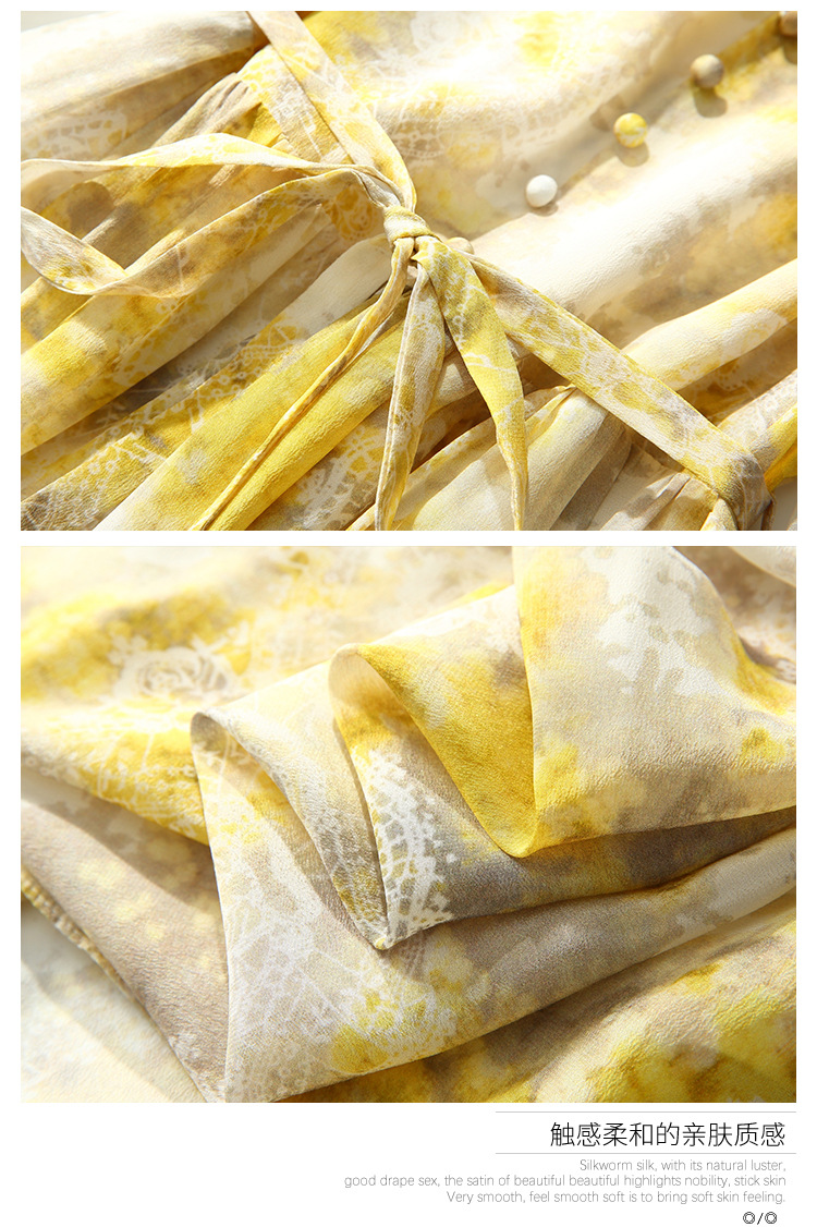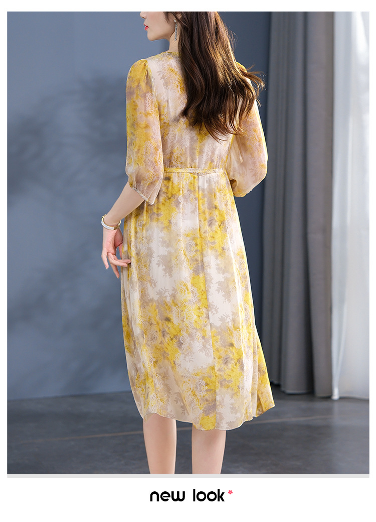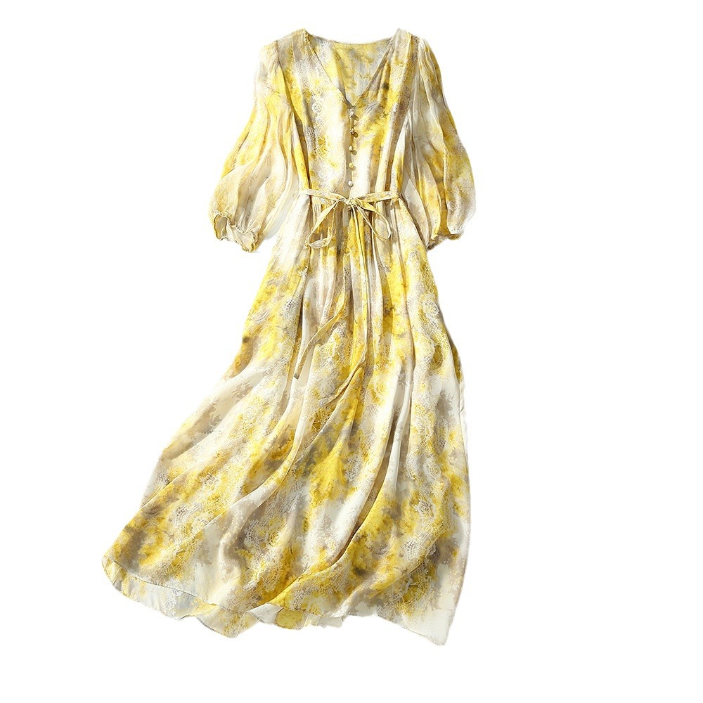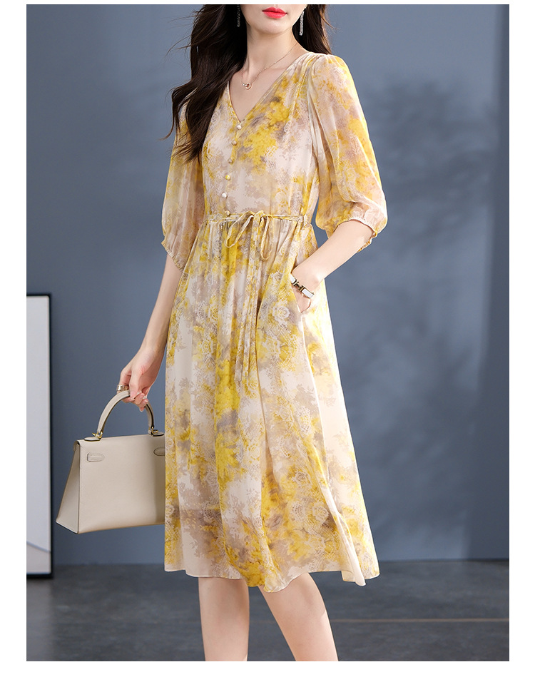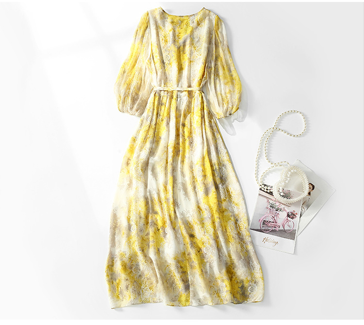 Chiếc đầm dành cho nữ, điểm nhấn từ cổ chữ V cùng dây thắt nơ tạo đường nét thanh thoát. Họa tiết in đậm chất Âu Mỹ sinh động, kết hợp chất liệu tơ tự nhiên mềm mại giúp người mặc cảm thấy dễ chịu. Tay áo dài ba phần tay mang đến vẻ ngoại hình lịch sự. Sản phẩm phù hợp cho những dịp gặp mặt thường ngày, dễ dàng phối cùng giày sandal hoặc giày gót thấp. Giặt bằng tay và phơi trong bóng mát để giữ độ bền đẹp. | Tên sản phẩm: Váy Đầm Liền Thân Nữ Chất Liệu Lụa Tơ Tằm Họa Tiết Hoa Cổ Chữ V Hàng Mùa Hè Phong Cách Âu Mỹ - Thời Trang Nữ | Mã sản phẩm: K6983 - Giá: 2.850.000đ | Mã nhà sản xuất: SHDA-G06Hình ảnh sản phẩm