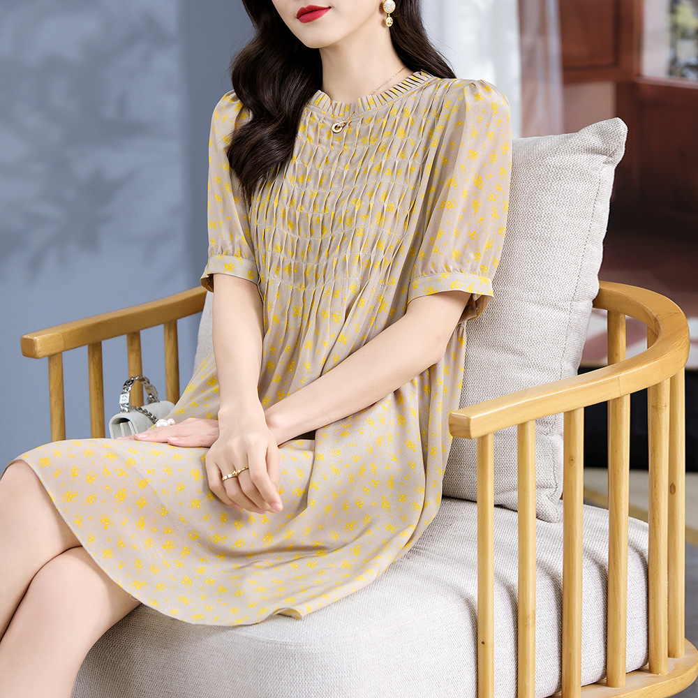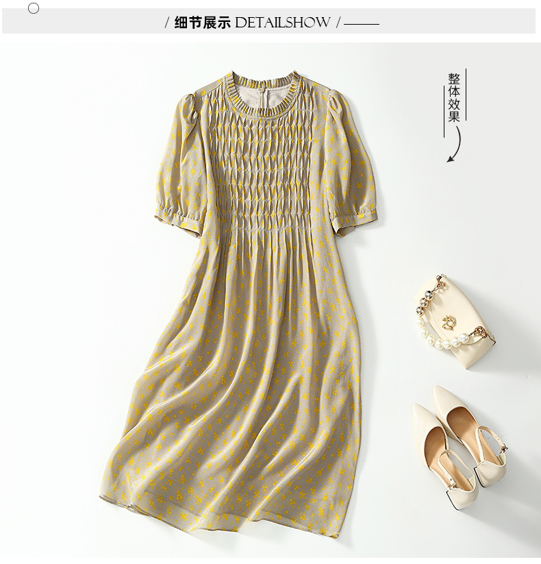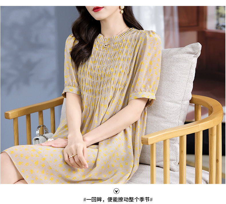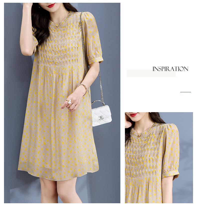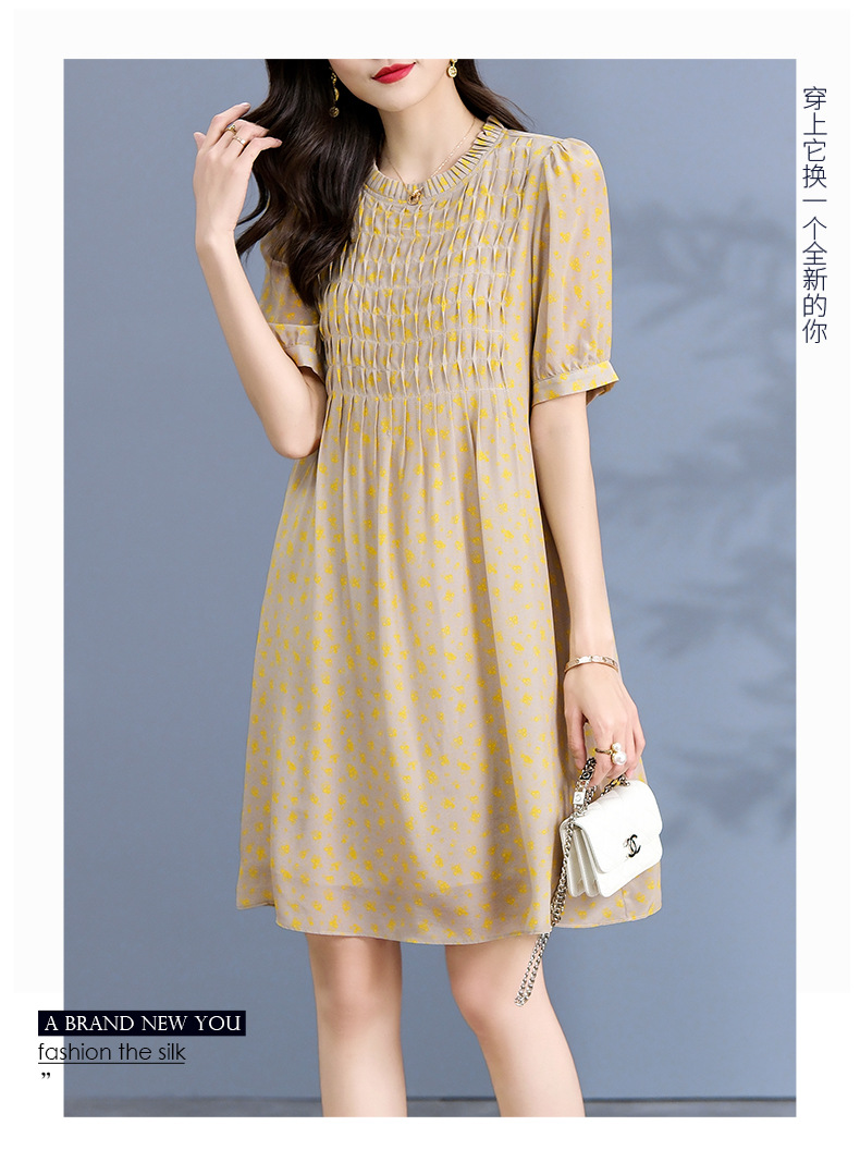 Chiếc váy mùa hè này có điểm nhấn là phần cổ áo và tay áo ngắn được trang trí đường viền hoa văn tinh xảo. Thân váy dáng chữ A với những nếp gấp được dập kỹ thuật, tạo nên vẻ đẹp mềm mại và nữ tính. Chất liệu lụa in họa tiết mang lại cảm giác mát mẻ, nhẹ nhàng và thoải mái khi mặc. Sản phẩm phù hợp để đi làm, dự tiệc hoặc tạo phong cách thanh lịch cho những dịp gặp mặt hàng ngày. | Tên sản phẩm: Váy Đầm Liền Thân Nữ Chất Liệu Lụa Tơ Tằm Dáng Chữ A Ngắn Tay Họa Tiết Hoa Hàng Mùa Hè - Thời Trang Nữ | Mã sản phẩm: K6986 - Giá: 2.760.000đ | Mã nhà sản xuất: SHDA-G06Hình ảnh sản phẩm