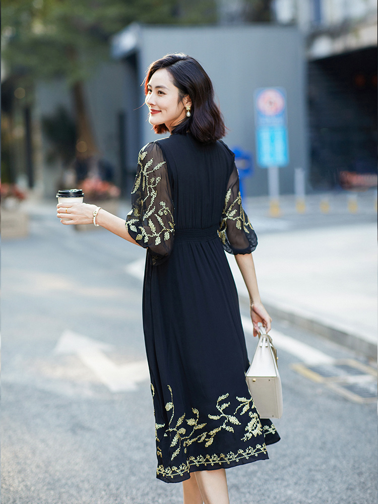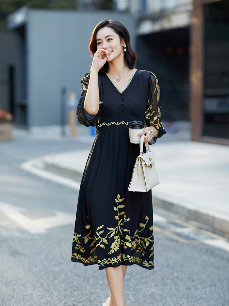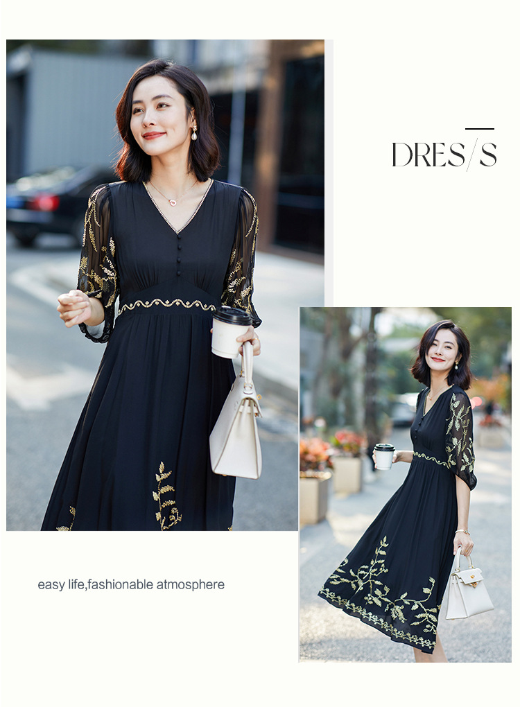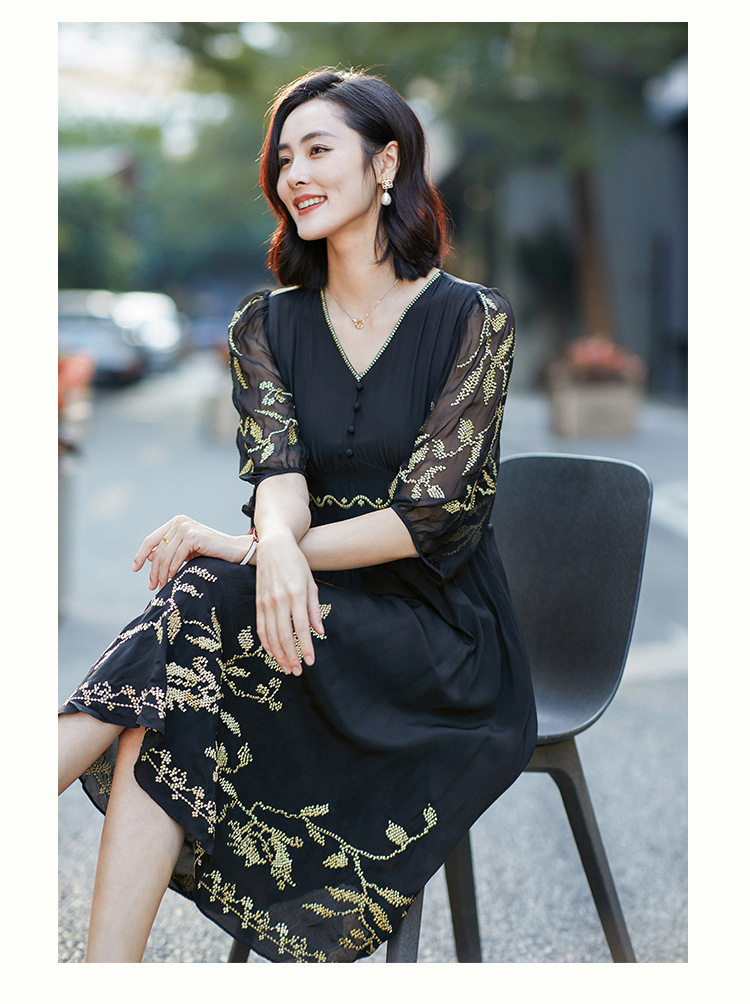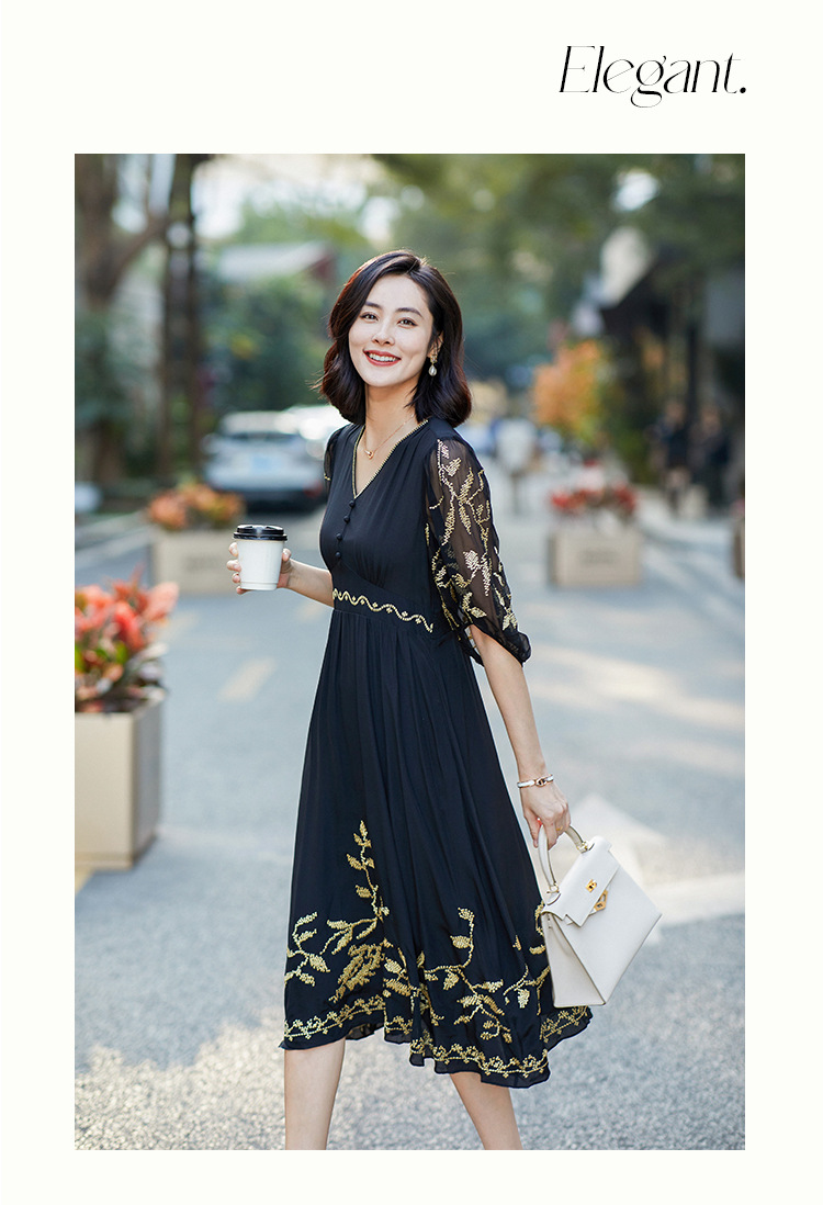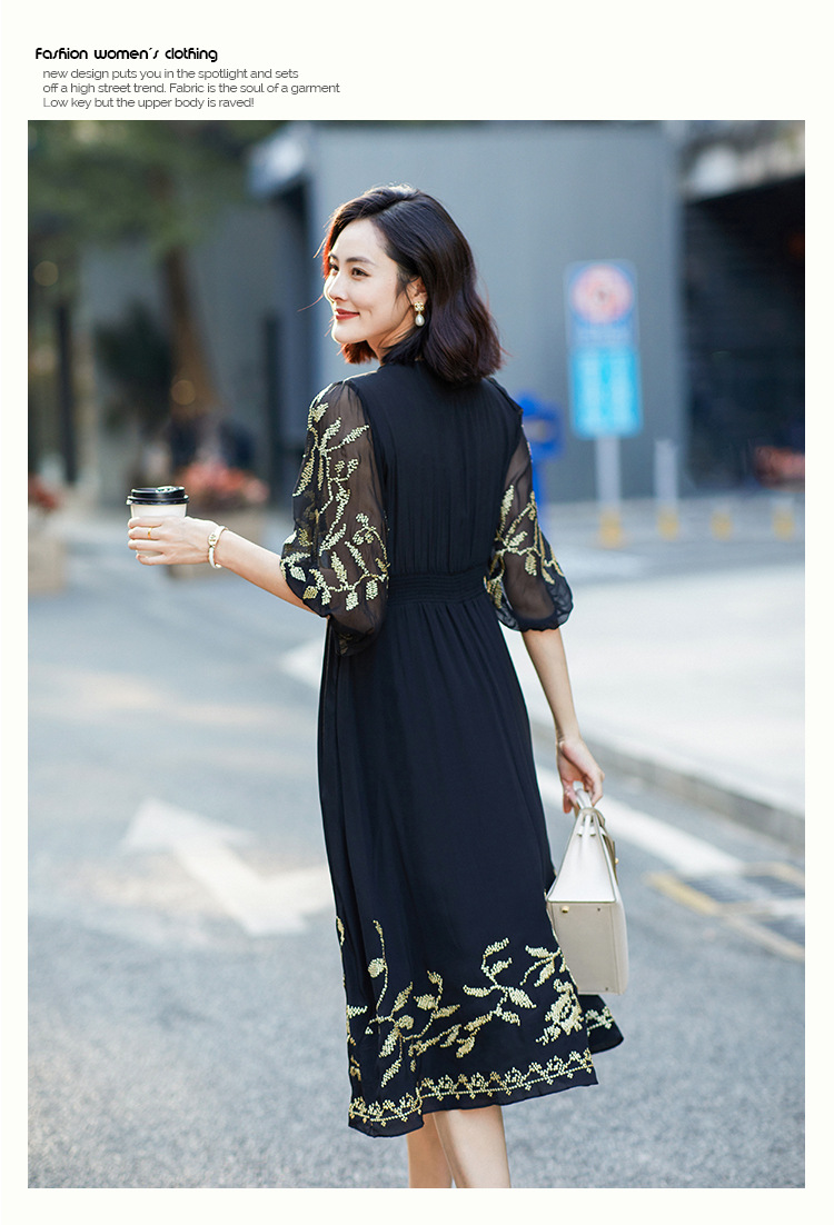 Đầm dáng dài qua gối, tôn dáng cho người mặc. Chất liệu lụa mềm mại, thoáng mát, điểm nhấn là những đường thêu tỉ mỉ tạo nên nét đẹp riêng. Kiểu dáng mang phong cách Pháp nhẹ nhàng, thanh lịch. Sản phẩm có màu đen dễ dàng phối đồ. Mặc kèm giày cao gót hoặc sandal để hoàn thiện set đồ. Giặt tay và phơi trong bóng râm để giữ form vải và độ bền màu. | Tên sản phẩm: Váy Đầm Liền Thân Nữ Chất Liệu Lụa Tơ Tằm Thêu Họa Tiết Hoa Hàng Mùa Hè - Thời Trang Nữ | Mã sản phẩm: K6993 - Giá: 3.690.000đ | Mã nhà sản xuất: SHDA-G06Hình ảnh sản phẩm
