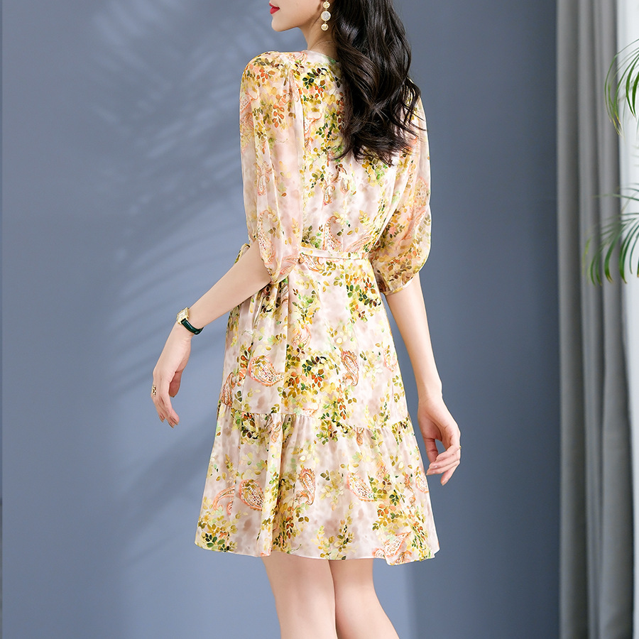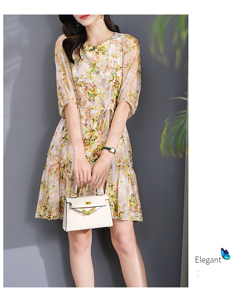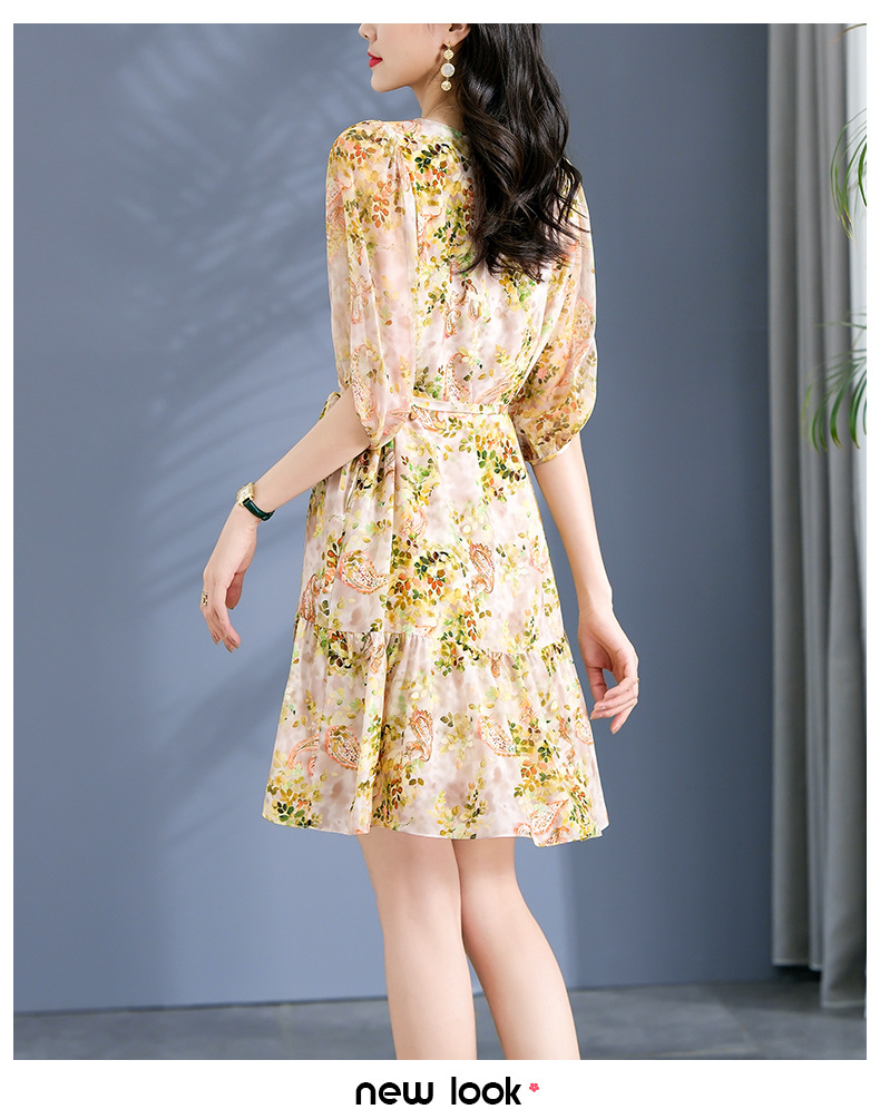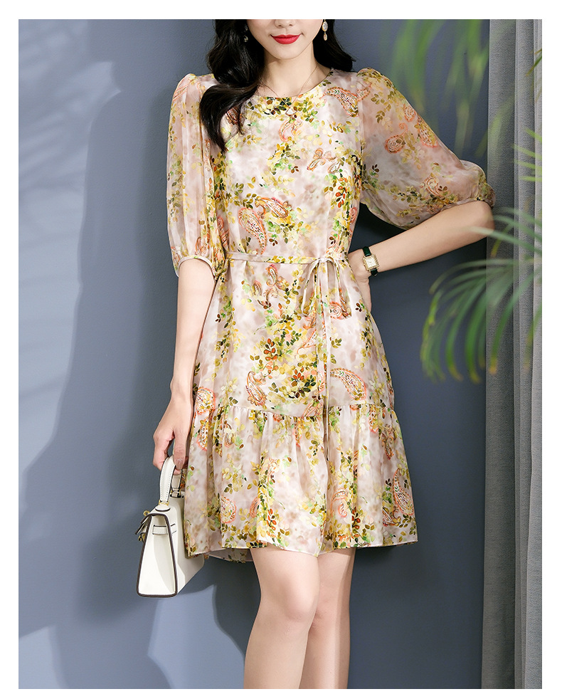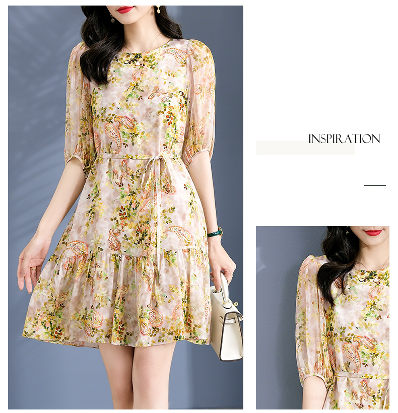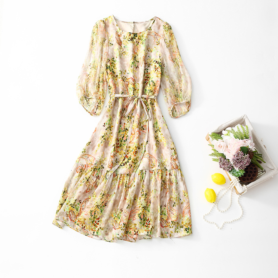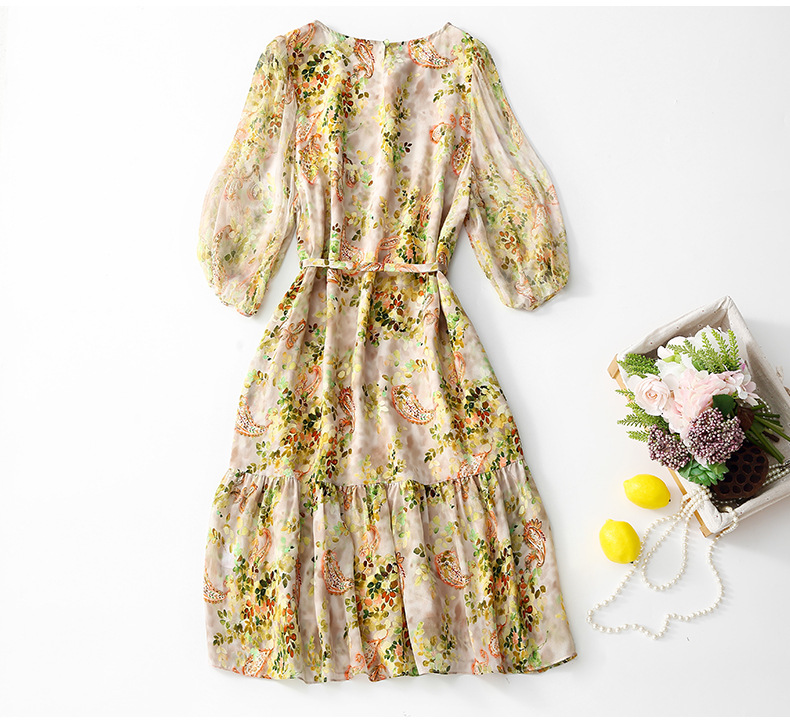 Chiếc váy này có phần cổ tròn và tay dài đến khuỷu tay, điểm nhấn là dải rút eo tạo form dáng. Chất liệu lụa mềm mại mang lại cảm giác dễ chịu khi mặc. Họa tiết cành lá cách điệu in trên nền vải, tạo vẻ đẹp nhẹ nhàng. Sản phẩm phù hợp cho những dịp sinh hoạt thường ngày hay dạo phố. Có thể giặt bằng tay và phơi trong bóng râm để giữ chất vải. | Tên sản phẩm: Váy Đầm Liền Thân Nữ Chất Liệu Lụa Tơ Tằm - Thời Trang Nữ | Mã sản phẩm: K6995 - Giá: 2.690.000đ | Mã nhà sản xuất: SHDA-G06Hình ảnh sản phẩm