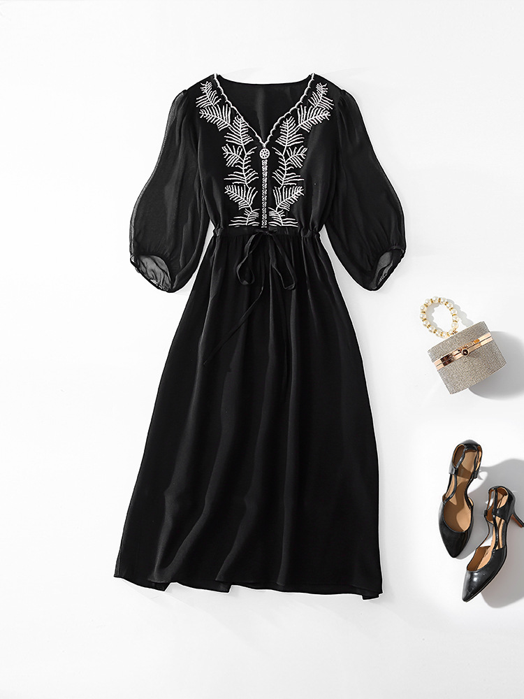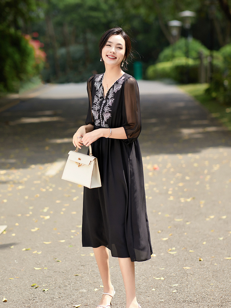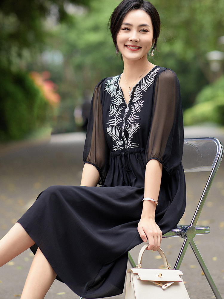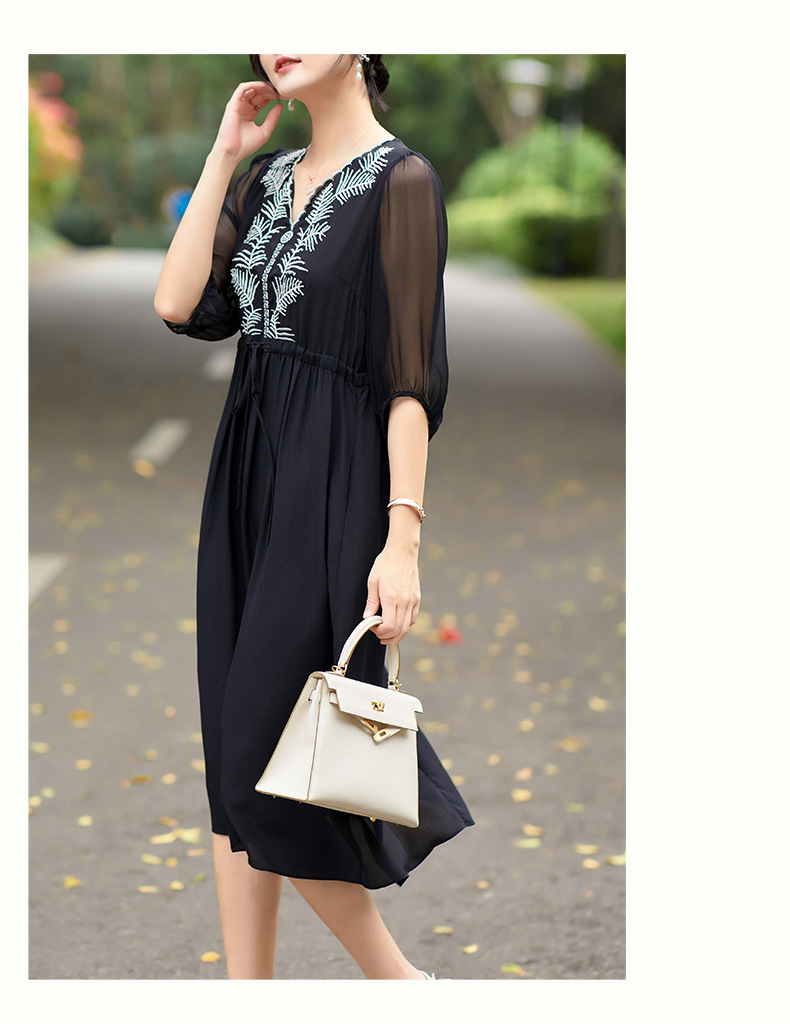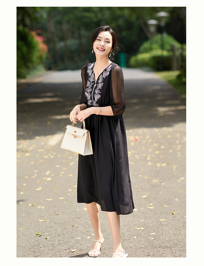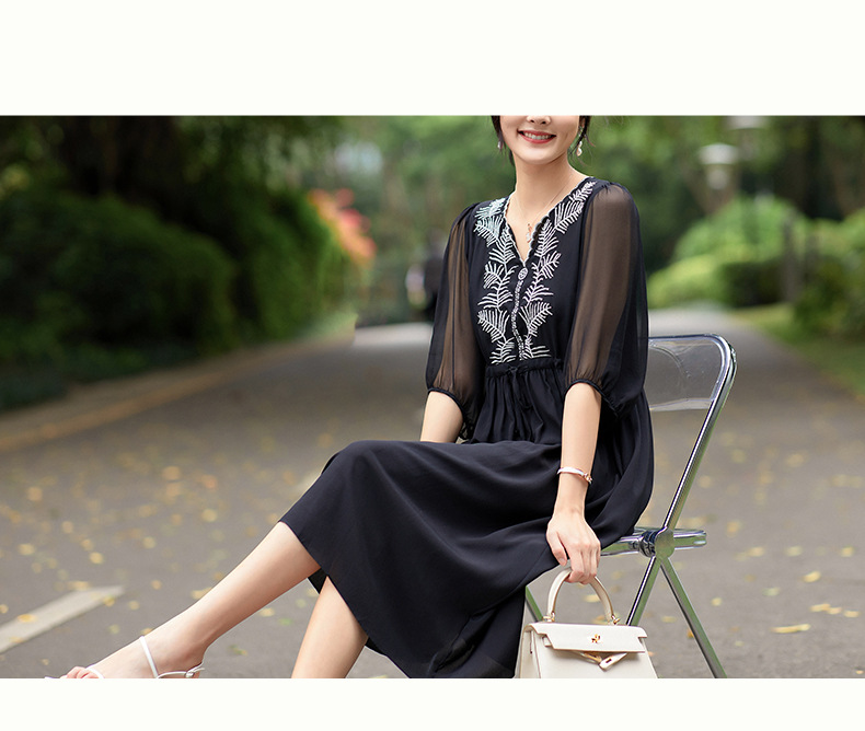 Đầm thun lụa mặc trong mùa ấm, kiểu dáng cổ tròn và tay ngắn rất dễ mặc. Chất vải mềm mại, thoáng mát, tạo cảm giác dễ chịu khi mặc cả ngày. Trên nền vải trơn có điểm những đường thêu tinh tế, tăng thêm nét đẹp mới lạ. Sản phẩm phù hợp cho nhiều hoàn cảnh sử dụng như đi làm, dạo phố hay dự tiệc nhẹ. Có thể giặt bằng tay hoặc máy với chế độ nhẹ để giữ form vải bền lâu. | Tên sản phẩm: Váy Đầm Liền Thân Nữ Chất Liệu Lụa Tơ Tằm Thêu Họa Tiết Hoa Hàng Mùa Hè - Thời Trang Nữ | Mã sản phẩm: K7010 - Giá: 3.150.000đ | Mã nhà sản xuất: SHDA-G06Hình ảnh sản phẩm