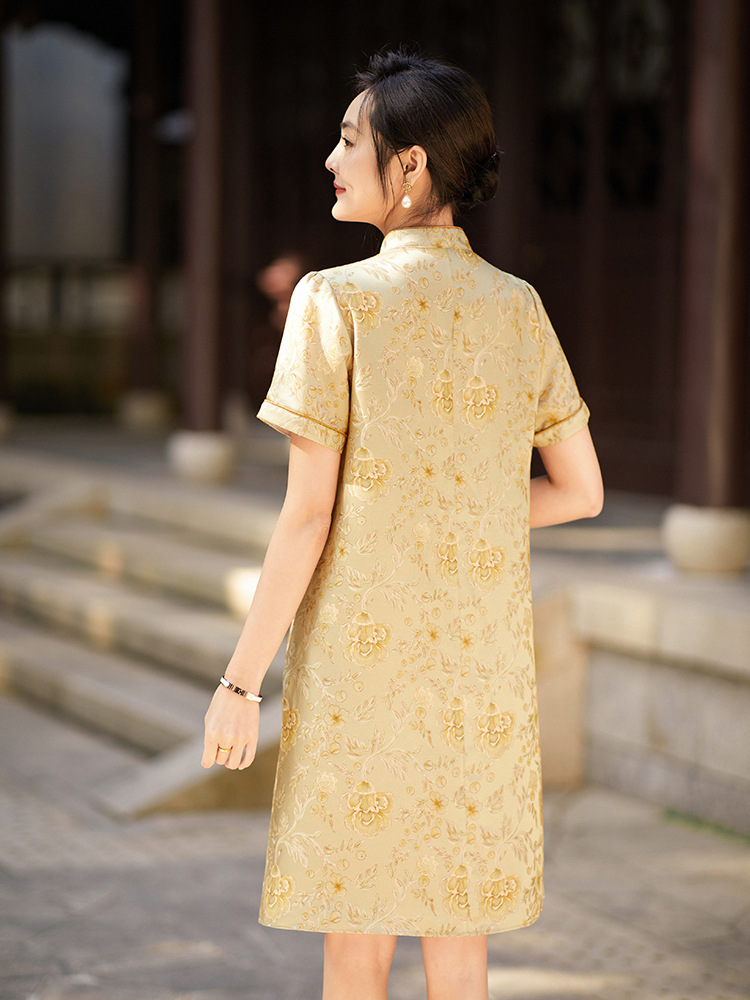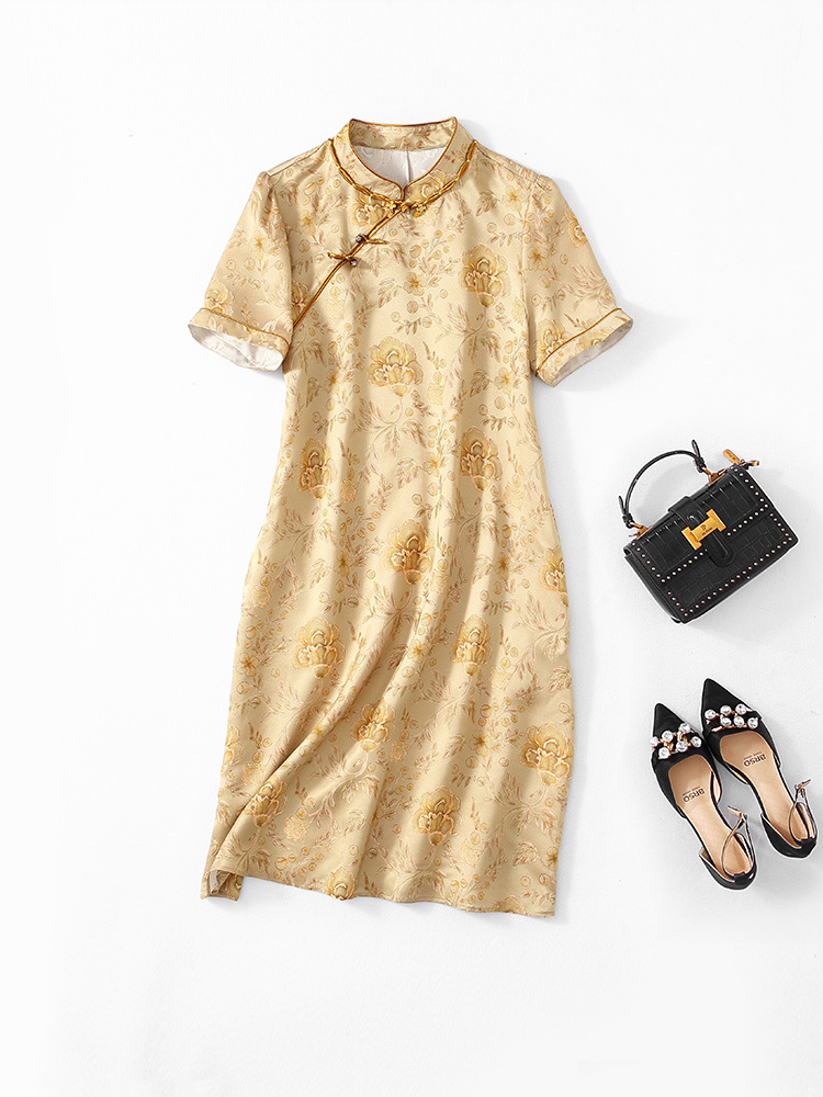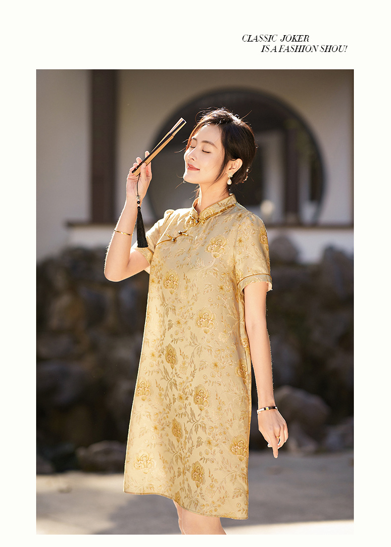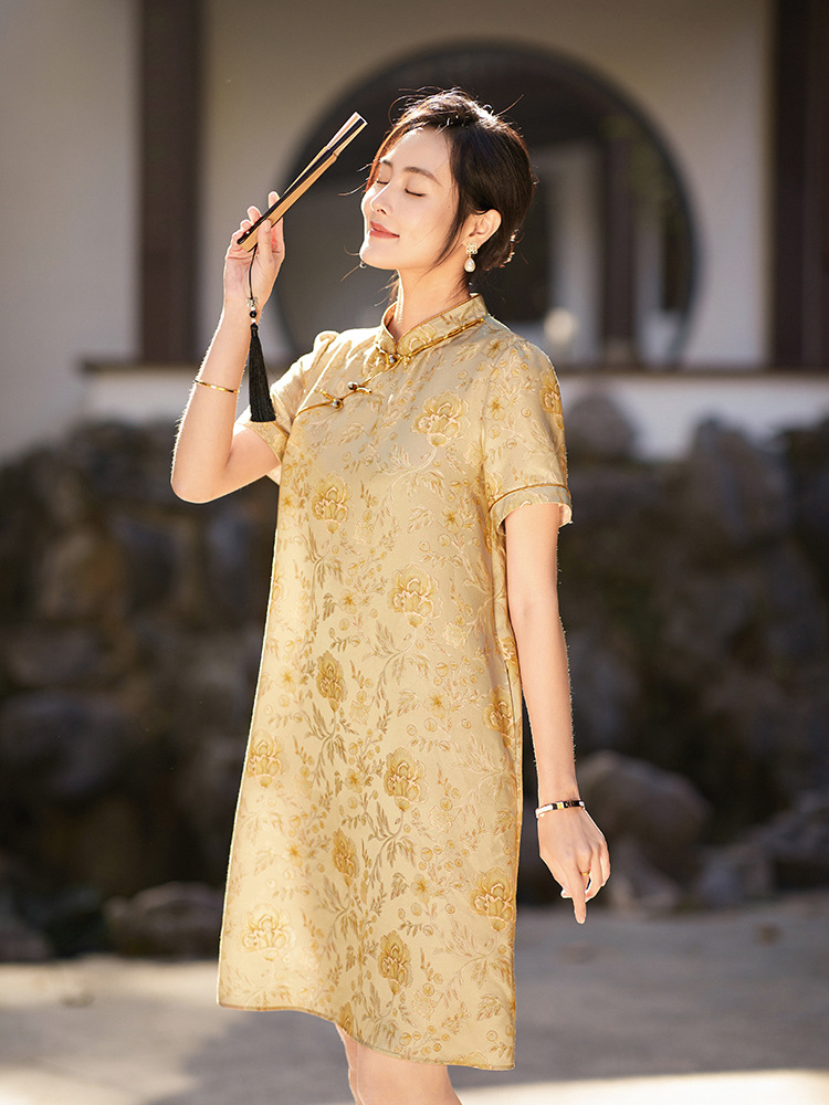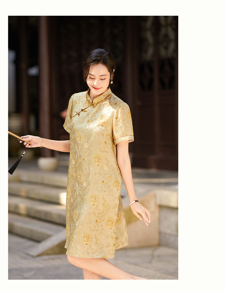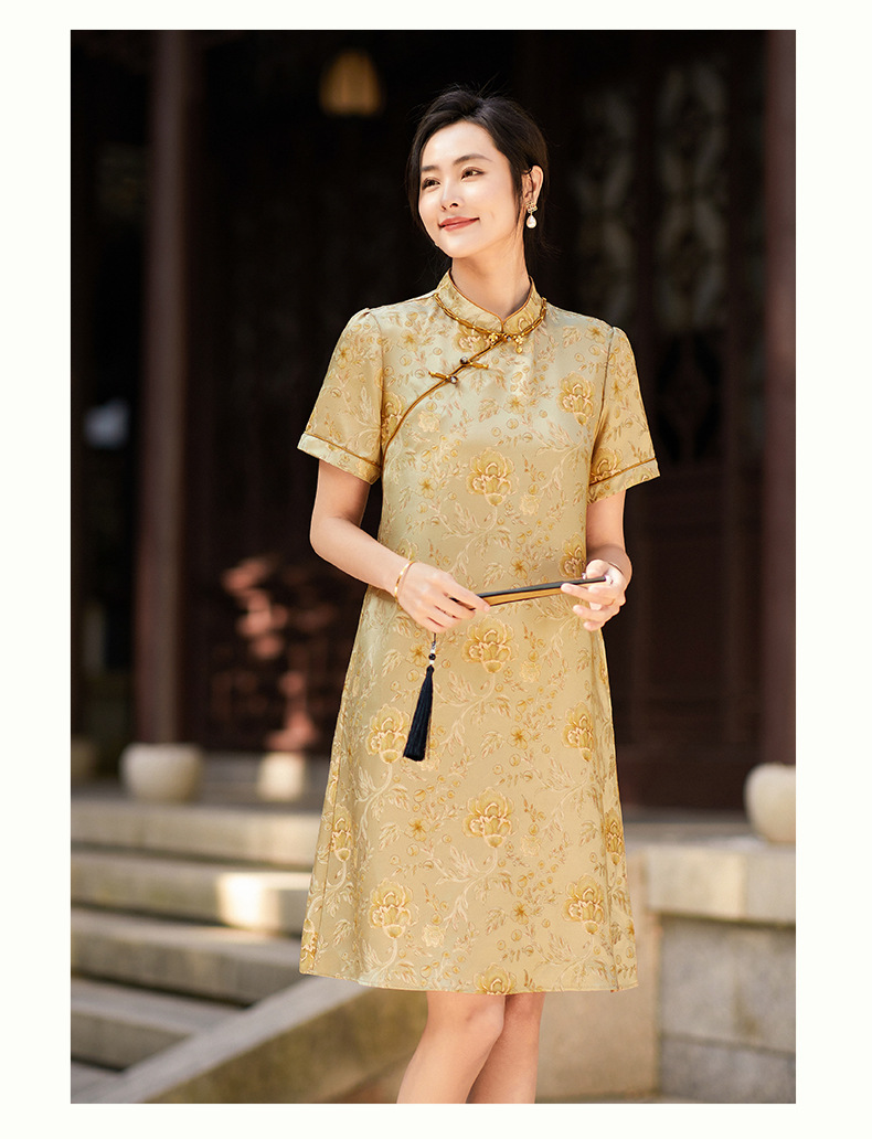 Chiếc đầm dáng áo dài cách tân này được dệt từ chất liệu lụa mềm mại, có họa tiết hoa văn nổi bật nhờ sợi kim tuyến ánh vàng. Thiết kế ôm nhẹ cơ thể, tôn dáng cho người mặc. Sản phẩm phù hợp để mặc trong các dịp lễ, họp mặt gia đình. Bạn chỉ cần giặt nhẹ bằng nước lạnh và phơi nơi râm mát để giữ form vải và màu sắc được bền đẹp. | Tên sản phẩm: Váy Đầm Liền Thân Nữ Chất Liệu Lụa Tơ Tằm Họa Tiết Hoa Trung Niên - Thời Trang Nữ | Mã sản phẩm: K7027 - Giá: 3.560.000đ | Mã nhà sản xuất: SHDA-G06Hình ảnh sản phẩm