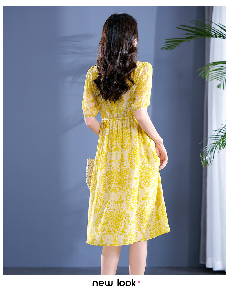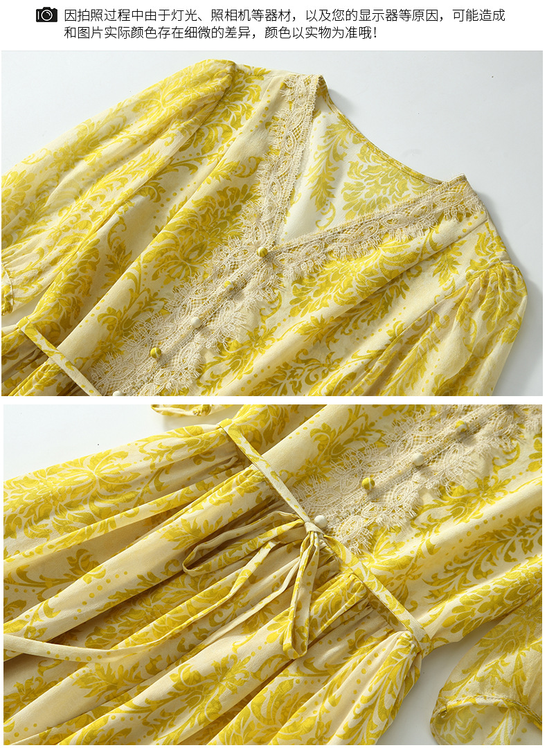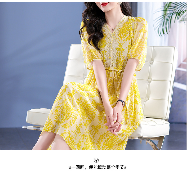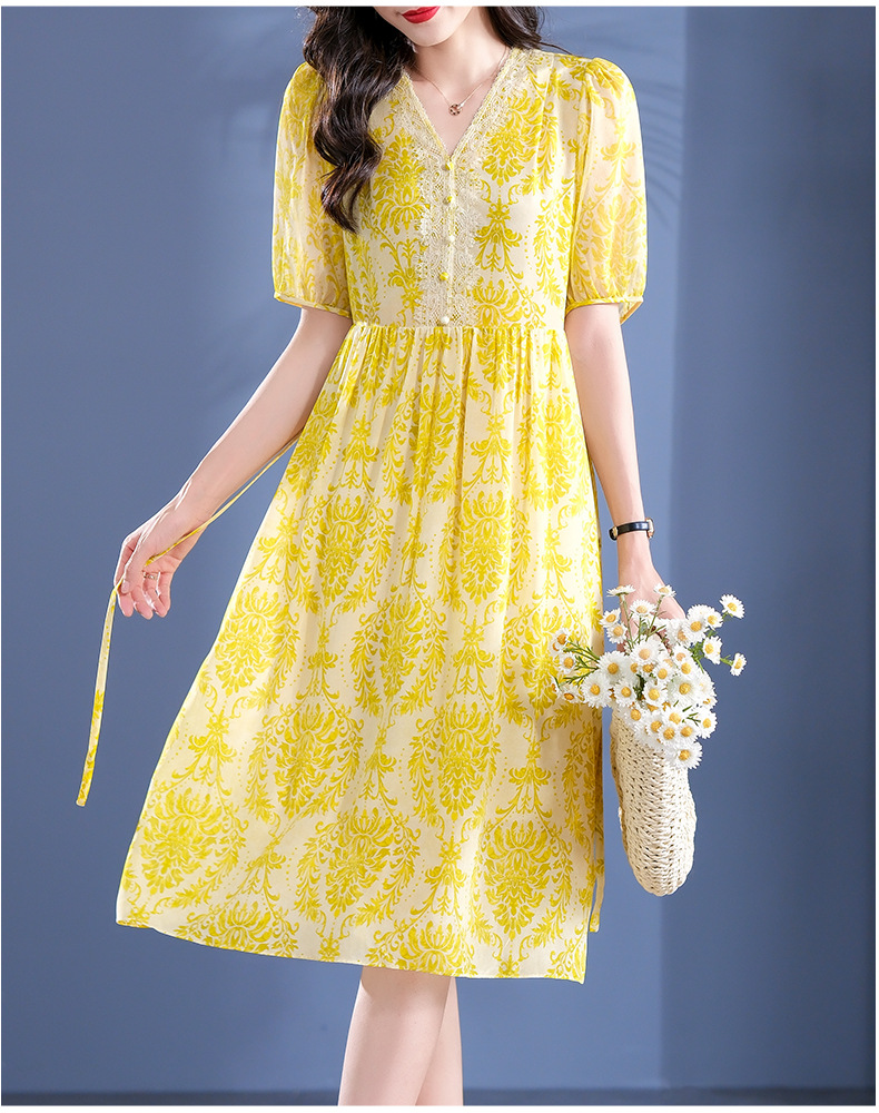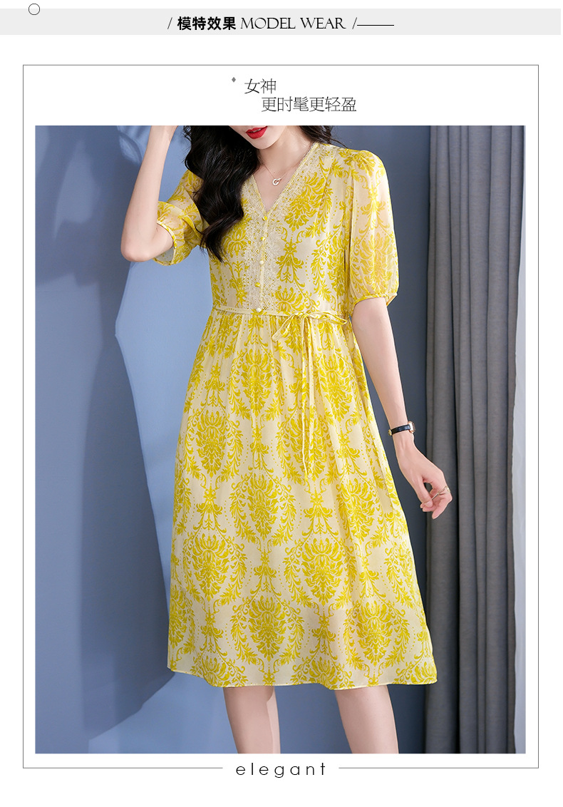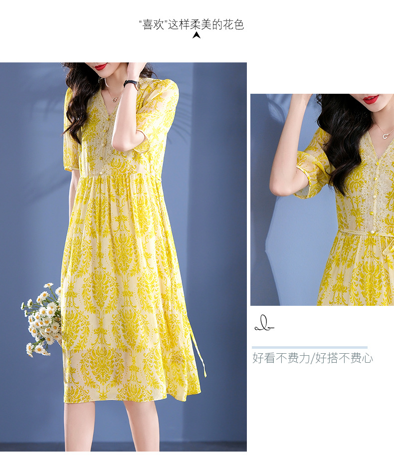 Chiếc đầm này có điểm nhấn là phần cổ khoét sâu tạo dáng chữ V thanh thoát. Viền cổ và tay áo được điểm xuyến bằng đường diềm ren tinh tế. Chất liệu chính là lụa in họa tiết mềm mại, nhẹ nhàng. Kiểu dáng ôm nhẹ cơ thể, phù hợp cho nhiều dịp gặp gỡ. Có thể mặc đi làm, dự tiệc nhẹ hoặc dạo phố. Giặt bằng tay với nước lạnh và phơi trong bóng mát để giữ dáng đầm bền lâu. | Tên sản phẩm: Váy Đầm Liền Thân Nữ Chất Liệu Lụa Tơ Tằm Họa Tiết Hoa Cổ Chữ V - Thời Trang Nữ | Mã sản phẩm: K7051 - Giá: 2.760.000đ | Mã nhà sản xuất: SHDA-G06Hình ảnh sản phẩm