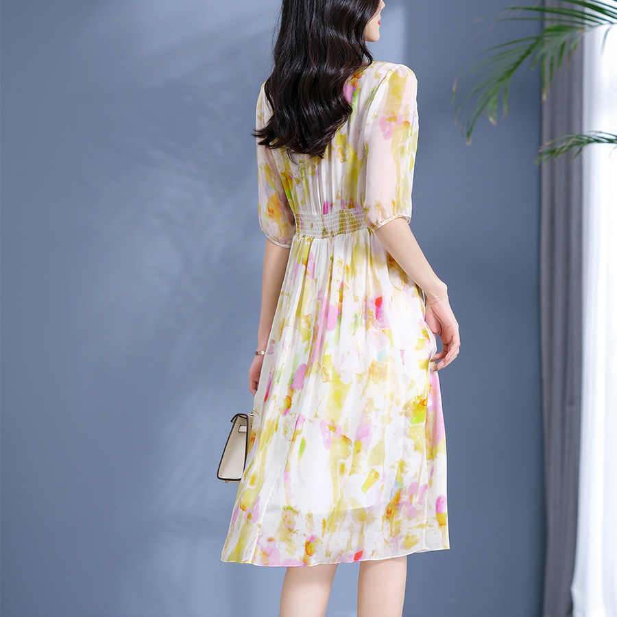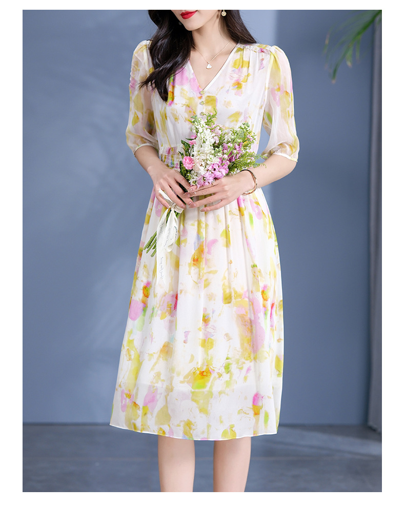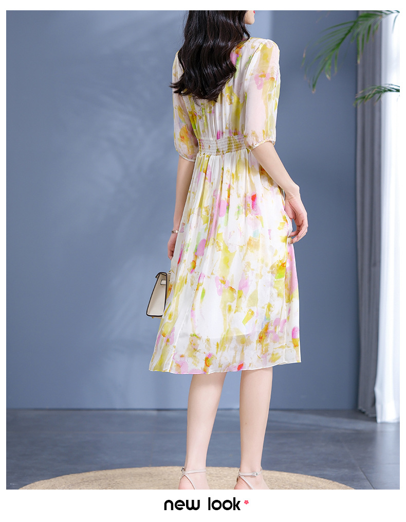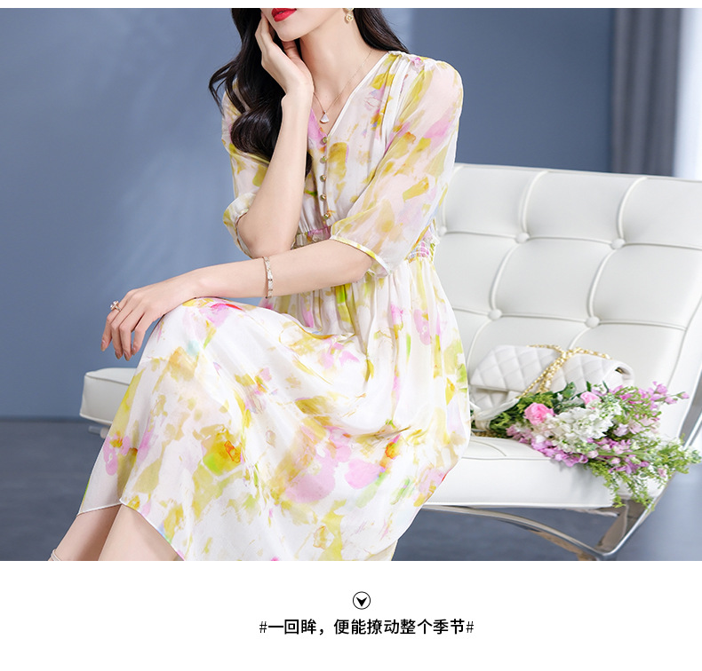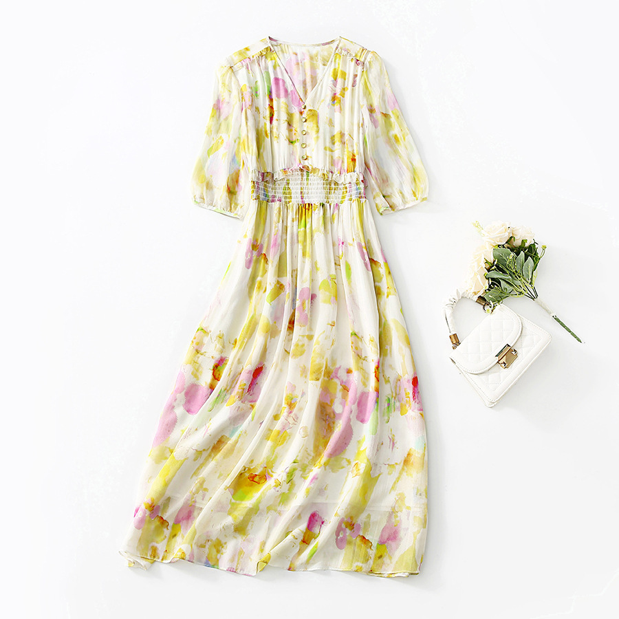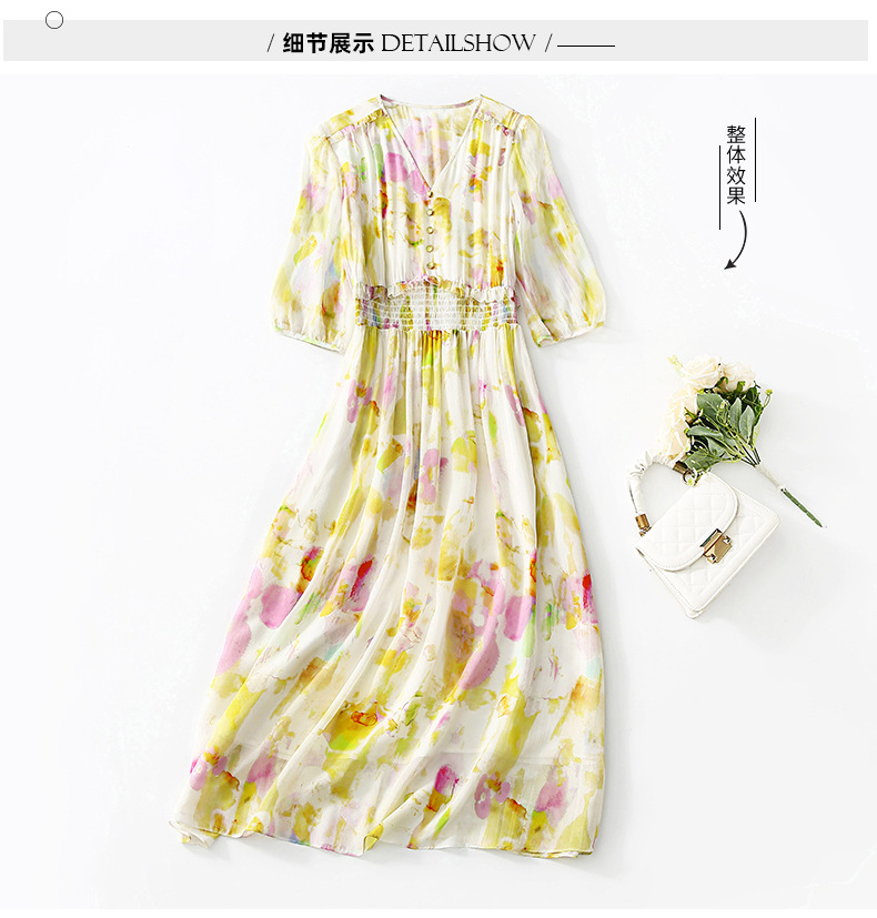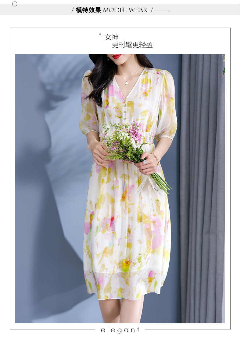 Chiếc váy này được làm từ chất liệu lụa mềm mại và thoáng mát, mang đến cảm giác dễ chịu khi mặc. Thiết kế có cổ chữ V và hàng cúc đơn phía trước, tạo điểm nhấn thanh lịch. Đặc biệt, phần eo được may hoàn toàn bằng dây thun co giãn, ôm nhẹ vào vòng eo một cách thoải mái và dễ dàng điều chỉnh. Bạn có thể mặc chiếc váy này trong nhiều dịp, từ đi làm đến những buổi gặp mặt thông thường. | Tên sản phẩm: Váy Đầm Liền Thân Nữ Chất Liệu Lụa Tơ Tằm Cổ Chữ V - Thời Trang Nữ | Mã sản phẩm: K7109 - Giá: 2.820.000đ | Mã nhà sản xuất: SHDA-G06Hình ảnh sản phẩm