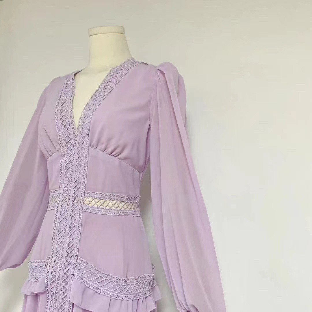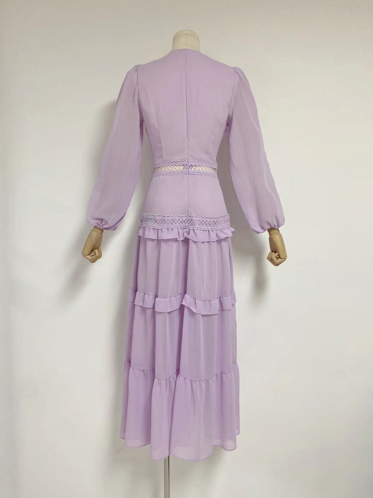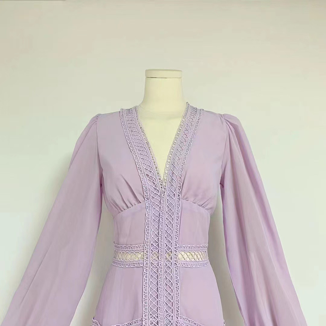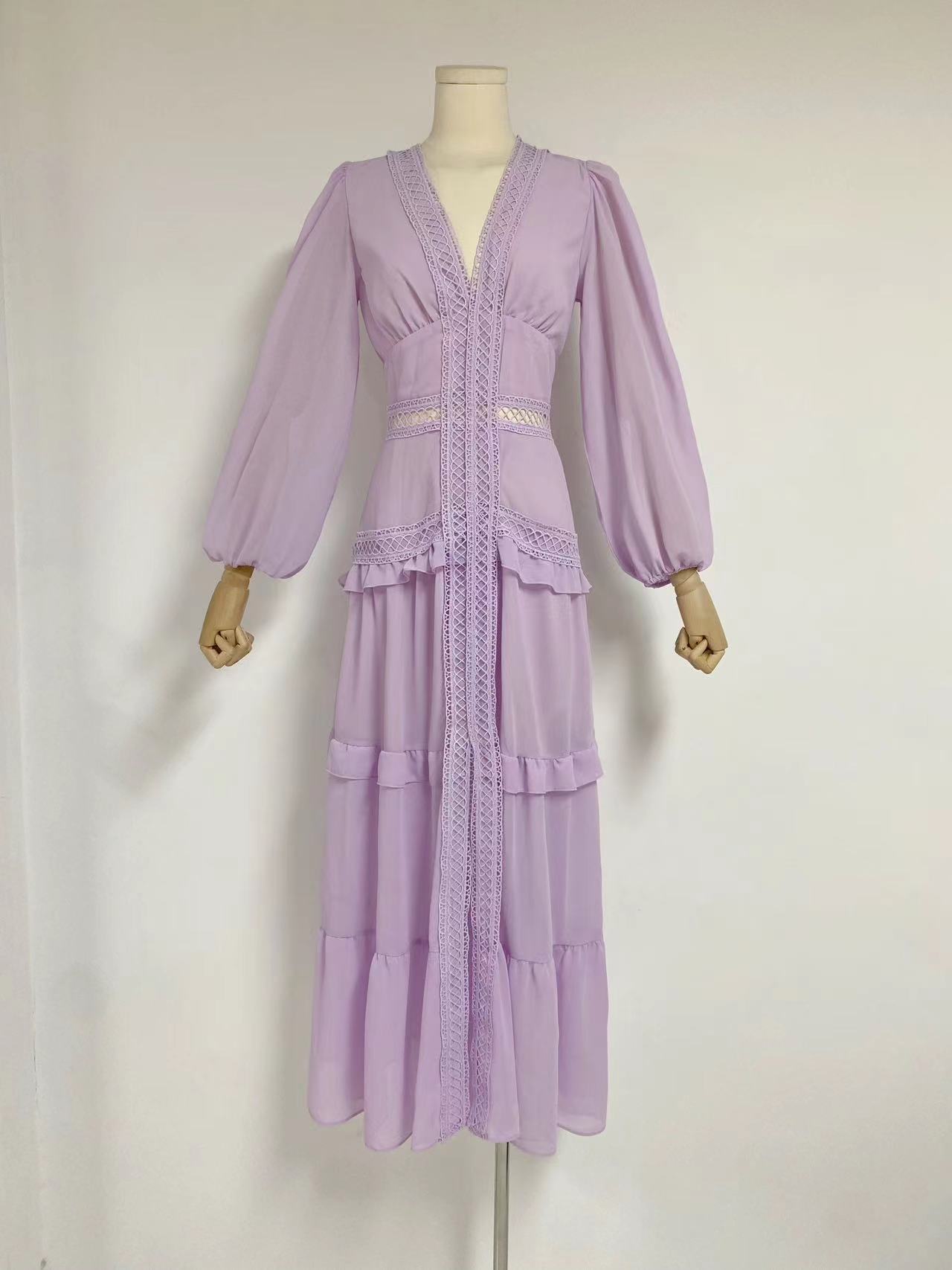 Chiếc đầm dài mang sắc tím dịu dàng, được may từ chất liệu voan mềm mại giúp tôn dáng người mặc. Thiết kế có cổ chữ V, kết hợp đường viền tay và phần chân váy xòe rộng tạo điểm nhấn duyên dáng. Điểm cộng là chi tiết đăng ten nơi ngực và đường xẻ nhẹ ở phần thân dưới, giúp tăng thêm nét nữ tính và thoải mái khi di chuyển. Sản phẩm phù hợp để mặc trong nhiều dịp khác nhau. | Tên sản phẩm: Váy Đầm Liền Thân Dáng Dài Nữ Chất Liệu Vải Voan Cổ Chữ V Hàng Mùa Xuân Thu Đông Phong Cách Âu Mỹ - Thời Trang Nữ | Mã sản phẩm: K7419 - Giá: 1.880.000đ | Mã nhà sản xuất: GUDG-G05Hình ảnh sản phẩm