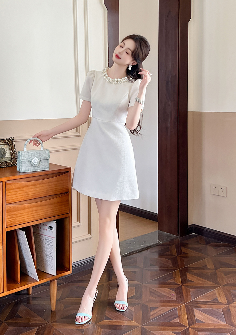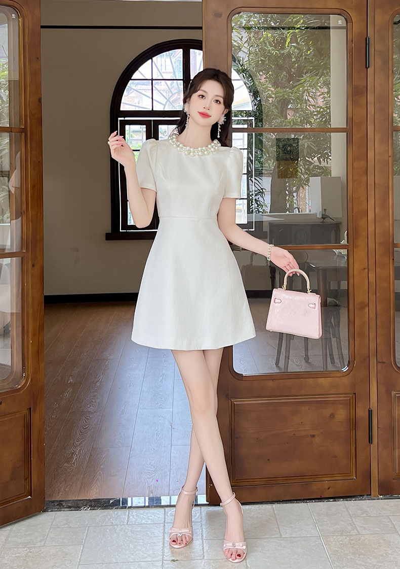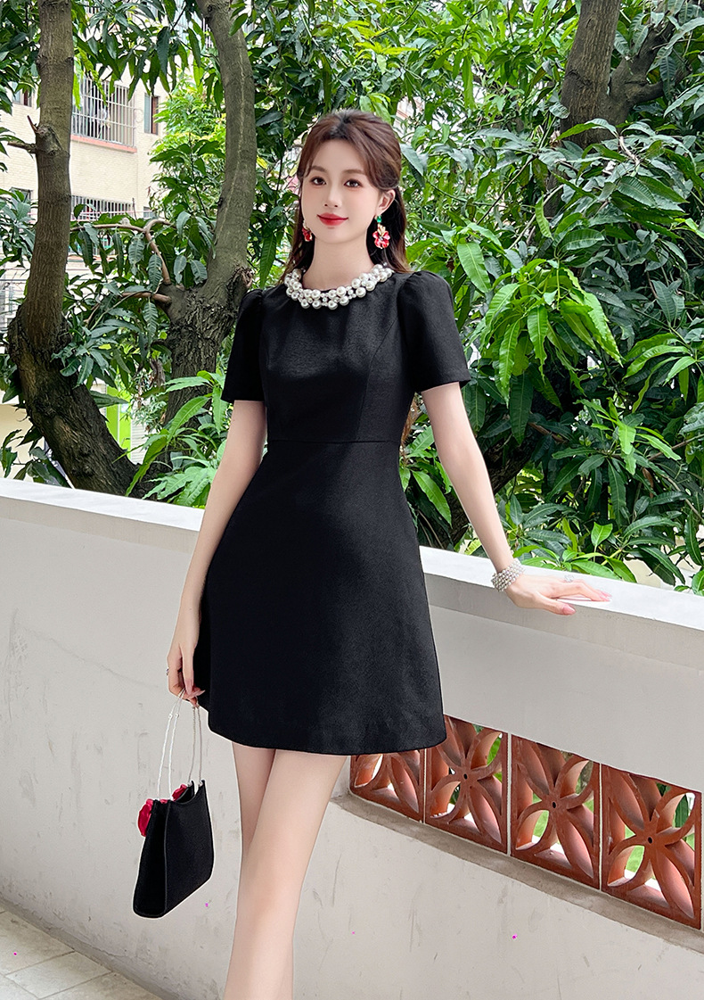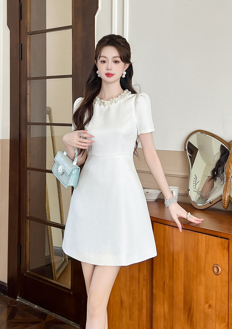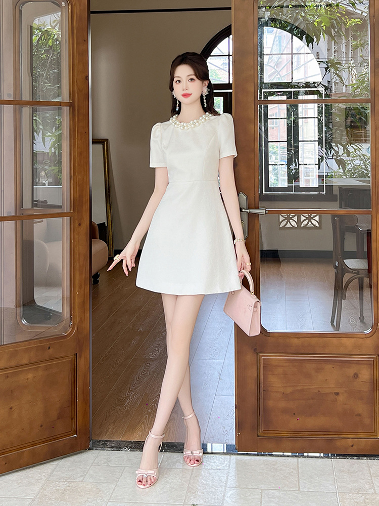 Chiếc đầm ngắn tay cổ điển này có điểm nhấn là những hạt ngọc tr được kết tinh xảo dọc thân. Thiết kế ôm eo nhẹ nhàng, xòe nhẹ ở phần váy tạo dáng chữ A thanh thoát, giúp tôn lên những đường nét cơ thể. Chất vải dày dặn mang đến cảm giác mặc thoải mái và chỉn chu. Sản phẩm phù hợp cho nhiều dịp trong ngày, từ đi làm đến các buổi gặp mặt. | Tên sản phẩm: Váy Đầm Liền Thân Nữ Dáng Chữ A Hàng Mùa Hè - Thời Trang Nữ | Mã sản phẩm: K7632 - Giá: 1.120.000đ | Mã nhà sản xuất: CHDG-G04Hình ảnh sản phẩm