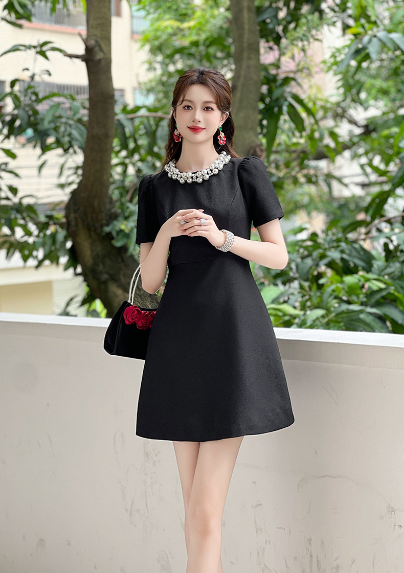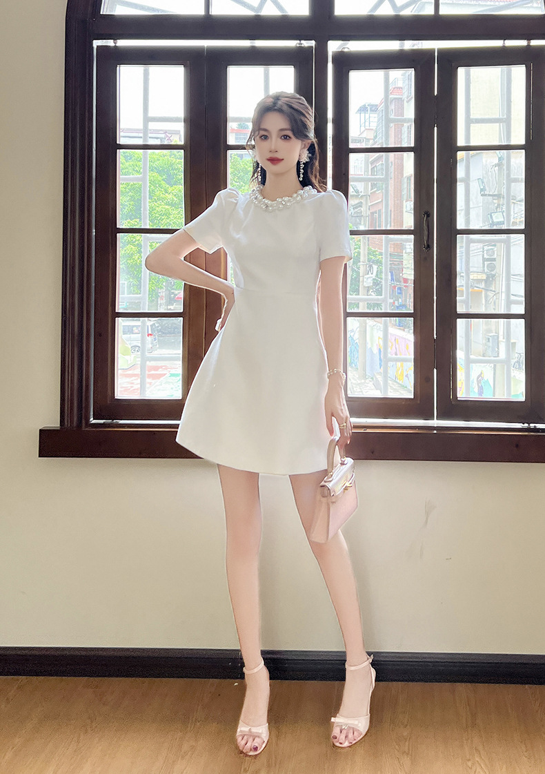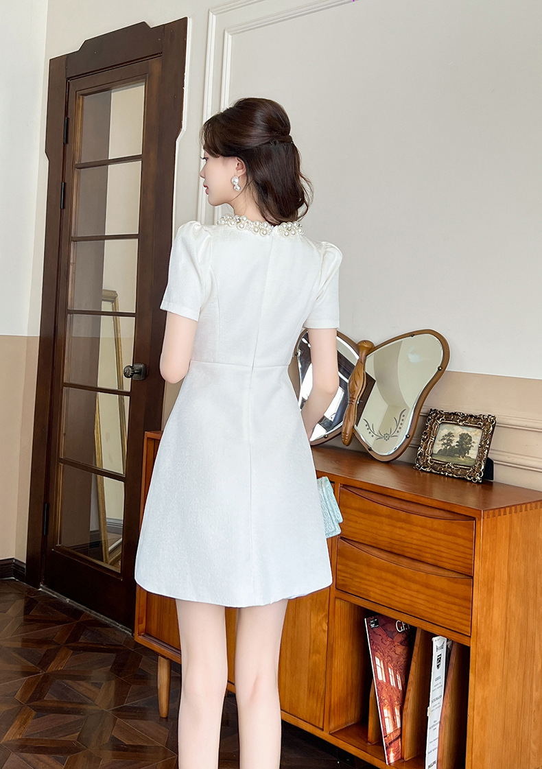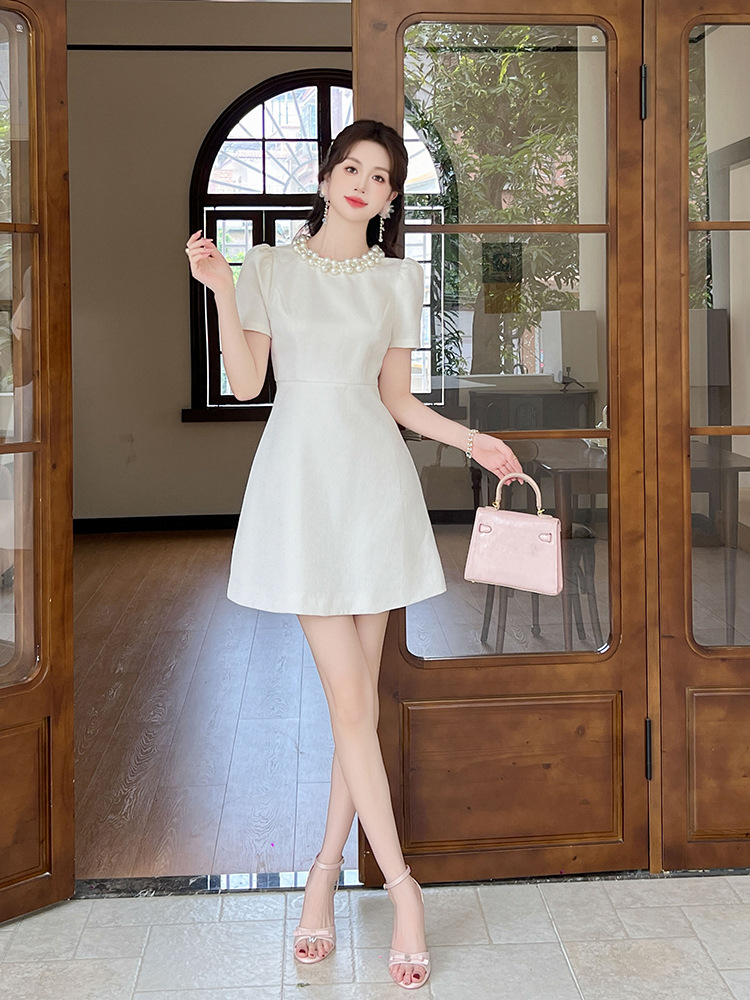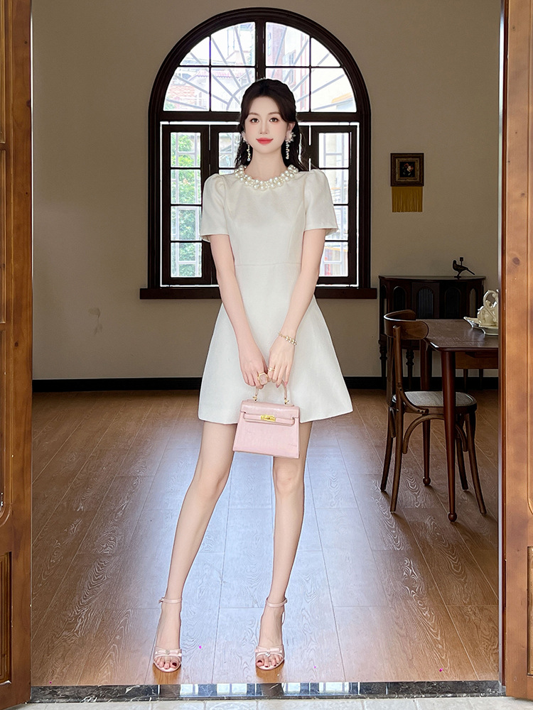 Chiếc đầm ngắn tay cổ điển này có điểm nhấn là những hạt ngọc tr được kết tinh xảo dọc thân. Thiết kế ôm eo nhẹ nhàng, xòe nhẹ ở phần váy tạo dáng chữ A thanh thoát, giúp tôn lên những đường nét cơ thể. Chất vải dày dặn mang đến cảm giác mặc thoải mái và chỉn chu. Sản phẩm phù hợp cho nhiều dịp trong ngày, từ đi làm đến các buổi gặp mặt. | Tên sản phẩm: Váy Đầm Liền Thân Nữ Dáng Chữ A Hàng Mùa Hè - Thời Trang Nữ | Mã sản phẩm: K7632 - Giá: 1.120.000đ | Mã nhà sản xuất: CHDG-G04Hình ảnh sản phẩm