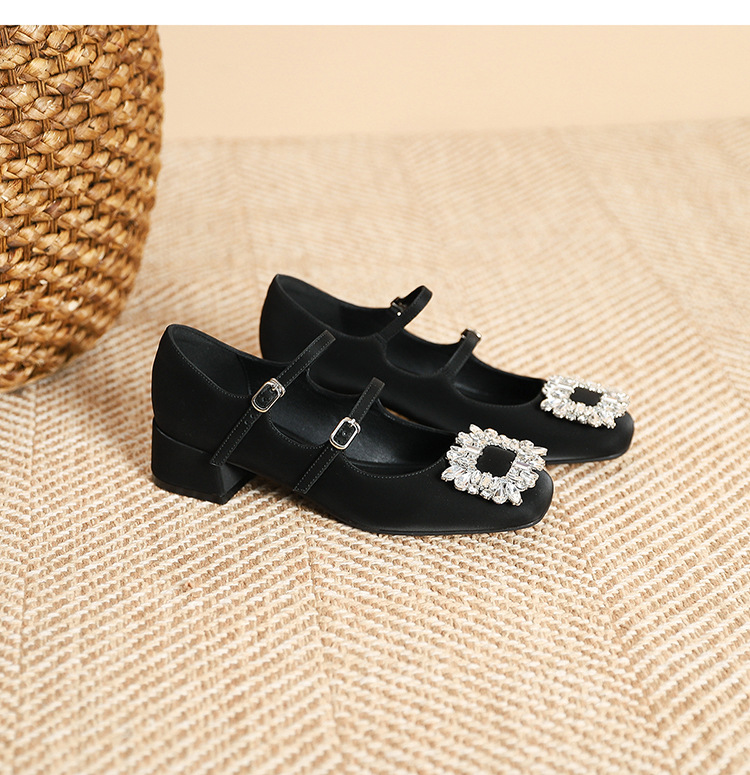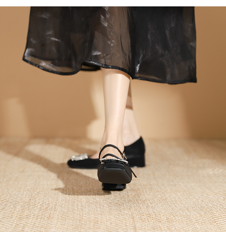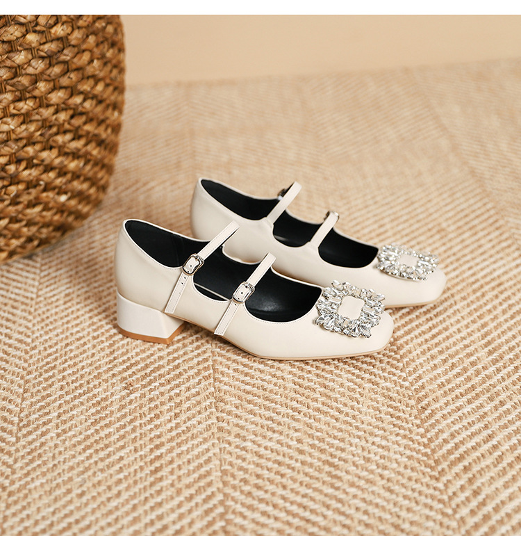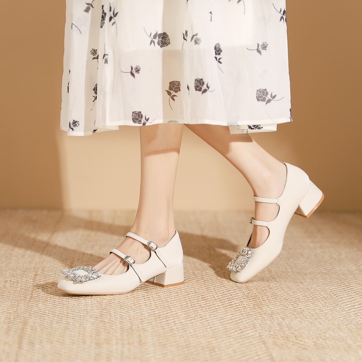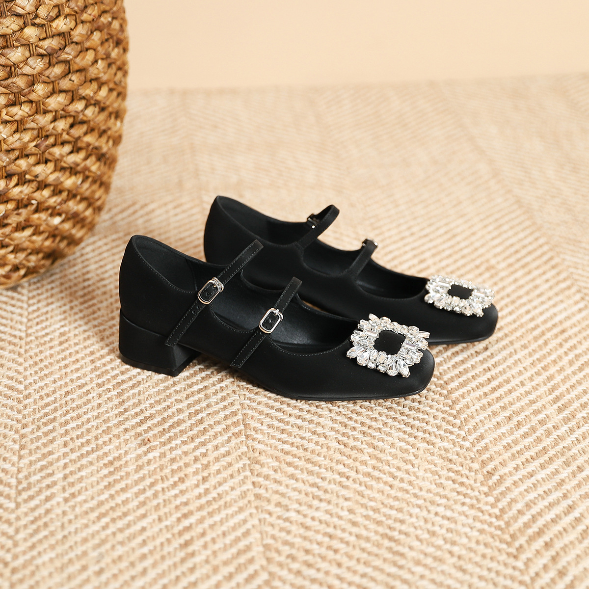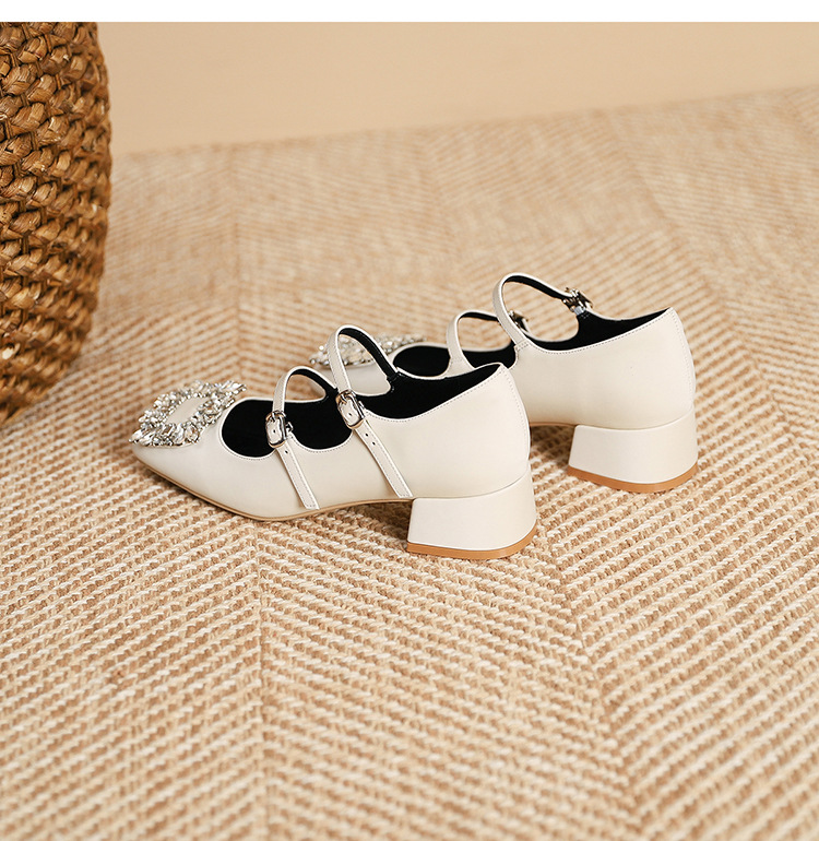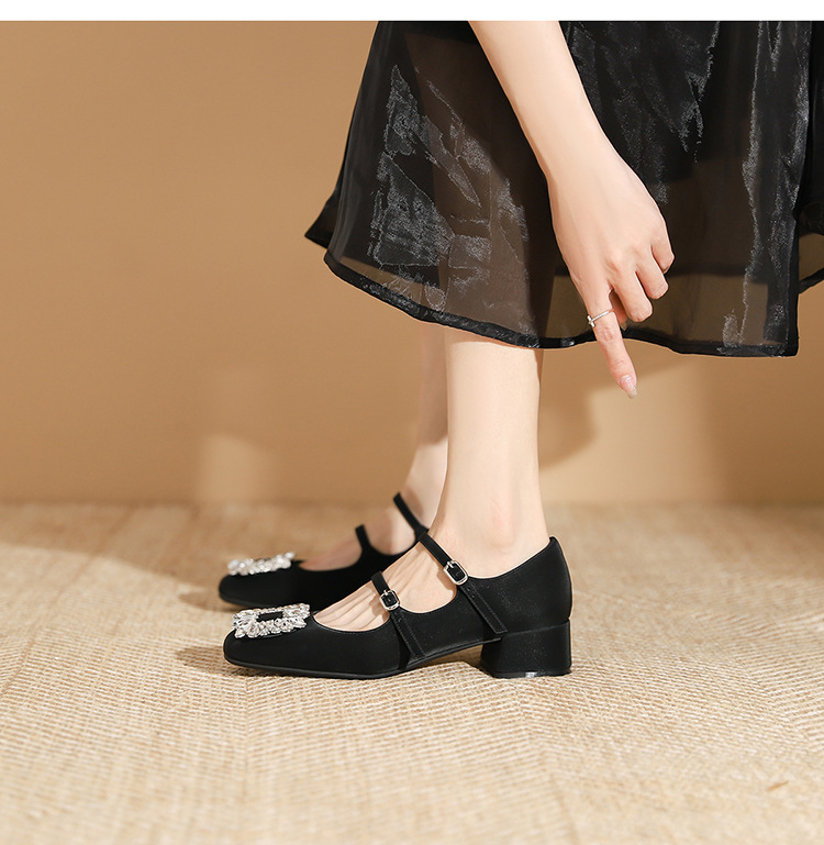 Đôi giày này có phần mũi vuông thanh lịch, được điểm xuyến những viên đá lấp lánh tạo nên nét thu hút riêng. Kiểu dáng giày Mary Jane cổ điển với quai ngang mảnh m và có khóa cài tiện lợi. Phần gót chân vừa phải giúp nâng đỡ bàn chân một cách thoải mái trong nhiều giờ liền. Cổ giàu ôm vừa vặn, tôn lên vẻ dịu dàng. Bạn có thể dễ dàng phối cùng váy hoặc quần để tạo nên những phong cách khác nhau. | Tên sản phẩm: Giày Cao Gót Nữ Gắn Đá Gót Vuông Quai Hậu - Giày Dép Nữ | Mã sản phẩm: L0333 - Giá: 870.000đ | Mã nhà sản xuất: HUDSH-G03Hình ảnh sản phẩm