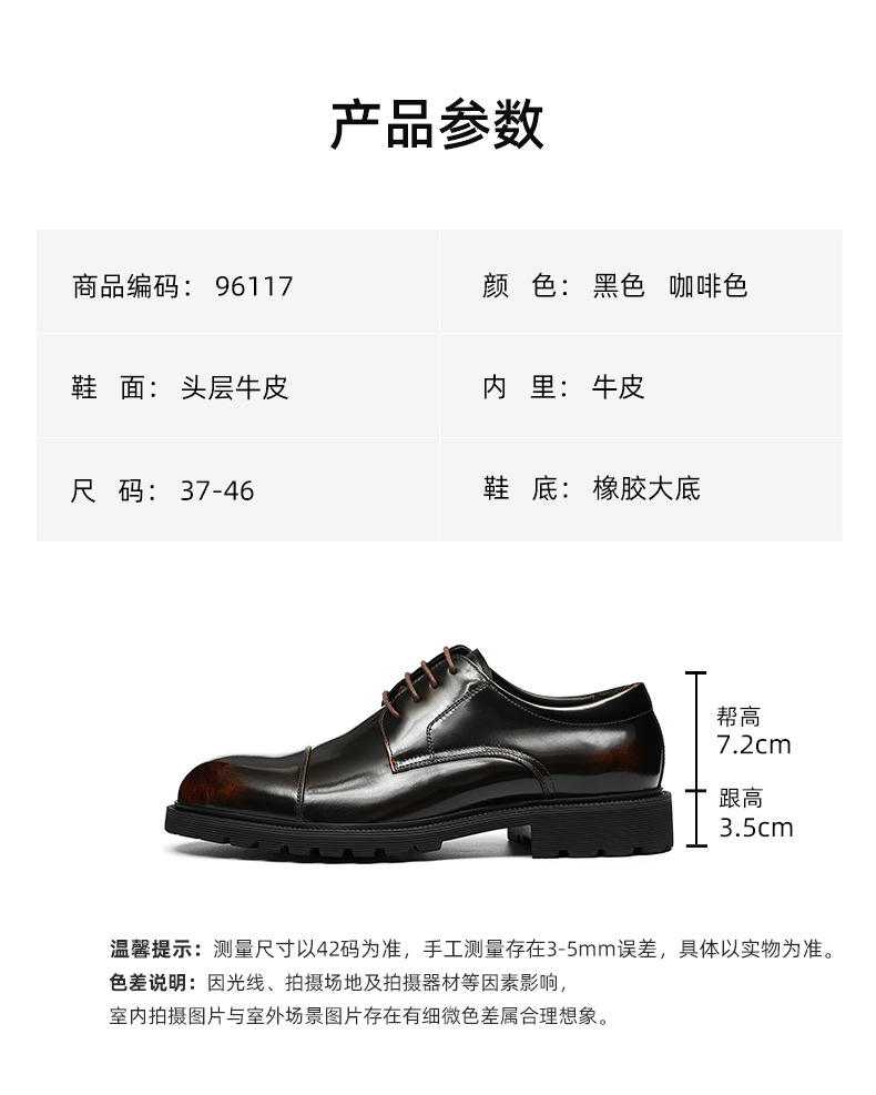 Giày da thật dành cho nam, kiểu dáng kết hợp ba phần ở mũi tạo đường nét thanh lịch. Mũi giày tròn và đế dày mang đến vẻ ngoại hình khỏe khoắn. Bề mặt giày được đánh bóng cẩn thận, tạo độ bóng đẹp mắt. Sản phẩm phù hợp cho cả công sở và những dịp giao lưu thường ngày. Khi sử dụng, nên vệ sinh bằng khăn mềm và bảo quản nơi thoáng mát để giữ giày bền đẹp. | Tên sản phẩm: Giày Da Nam Chất Liệu Da Bò Mũi Tròn Đế Cao - Giày Dép Nam | Mã sản phẩm: L0348 - Giá: 2.310.000đ | Mã nhà sản xuất: SHERAW-G05Hình ảnh sản phẩm