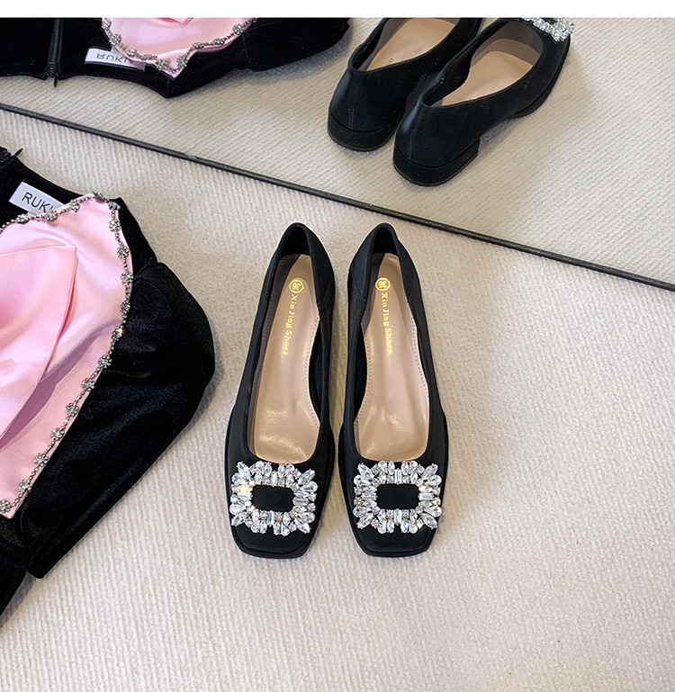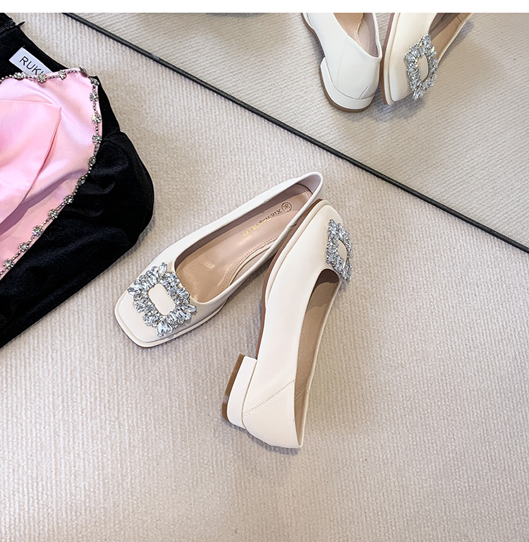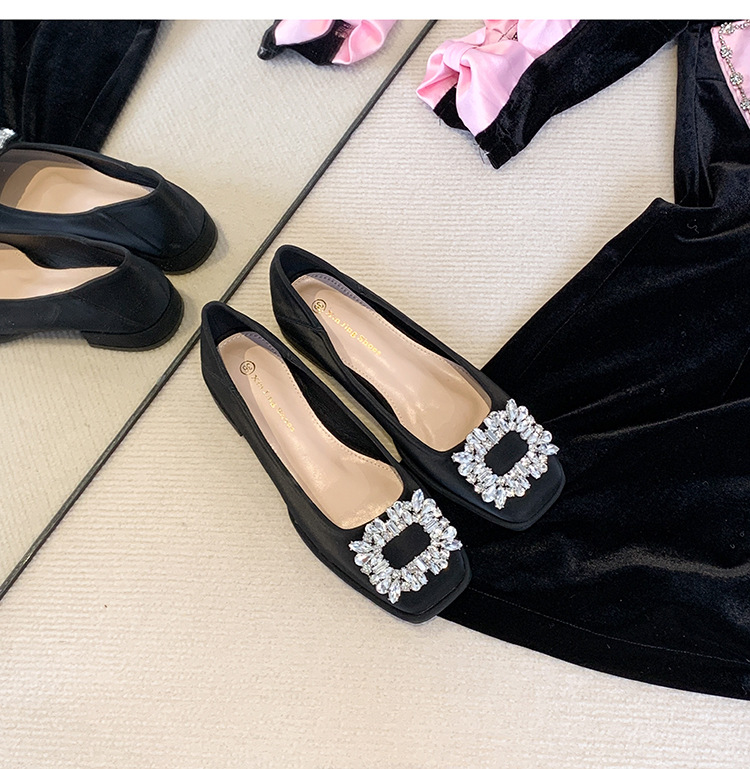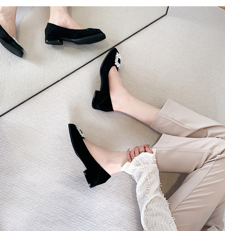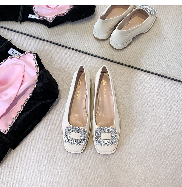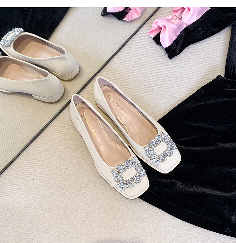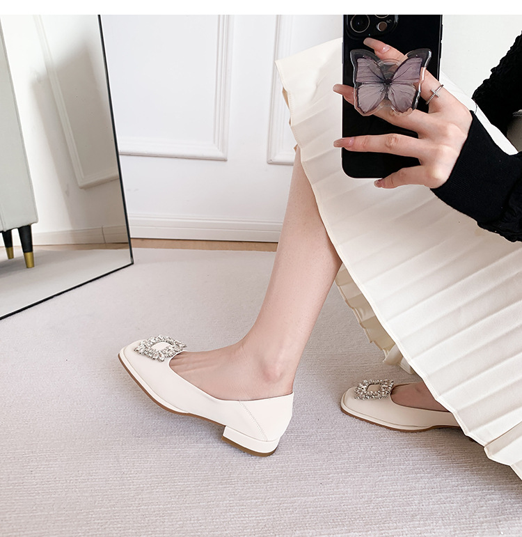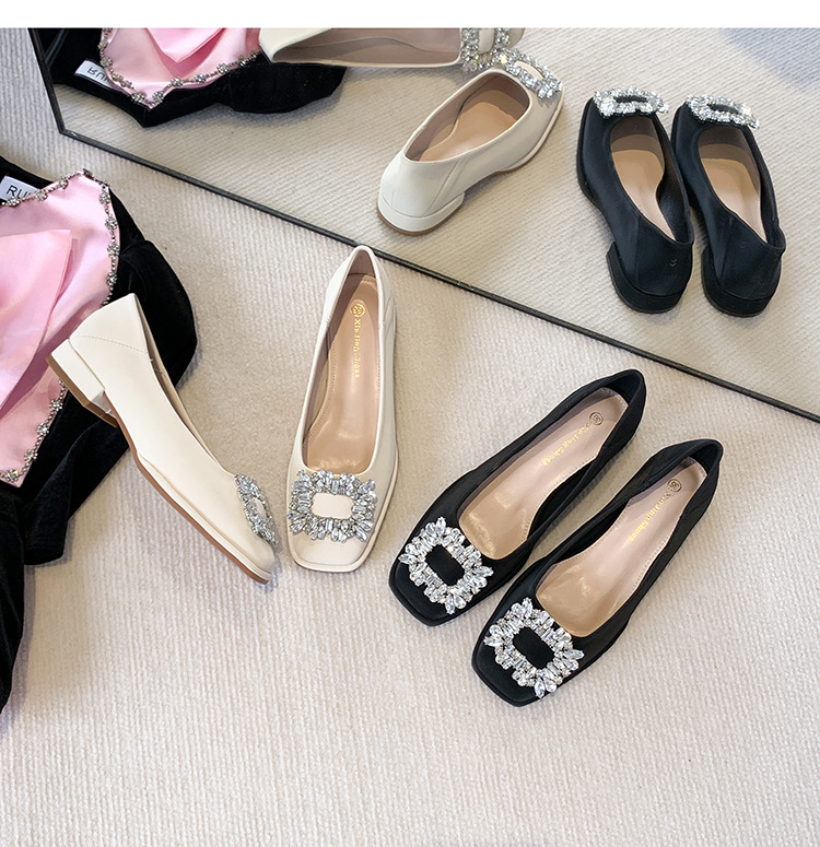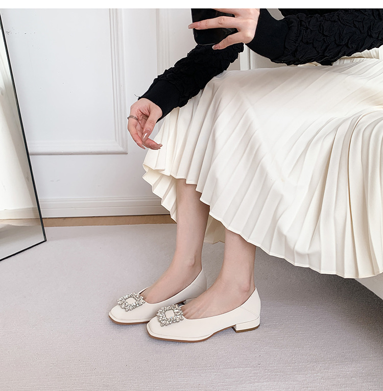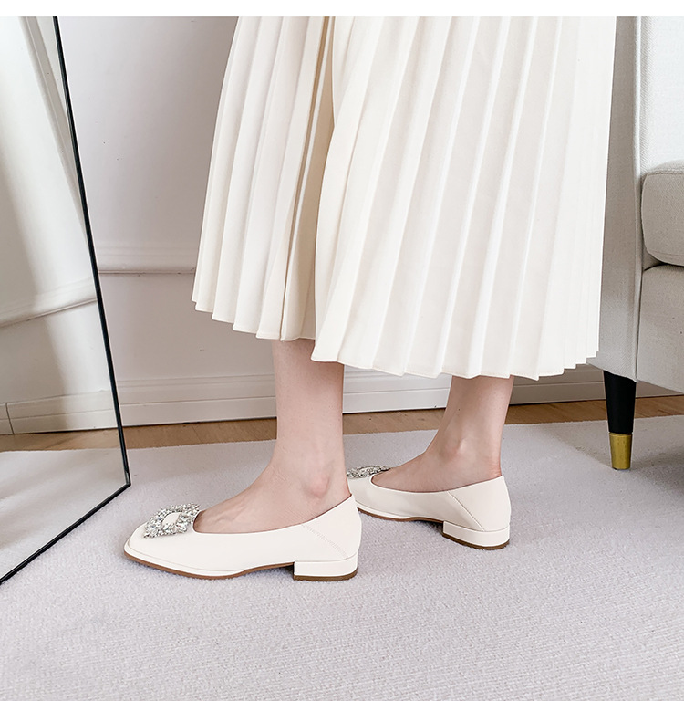 Đôi giày này có phần mũi vuông nhỏ nhắn, điểm nhấn là chiếc khóa hình vuông gắn đá lấp lánh ở phía trước. Đế bằng phẳng và thấp giúp nâng đỡ bàn chân một cách thoải mái cho cả ngày dài. Kiểu dáng cổ thấp, dễ dàng phối hợp với nhiều trang phục khác nhau như quần âu hay váy để đi làm hoặc dạo phố. Chỉ cần xỏ vào là có thể mang ngay, rất tiện lợi và nhanh chóng. | Tên sản phẩm: Giày Bệt Nữ Gắn Đá Hàng Mùa Xuân Thu Đông - Giày Dép Nữ | Mã sản phẩm: L0379 - Giá: 770.000đ | Mã nhà sản xuất: HUDSH-G02Hình ảnh sản phẩm