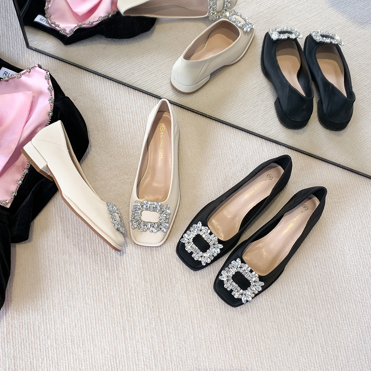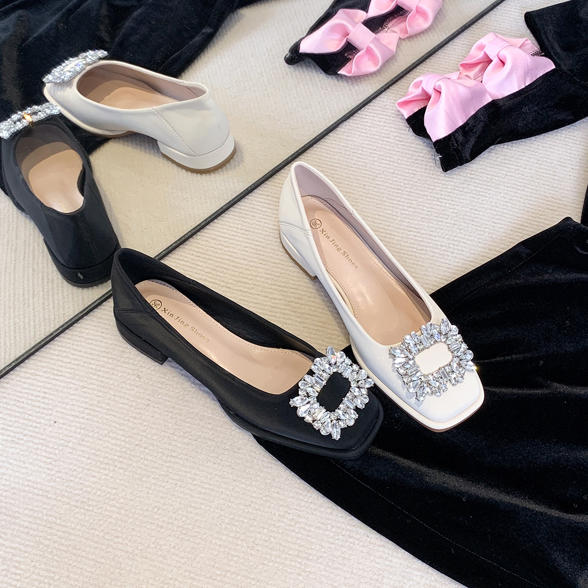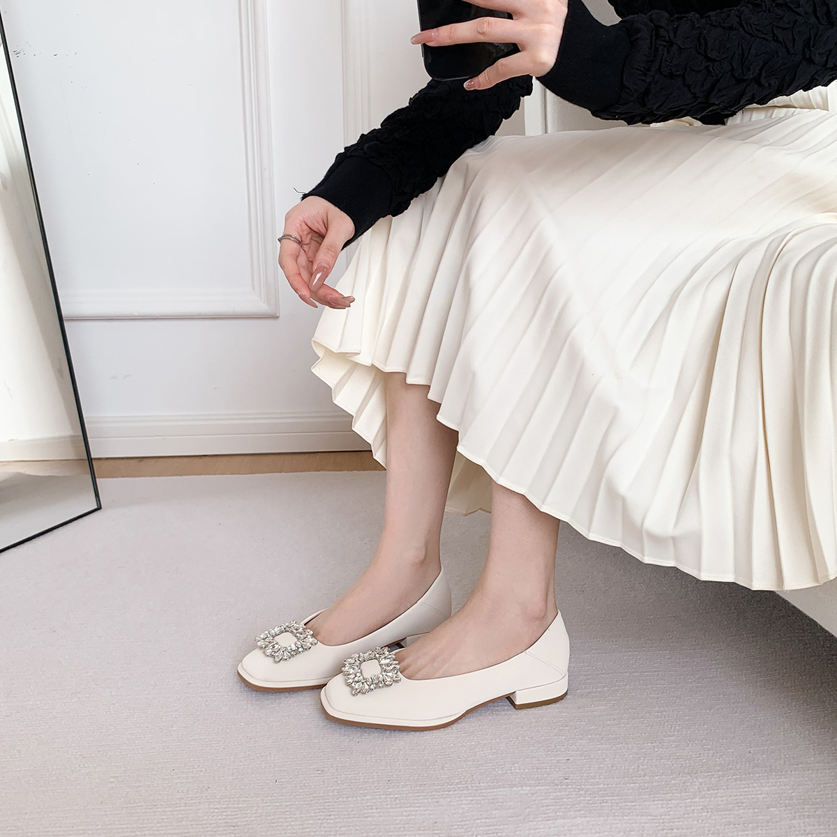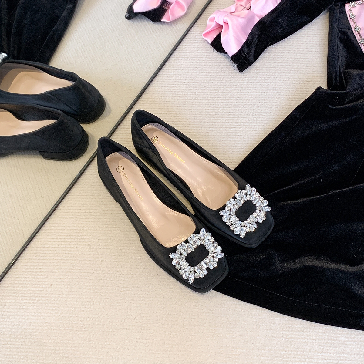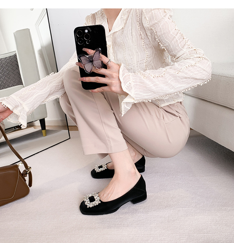 Đôi giày này có phần mũi vuông nhỏ nhắn, điểm nhấn là chiếc khóa hình vuông gắn đá lấp lánh ở phía trước. Đế bằng phẳng và thấp giúp nâng đỡ bàn chân một cách thoải mái cho cả ngày dài. Kiểu dáng cổ thấp, dễ dàng phối hợp với nhiều trang phục khác nhau như quần âu hay váy để đi làm hoặc dạo phố. Chỉ cần xỏ vào là có thể mang ngay, rất tiện lợi và nhanh chóng. | Tên sản phẩm: Giày Bệt Nữ Gắn Đá Hàng Mùa Xuân Thu Đông - Giày Dép Nữ | Mã sản phẩm: L0379 - Giá: 770.000đ | Mã nhà sản xuất: HUDSH-G02Hình ảnh sản phẩm