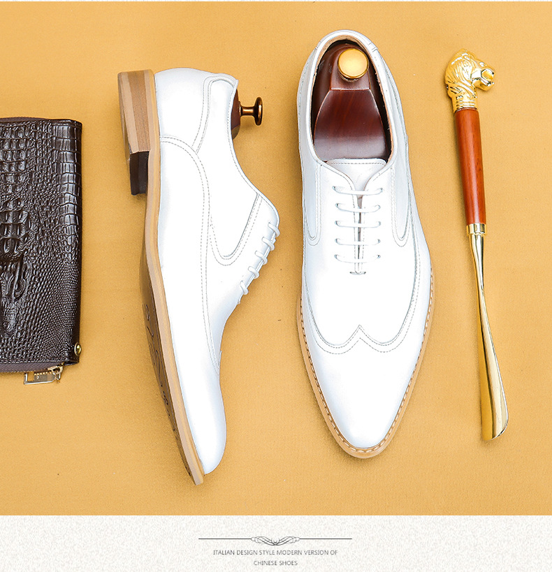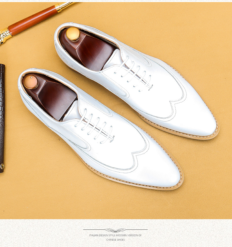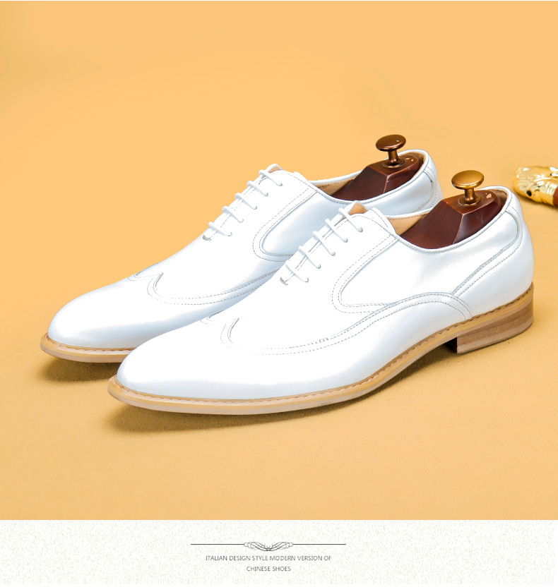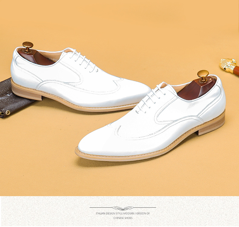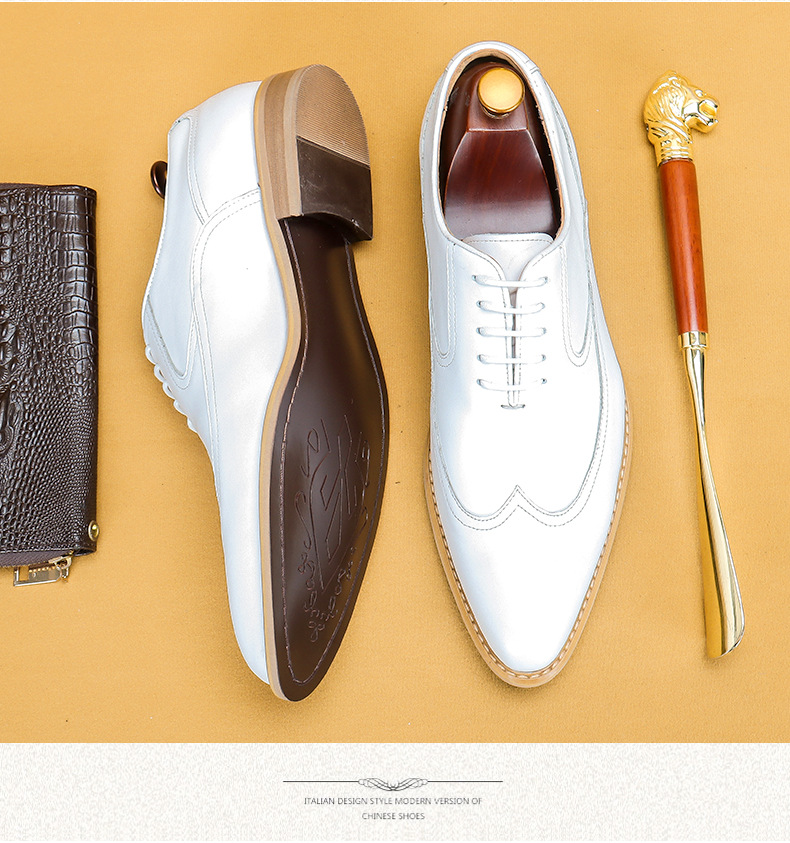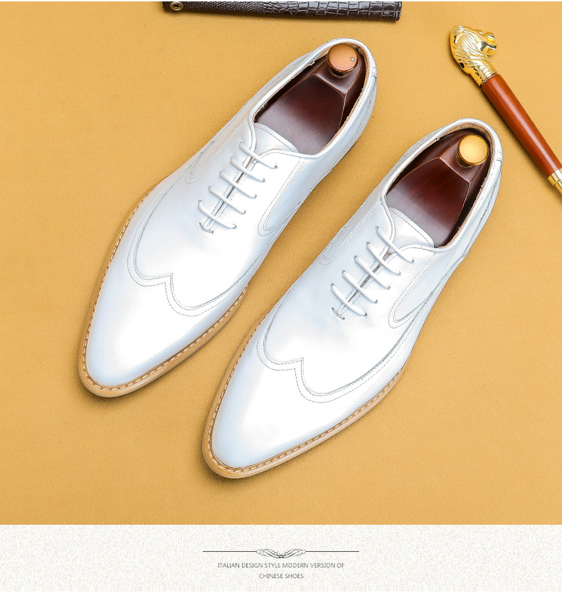 Giày da trắng dành cho nam, kiểu dáng phù hợp khi mặc đồ công sở. Sản phẩm được làm từ chất liệu da thật, mang lại cảm giác thoải mái và bền lâu. Kiểu giày buộc dây cổ điển với mũi nhọn tinh tế, tạo nên vẻ ngoại hình lịch sự. Bạn có thể dễ dàng phối cùng các bộ trang phục đi làm hoặc dự những sự kiện cần trang phục chỉnh tề. Sử dụng hàng ngày và vệ sinh bằng các sản phẩm chuyên dụng cho giày da. | Tên sản phẩm: Giày Da Nam Chất Liệu Da Bò Mũi Nhọn - Giày Dép Nam | Mã sản phẩm: L0717 - Giá: 2.120.000đ | Mã nhà sản xuất: SHERAW-G05Hình ảnh sản phẩm