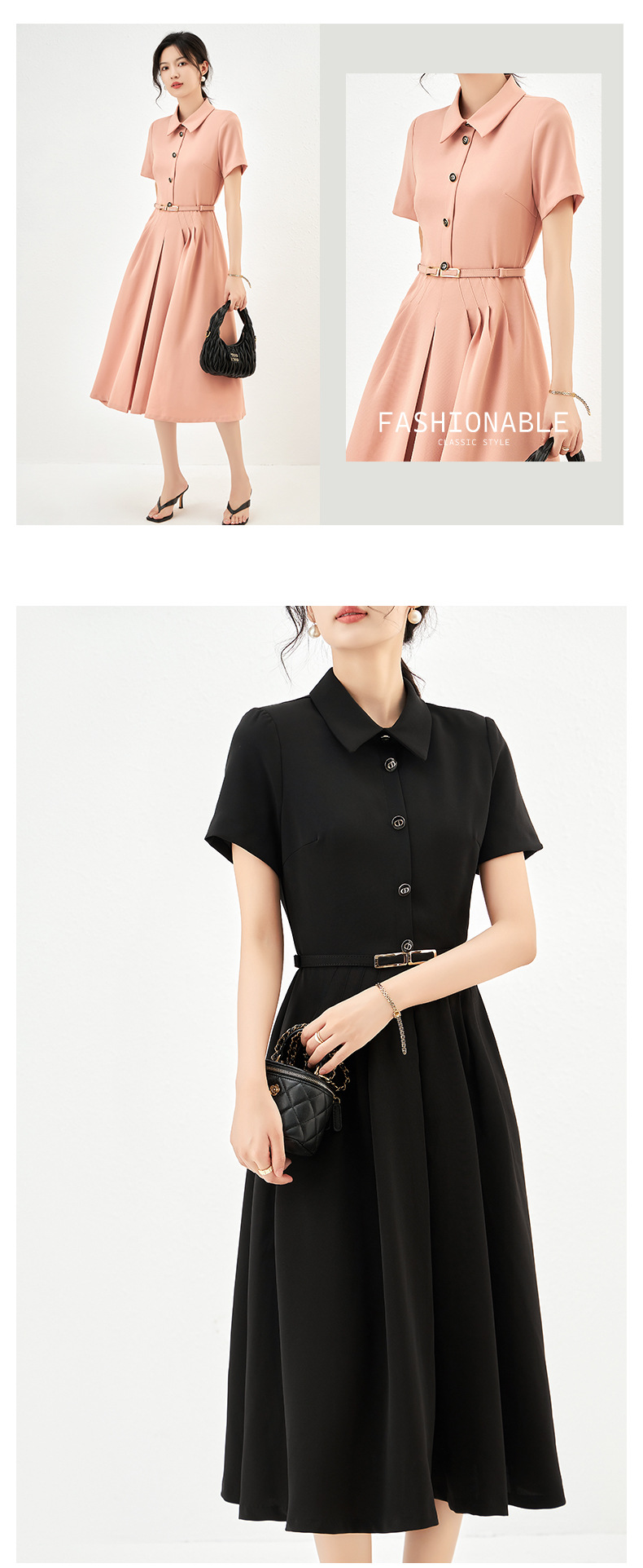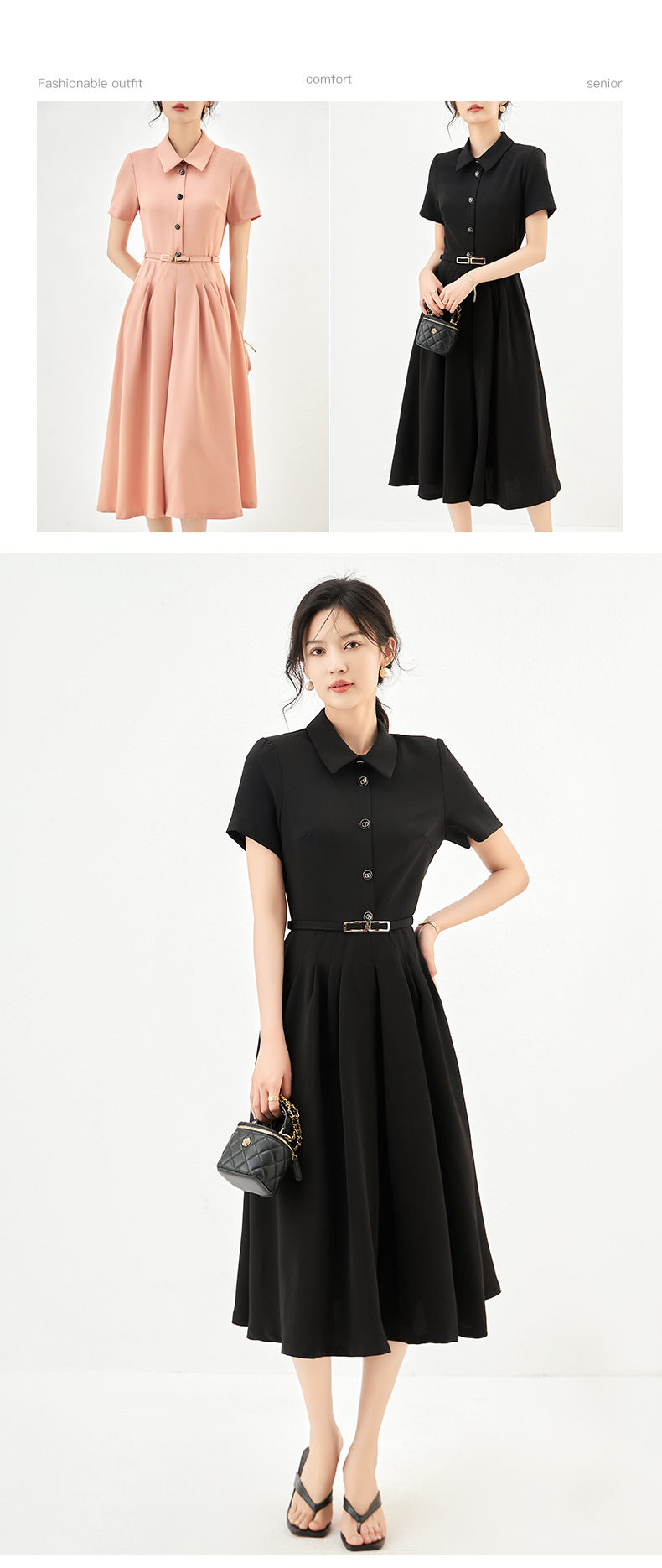 Chiếc áo váy này mang phong cách thời trang với cổ bẻ cùng thân trên ôm nhẹ tôn dáng. Phần eo được thiết kế tạo đường cong mềm mại, kết hợp với váy xòe rộng từ hông tạo cảm giác cân đối. Kiểu dáng dài vừa phải dễ mặc, phù hợp cho nhiều dịp trong ngày. Bạn có thể phối cùng giày bệt hoặc giày có qu để hoàn thiện bộ trang phục. | Tên sản phẩm: Váy Đầm Liền Thân Nữ - Thời Trang Nữ | Mã sản phẩm: L1038 - Giá: 2.210.000đ | Mã nhà sản xuất: SHDY-G05Hình ảnh sản phẩm