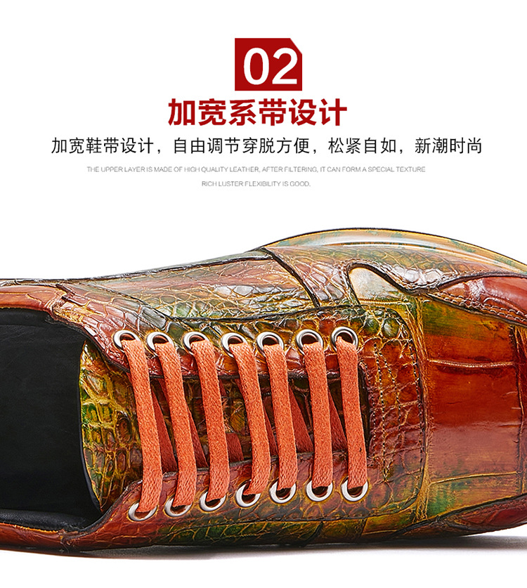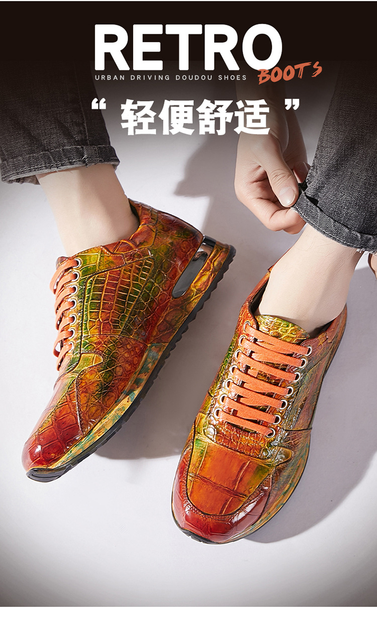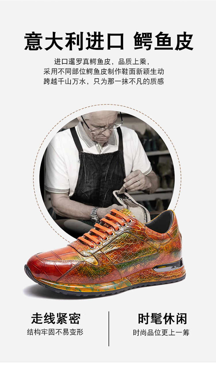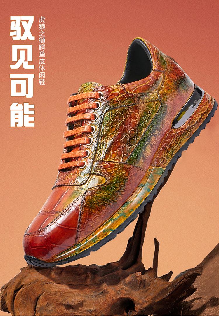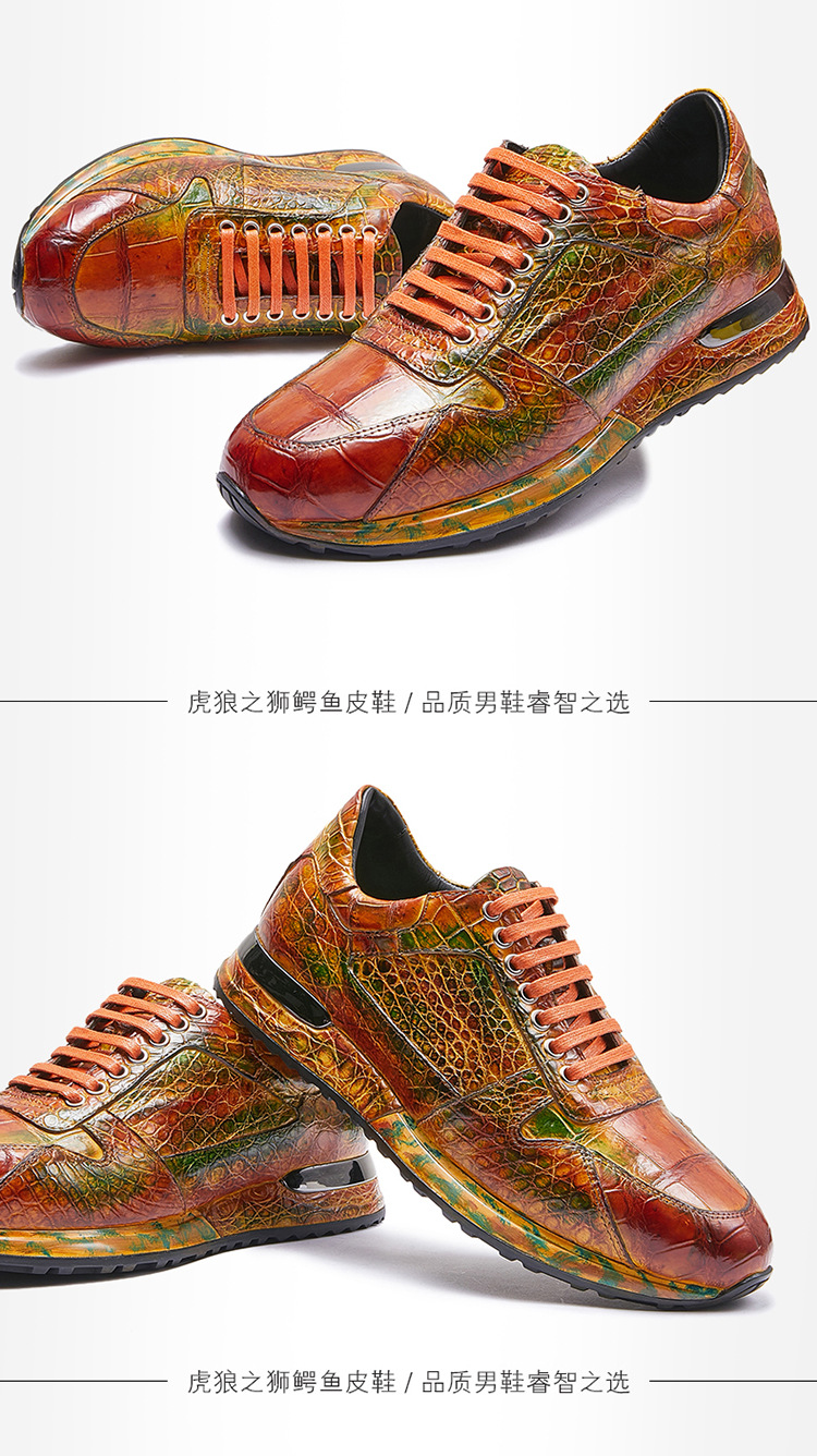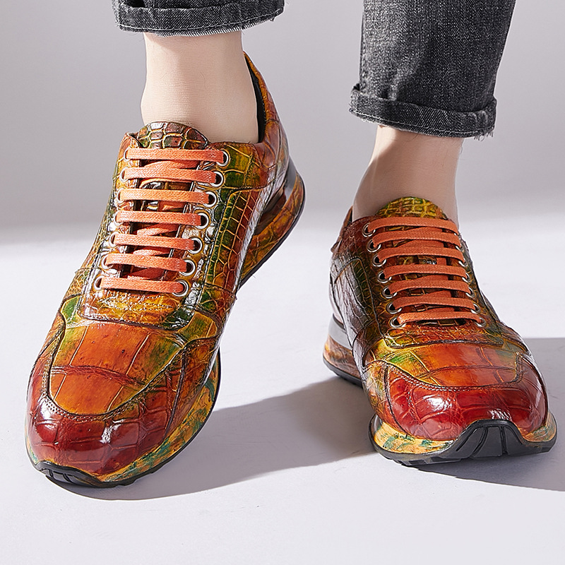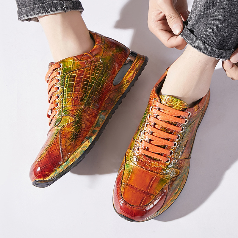 Đôi giày này được làm thủ công hoàn toàn từ chất liệu da cá sấu nhập khẩu. Bề mặt da được xử lý tạo hiệu ứng màu đánh bóng, mang đến vẻ ngoài vừa thể thao năng động lại vừa lịch sự. Kiểu dáng kết hợp giữa giày chạy bộ và giày da, phù hợp cho nhiều dịp sử dụng. Sản phẩm dành cho nam giới, thiết kế theo xu hướng hiện đại. Khi dùng, bạn nên vệ sinh nhẹ nhàng bằng vải mềm để giữ giày luôn bền đẹp. | Tên sản phẩm: Giày Da Nam - Giày Dép Nam | Mã sản phẩm: L1218 - Giá: 8.400.000đ | Mã nhà sản xuất: GUDTH-G06Hình ảnh sản phẩm