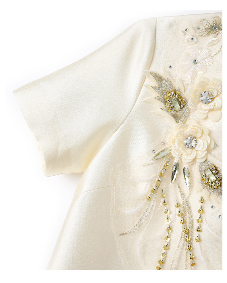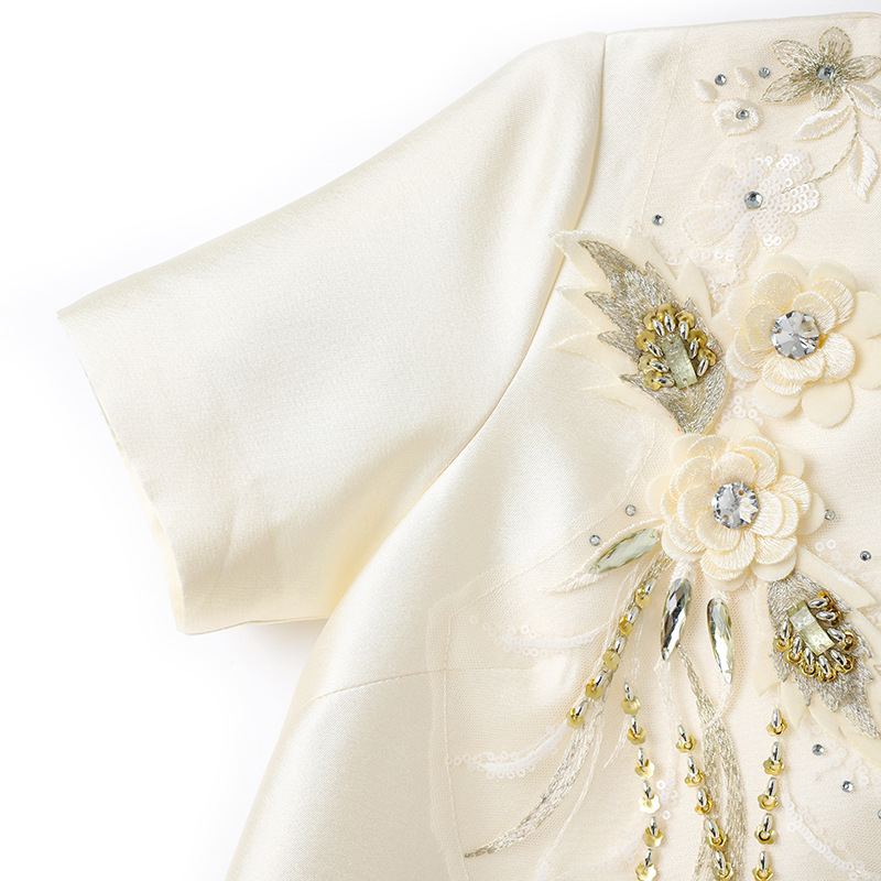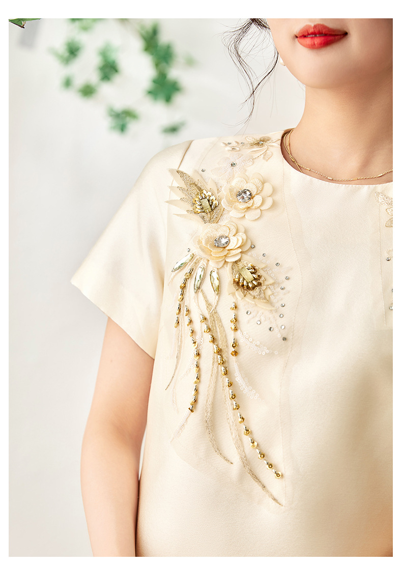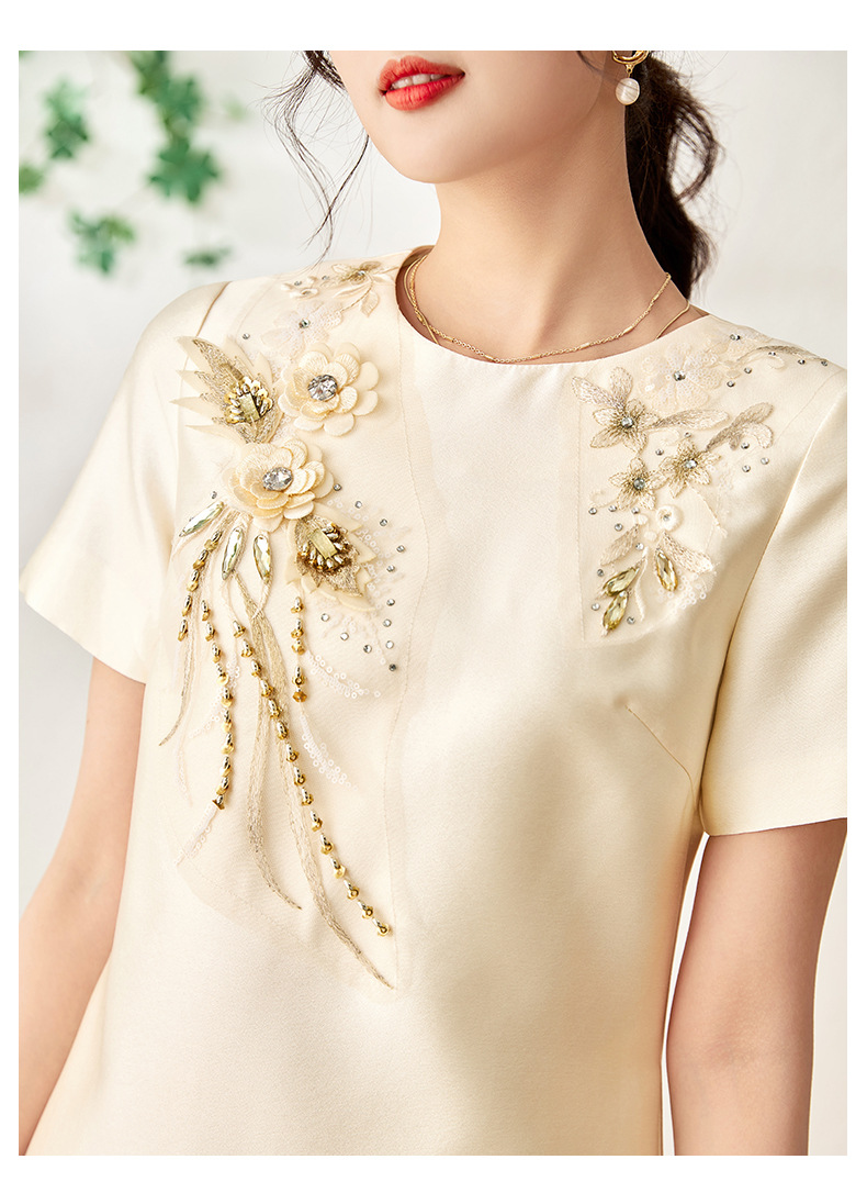 Chiếc đầm dáng chữ A mang phong cách Pháp, cổ tròn tôn vẻ đẹp dịu dàng. Điểm nhấn là những bông hoa được đính hạt cườm và đá lấp lánh một cách tinh tế, tạo nên nét thu hút riêng. Kiểu dáng giúp tôn dáng, che khuyết điểm vùng eo và đùi hiệu quả. Mặc kết hợp cùng giày cao gót hoặc sandals để hoàn thiện set đồ. Sản phẩm phù hợp cho nhiều dịp đi chơi hoặc gặp mặt. | Tên sản phẩm: Váy Đầm Liền Thân Nữ Dáng Chữ A Họa Tiết Hoa Trông Trẻ Hơn Tuổi - Thời Trang Nữ | Mã sản phẩm: L1713 - Giá: 1.780.000đ | Mã nhà sản xuất: SHDY-G05Hình ảnh sản phẩm