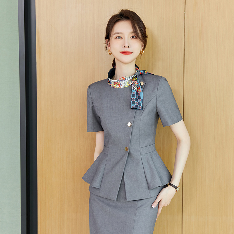 Bộ trang phục tay ngắn dành cho nữ, thiết kế dạng áo bắt chéo cài cúc và quần dài tạo vẻ ngoài lịch sự, phù hợp mặc trong môi trường làm việc. Kiểu dáng mang phong cách hiện đại, nhẹ nhàng nhưng vẫn giữ được nét gọn gàng. Sản phẩm thích hợp dùng làm đồng phục tiếp tân hoặc nhân viên. Có thể mặc nguyên bộ hoặc kết hợp với áo bên trong. Giặt nhẹ và phơi khô để giữ dáng áo quần được bền đẹp. | Tên sản phẩm: Áo Vest Nữ Vest Ngắn Tay Hàng Mùa Hè - Thời Trang Nữ | Mã sản phẩm: L1986 - Giá: 940.000đ | Mã nhà sản xuất: SHRYIA-G03Hình ảnh sản phẩm