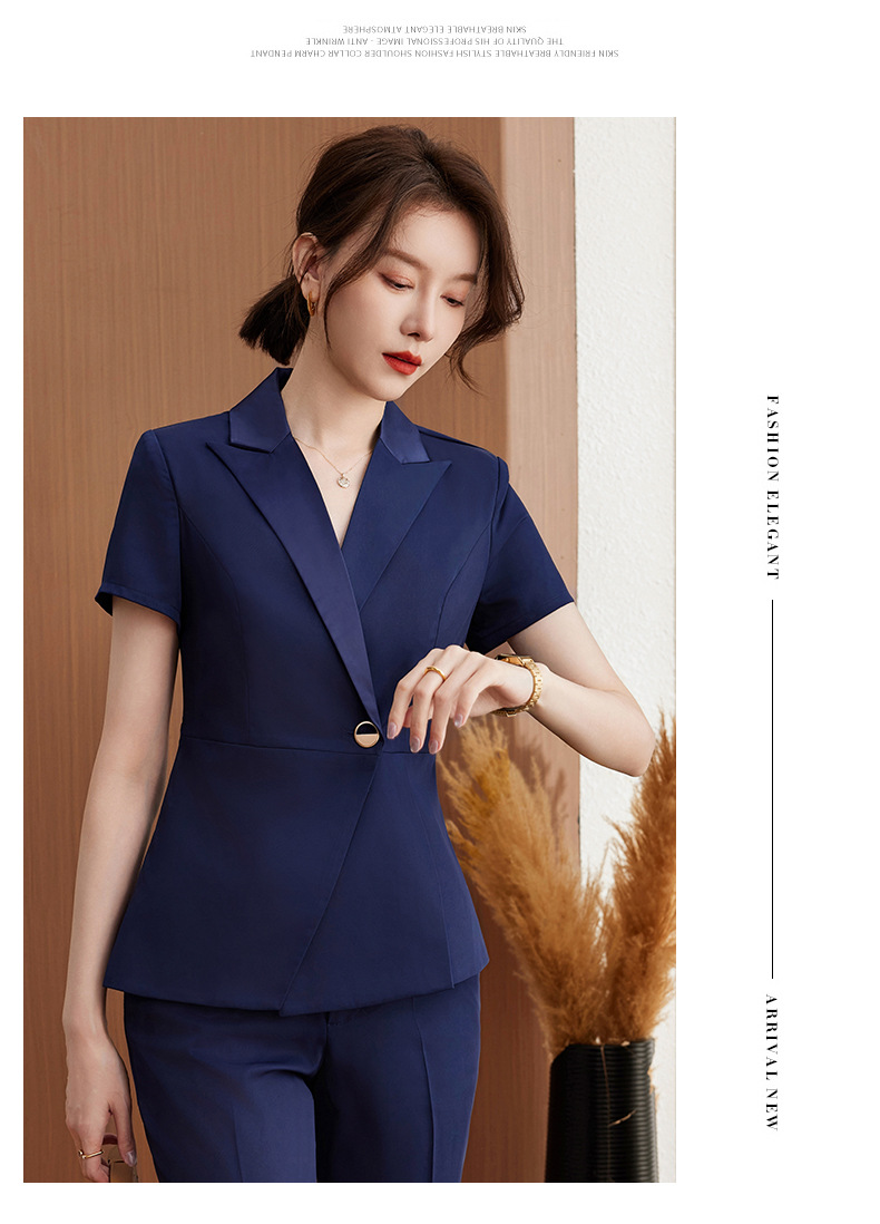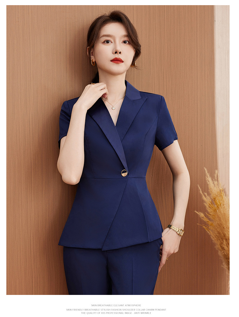 Bộ trang phục làm việc màu xanh dương, thiết kế dạng áo ngắn tay và quần dài, phù hợp cho môi trường công sở như khách sạn, cửa hàng trang sức hay spa. Chất vải mát mẻ, thấm hút mồ hôi tốt, giúp người mặc cảm thấy thoải mái và tự tin suốt ngày dài. Có thể mặc trực tiếp, kết hợp cùng giày công sở, dễ dàng giặt sạch và bảo quản. | Tên sản phẩm: Áo Vest Nữ Vest Ngắn Tay Hàng Mùa Hè Đồ Công Sở - Thời Trang Nữ | Mã sản phẩm: L2123 - Giá: 940.000đ | Mã nhà sản xuất: SHRYIA-G03Hình ảnh sản phẩm