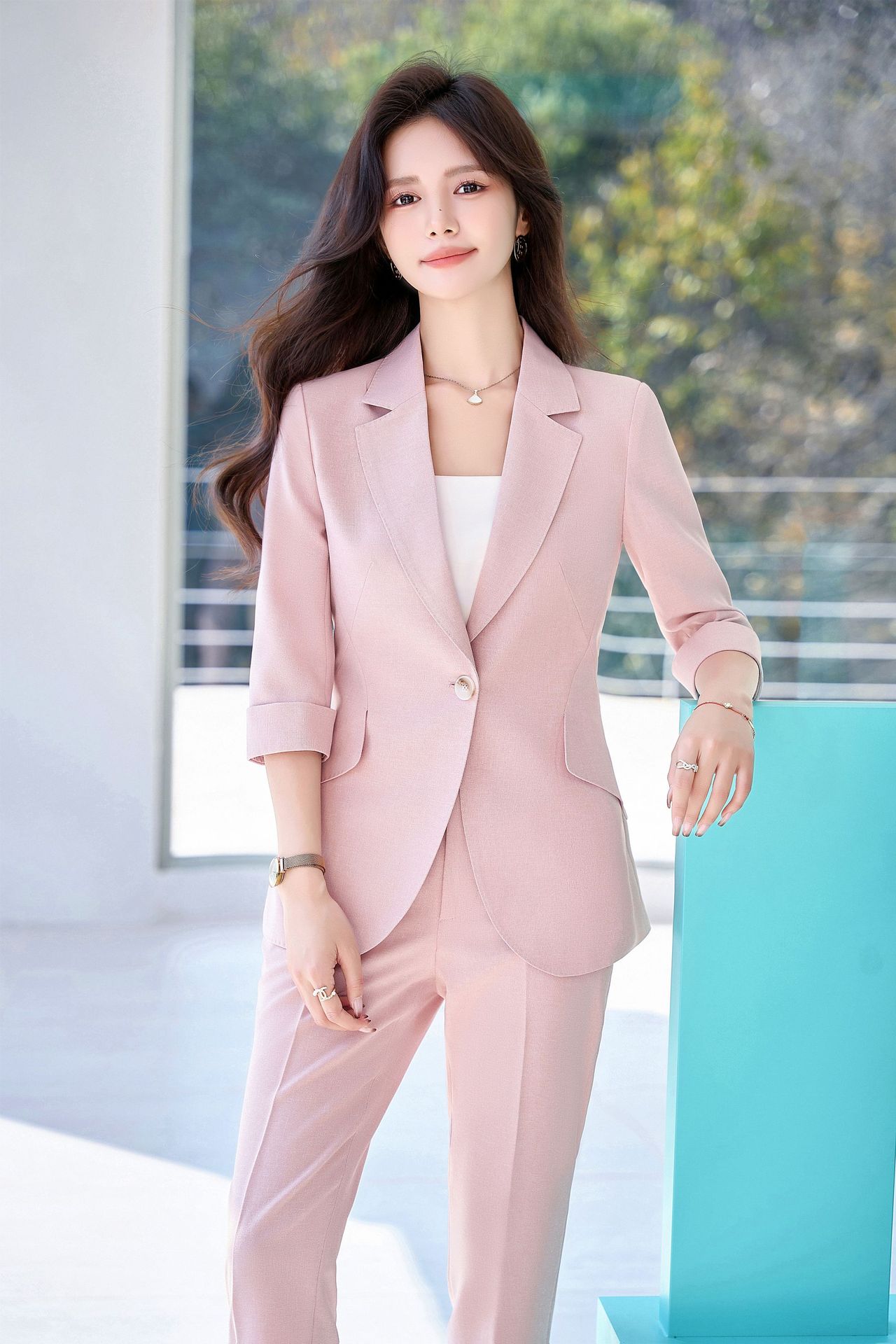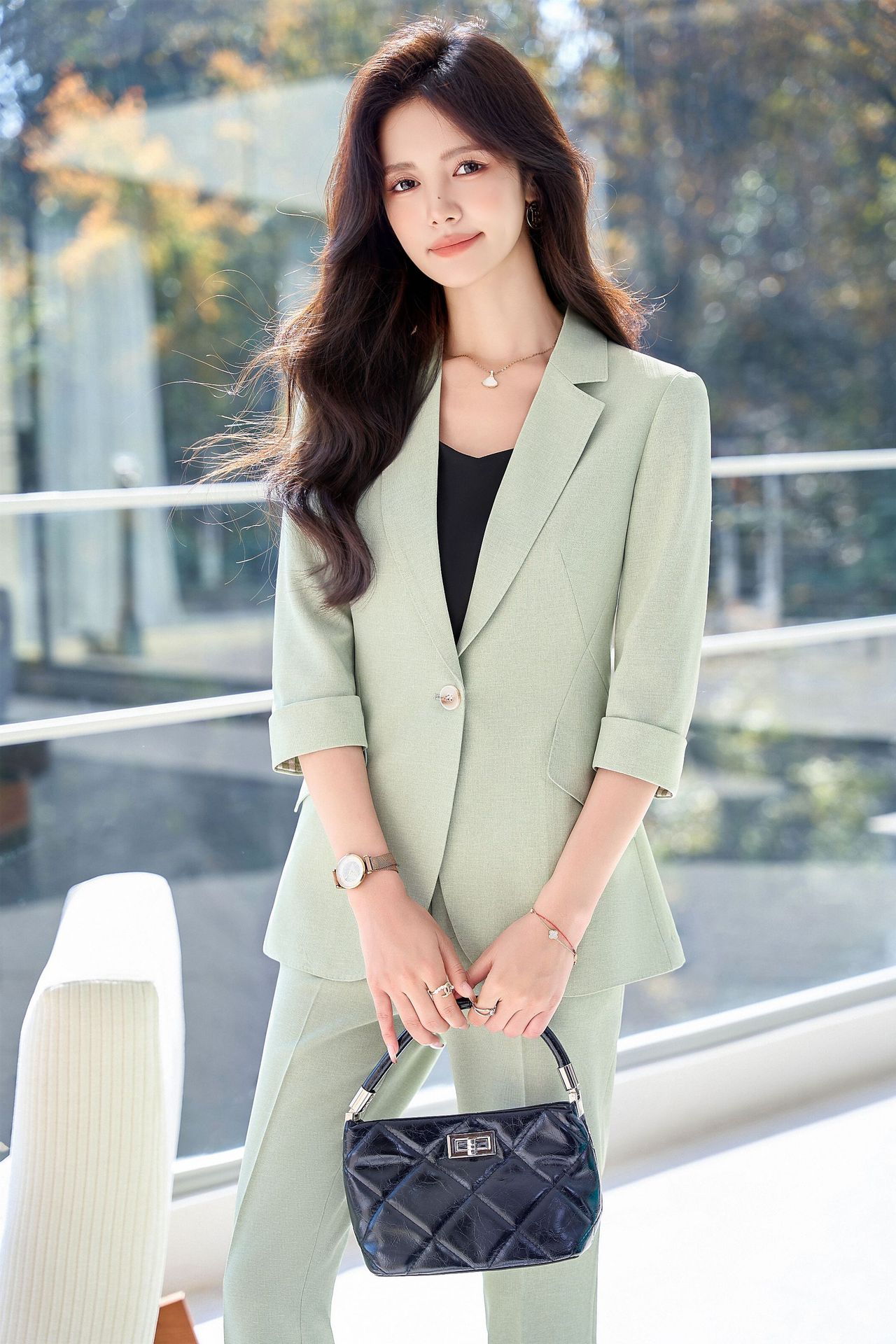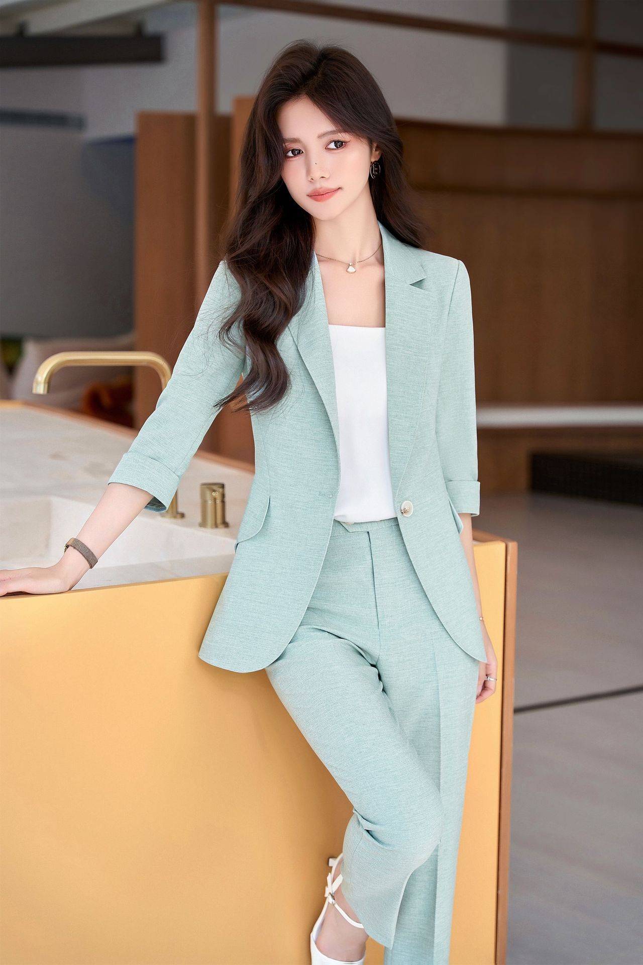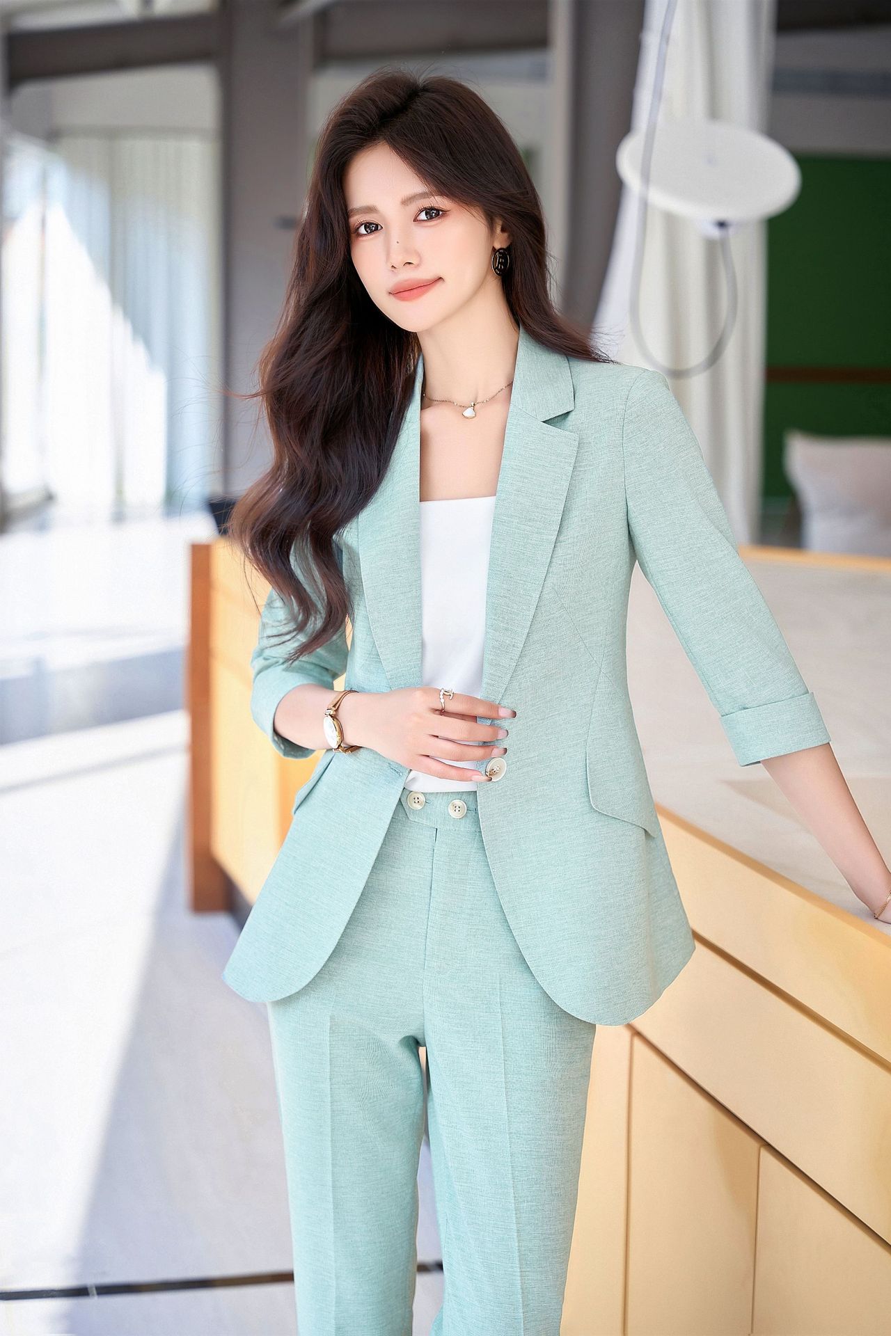 Bộ trang phục công sở dành cho nữ, thiết kế dành cho mùa hè. Áo khoác ngoài có tay dài ba phần tư, tạo vẻ ngoài lịch sự và chuyên nghiệp. Kiểu dáng phù hợp cho môi trường làm việc, giúp người mặc thể hiện sự tự tin và gọn gàng. Có thể phối cùng quần âu hoặc chân váy có sẵn trong bộ. Mặc khi đi làm, họp hành hoặc các dịp cần trang phục chỉn chu. Dễ dàng bảo quản và giặt sạch thông thường. | Tên sản phẩm: Đồ Bộ Nữ Hàng Mùa Hè Đồ Công Sở - Thời Trang Nữ | Mã sản phẩm: L2154 - Giá: 1.070.000đ | Mã nhà sản xuất: SHRYIA-G03Hình ảnh sản phẩm