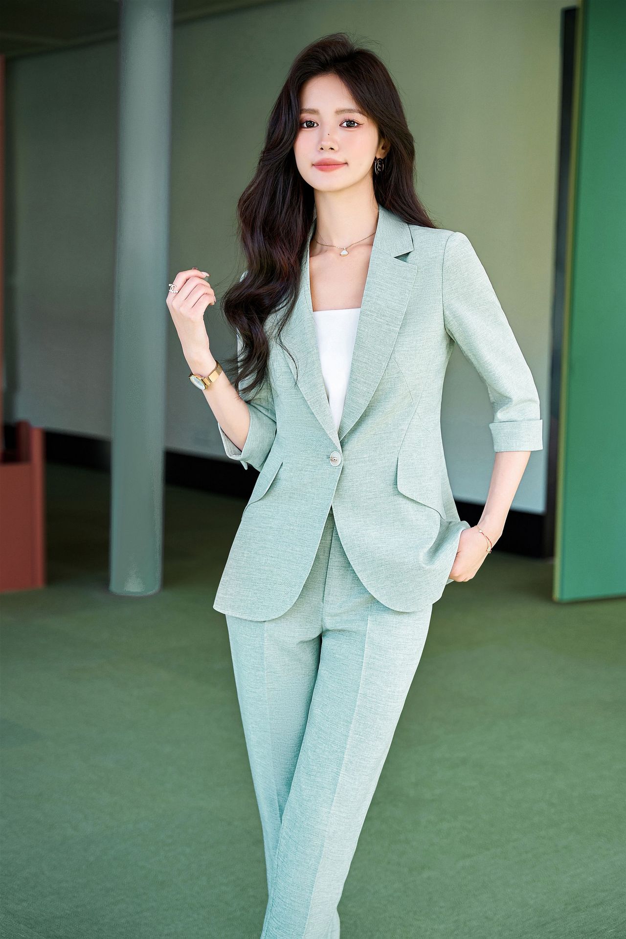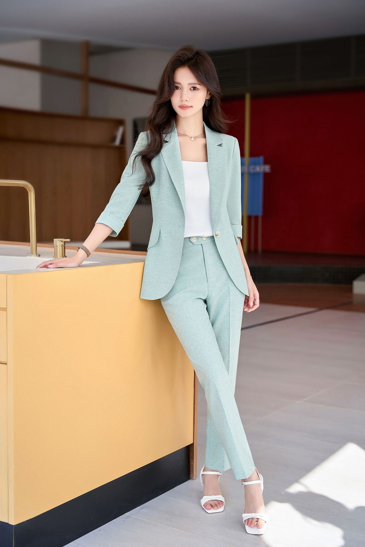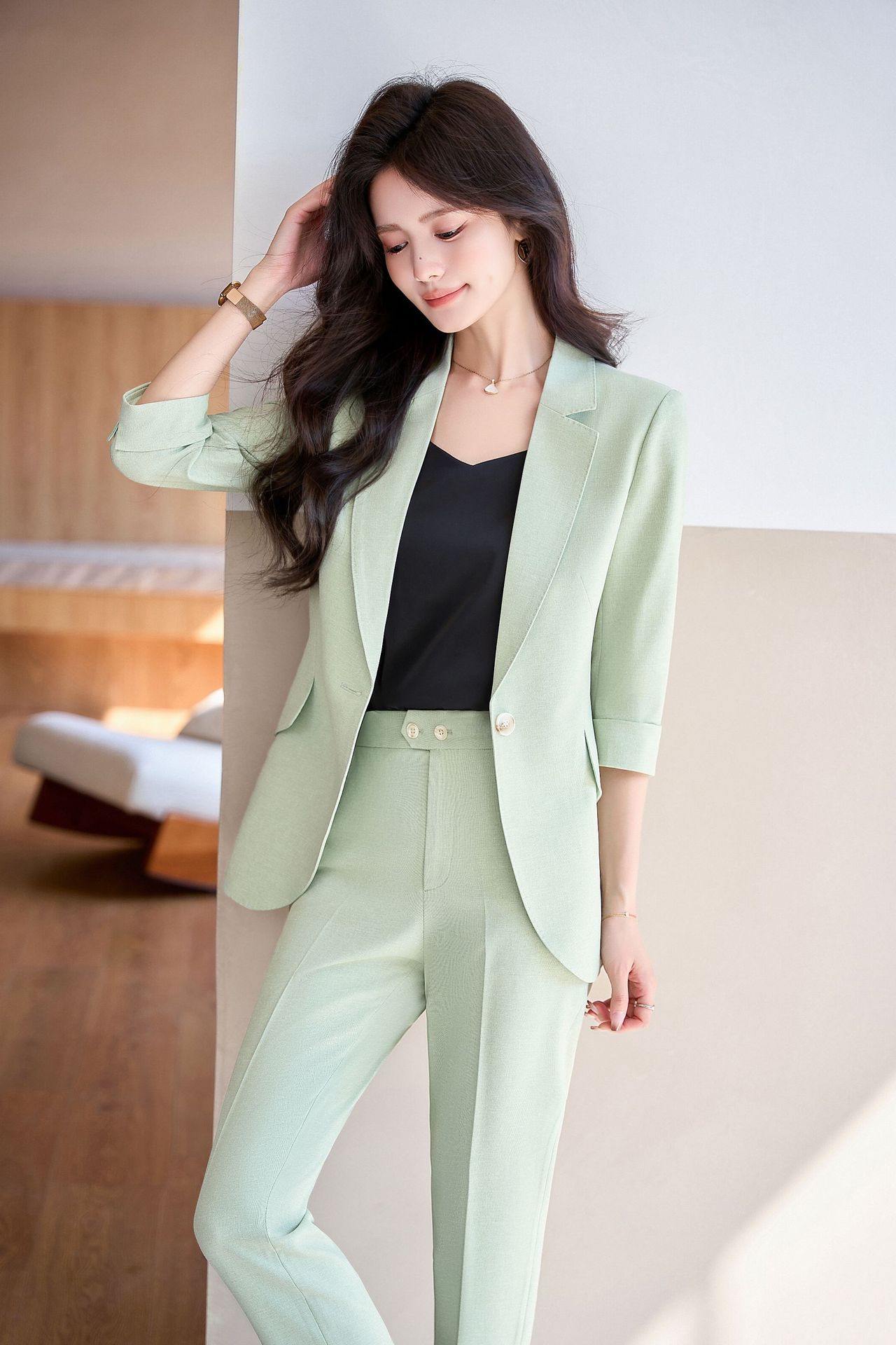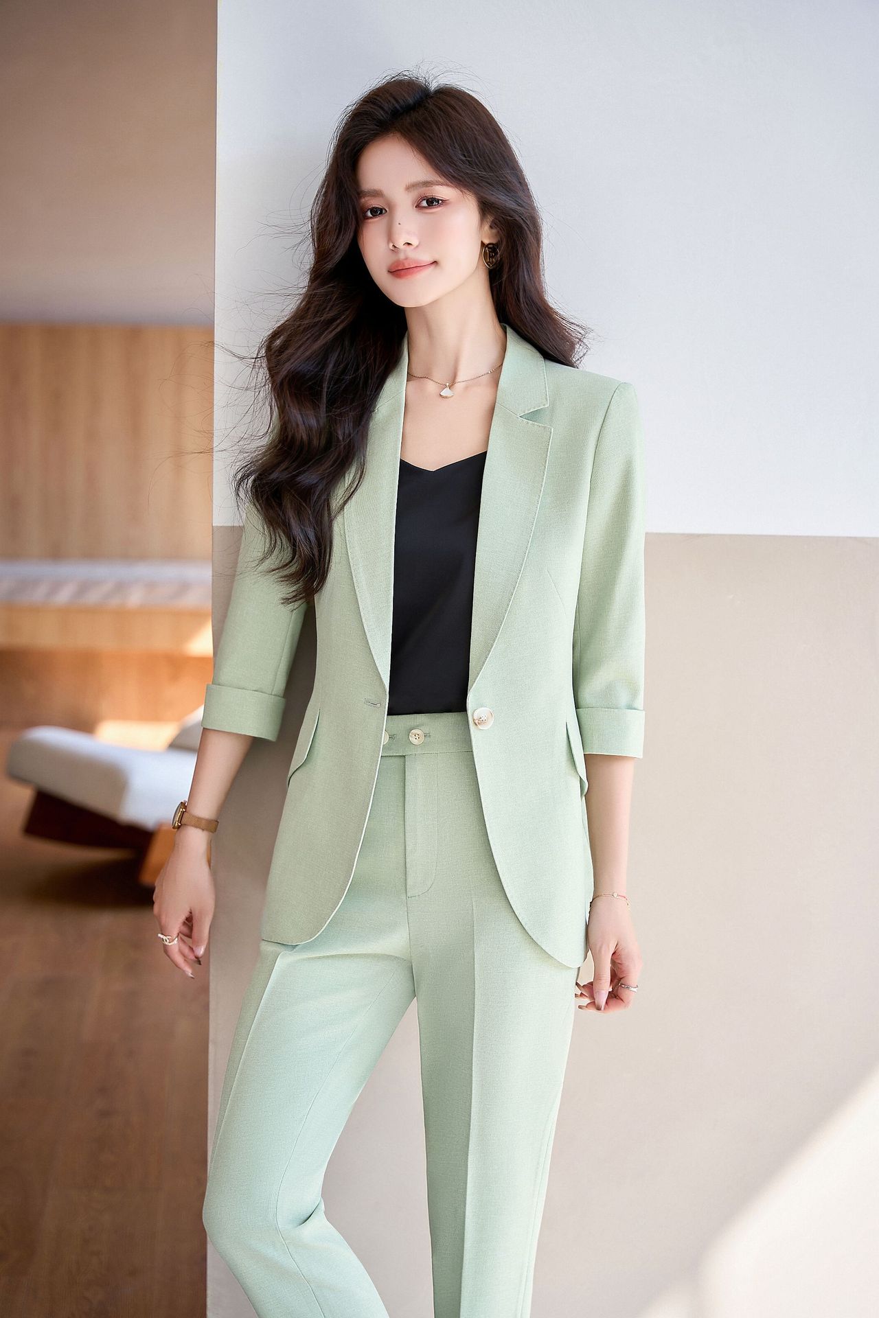 Bộ trang phục công sở dành cho nữ, thiết kế dành cho mùa hè. Áo khoác ngoài có tay dài ba phần tư, tạo vẻ ngoài lịch sự và chuyên nghiệp. Kiểu dáng phù hợp cho môi trường làm việc, giúp người mặc thể hiện sự tự tin và gọn gàng. Có thể phối cùng quần âu hoặc chân váy có sẵn trong bộ. Mặc khi đi làm, họp hành hoặc các dịp cần trang phục chỉn chu. Dễ dàng bảo quản và giặt sạch thông thường. | Tên sản phẩm: Đồ Bộ Nữ Hàng Mùa Hè Đồ Công Sở - Thời Trang Nữ | Mã sản phẩm: L2154 - Giá: 1.070.000đ | Mã nhà sản xuất: SHRYIA-G03Hình ảnh sản phẩm