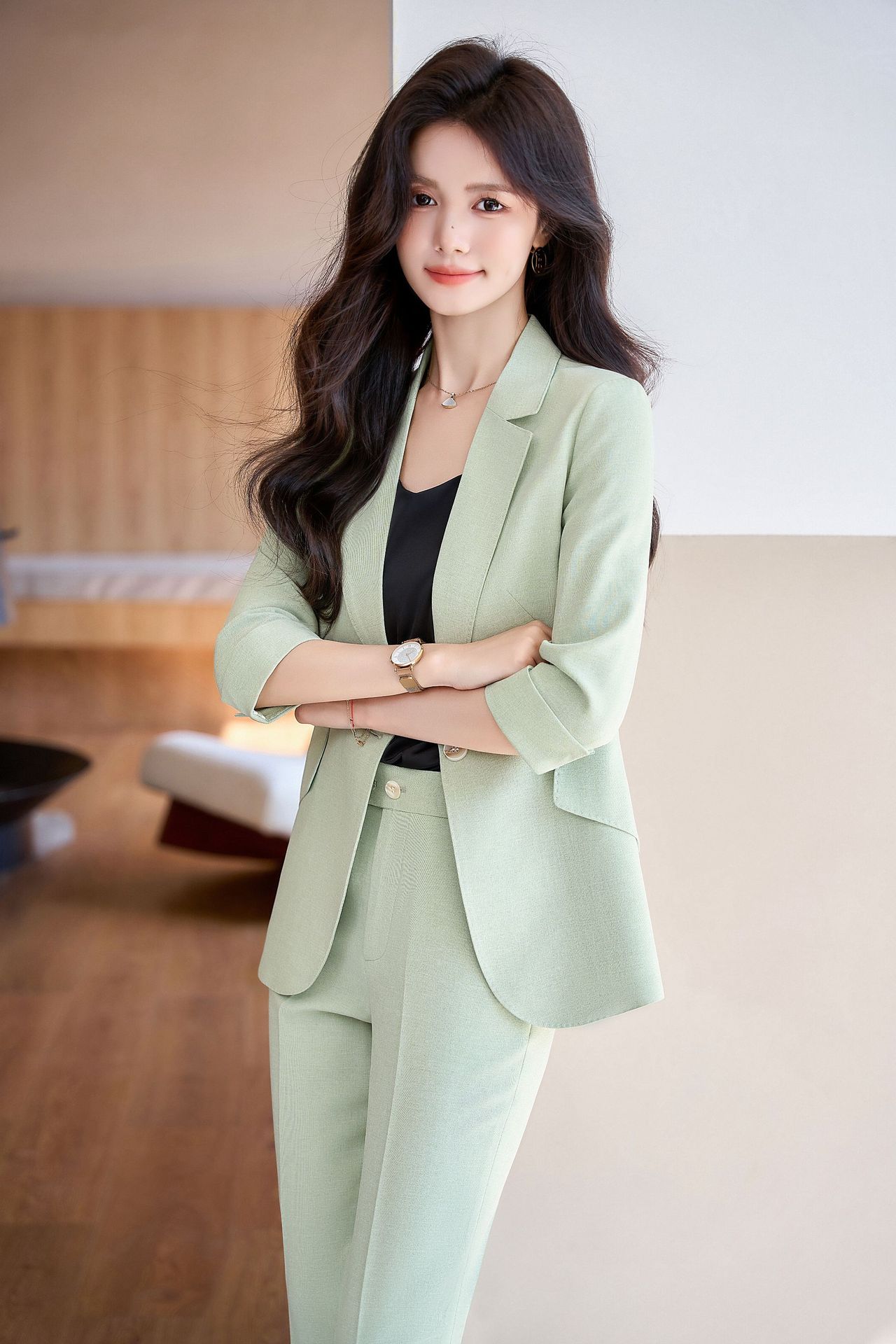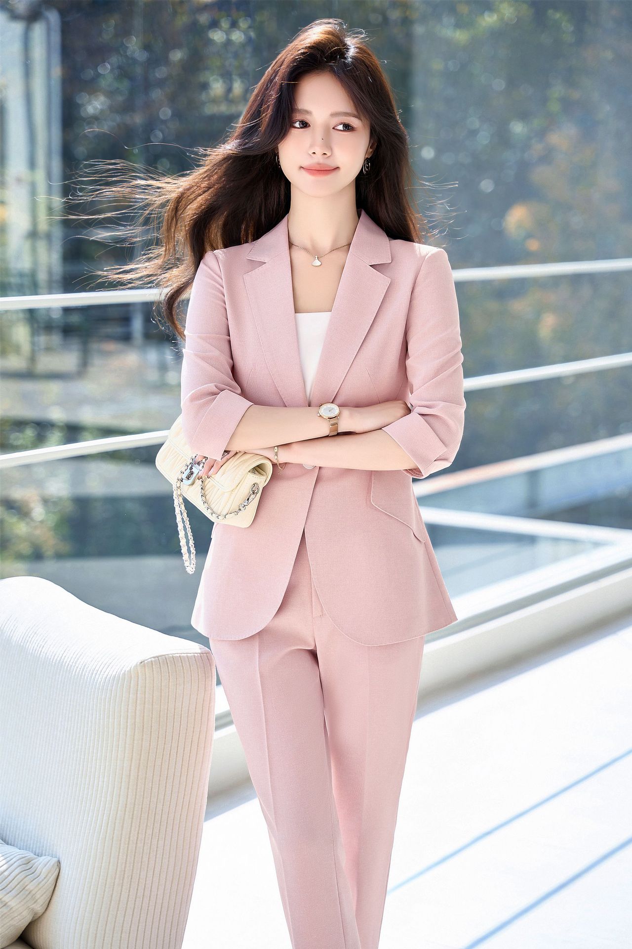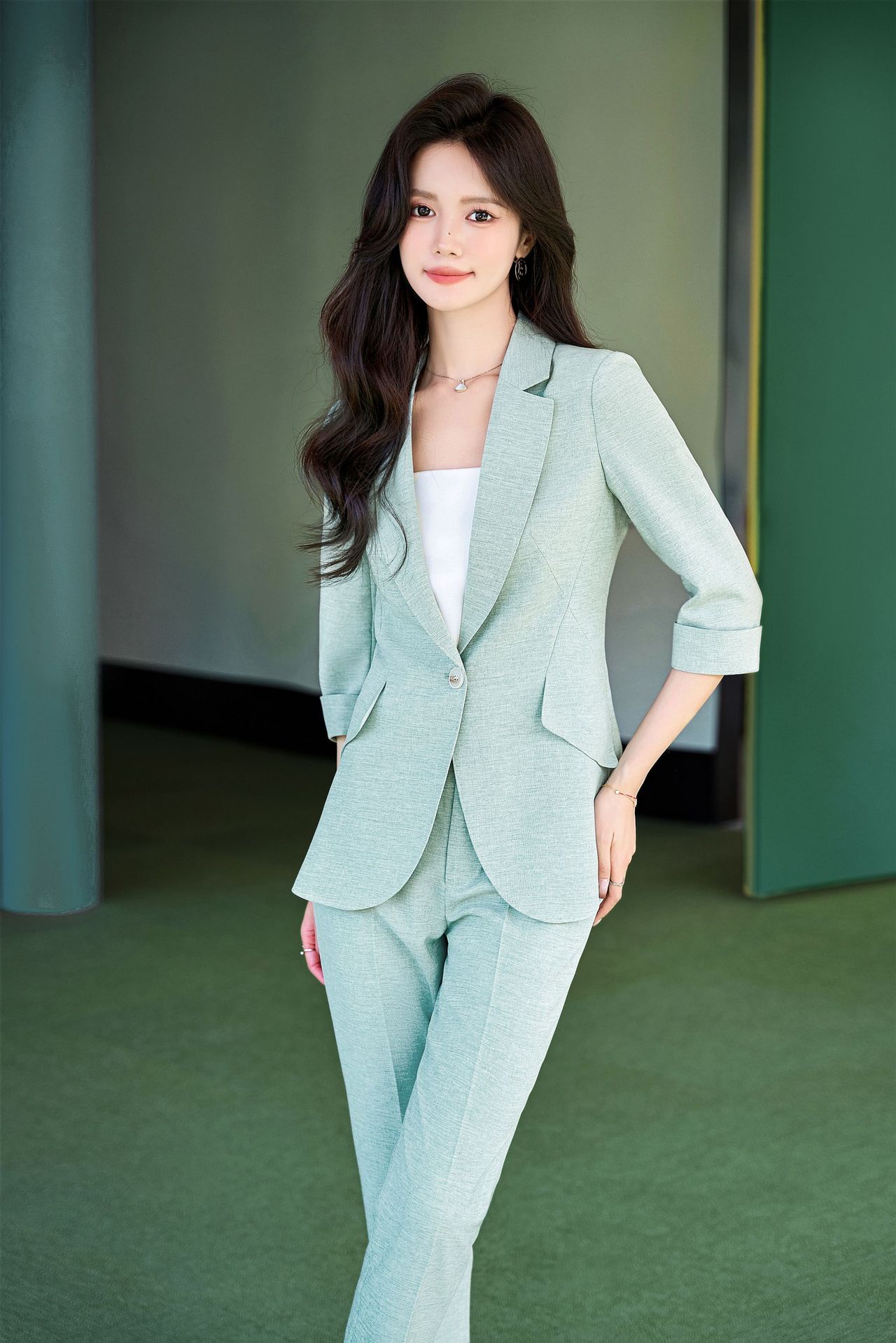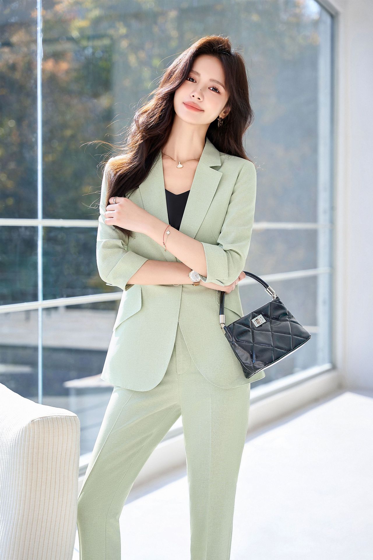 Bộ trang phục công sở dành cho nữ, thiết kế dành cho mùa hè. Áo khoác ngoài có tay dài ba phần tư, tạo vẻ ngoài lịch sự và chuyên nghiệp. Kiểu dáng phù hợp cho môi trường làm việc, giúp người mặc thể hiện sự tự tin và gọn gàng. Có thể phối cùng quần âu hoặc chân váy có sẵn trong bộ. Mặc khi đi làm, họp hành hoặc các dịp cần trang phục chỉn chu. Dễ dàng bảo quản và giặt sạch thông thường. | Tên sản phẩm: Đồ Bộ Nữ Hàng Mùa Hè Đồ Công Sở - Thời Trang Nữ | Mã sản phẩm: L2154 - Giá: 1.070.000đ | Mã nhà sản xuất: SHRYIA-G03Hình ảnh sản phẩm