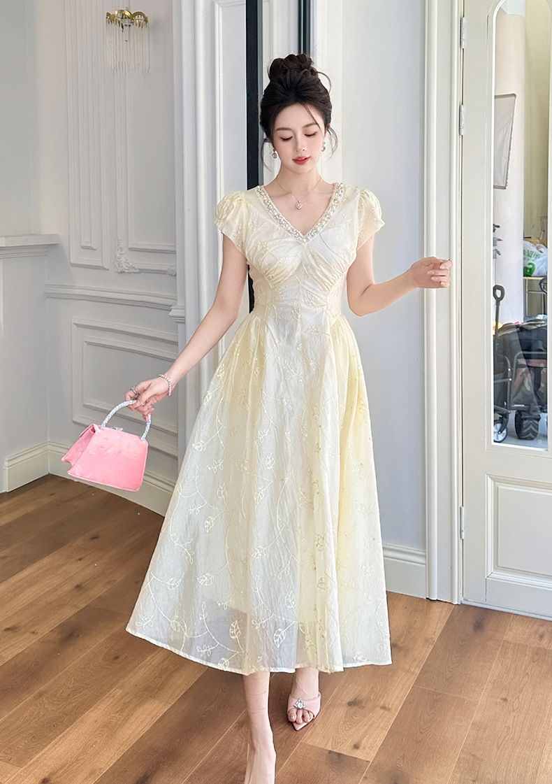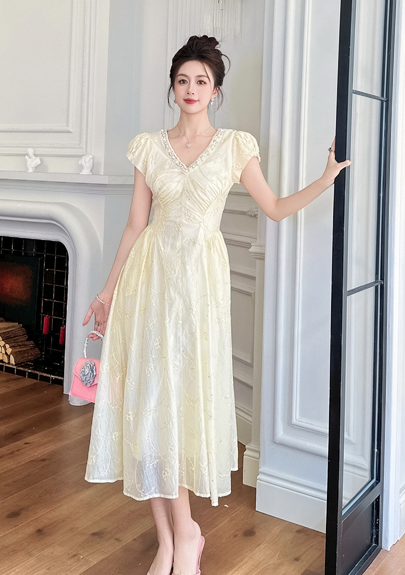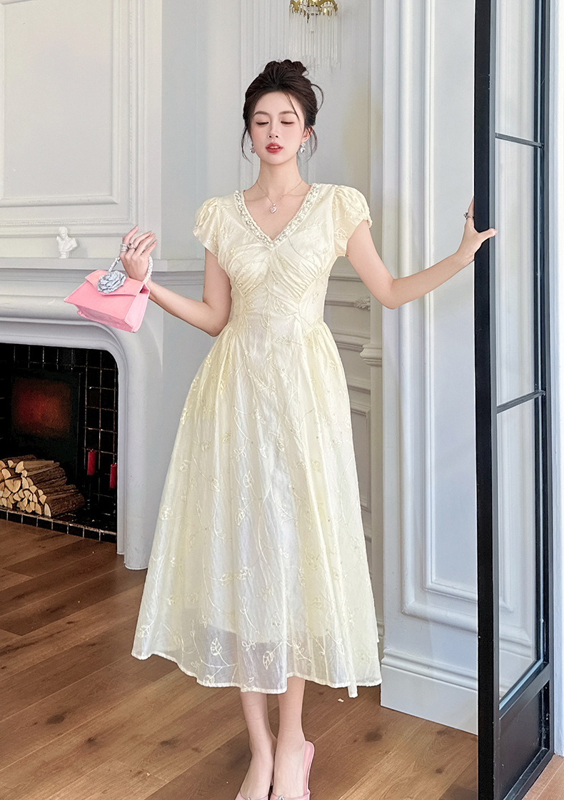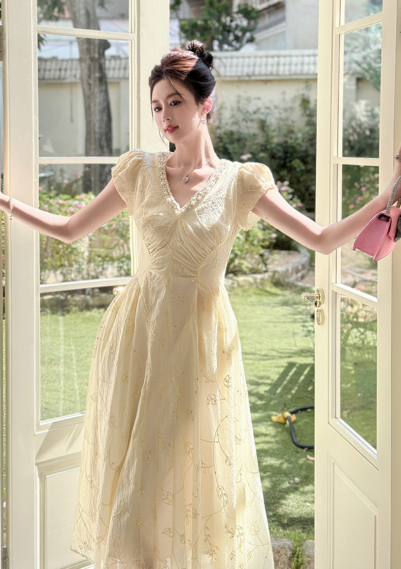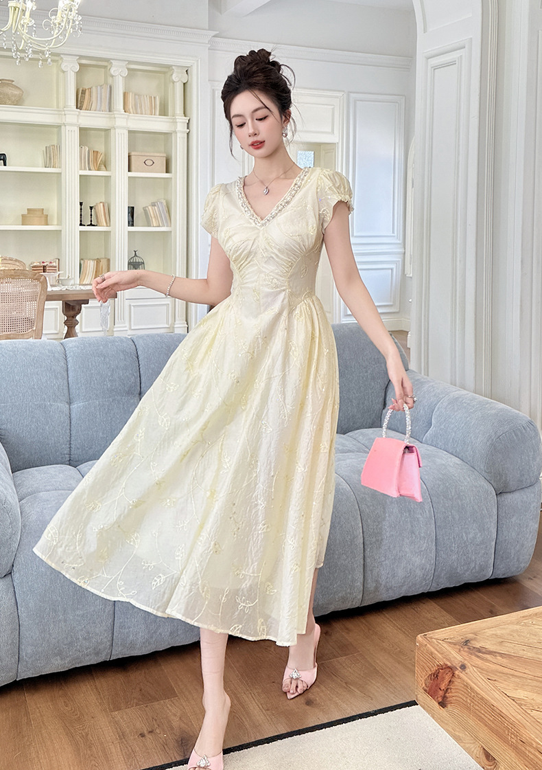 Áo dài mặc ở nhà cho nữ, phiên bản mới với màu vàng nhạt nhẹ nhàng. Cổ chữ V tôn dáng, eo thắt nơ tạo điểm nhấn. Váy xòe rộng, phù hợp cho những lúc thư giãn. Trên áo có điểm xuyết các chi tiết trang trí lấp lánh tinh tế. Mặc kèm với dép mỏng hoặc giày bệt để tạo sự thoải mái. Chất vải mềm mại, mang lại cảm giác dễ chịu khi mặc cả ngày. | Tên sản phẩm: Váy Đầm Liền Thân Dáng Dài Nữ Cổ Chữ V Hàng Mùa Hè - Thời Trang Nữ | Mã sản phẩm: L2224 - Giá: 1.500.000đ | Mã nhà sản xuất: CHDG-G04Hình ảnh sản phẩm
