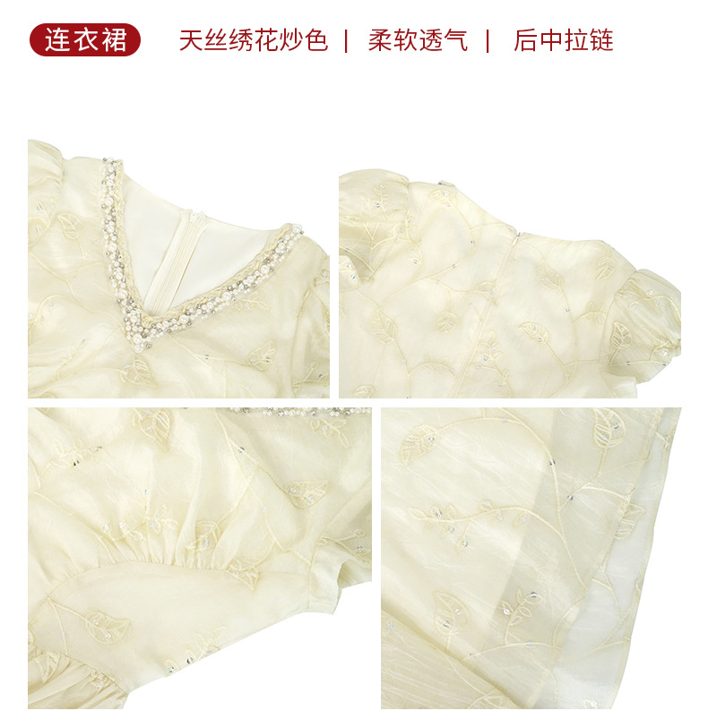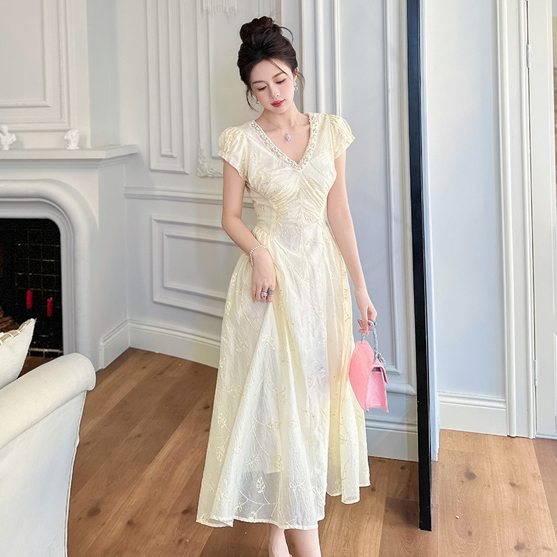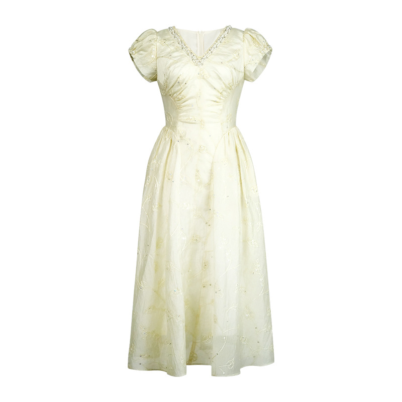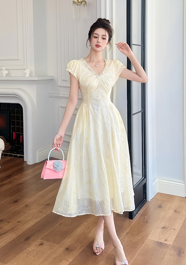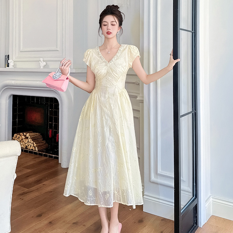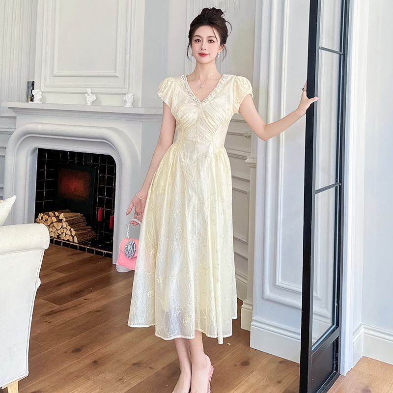 Áo dài mặc ở nhà cho nữ, phiên bản mới với màu vàng nhạt nhẹ nhàng. Cổ chữ V tôn dáng, eo thắt nơ tạo điểm nhấn. Váy xòe rộng, phù hợp cho những lúc thư giãn. Trên áo có điểm xuyết các chi tiết trang trí lấp lánh tinh tế. Mặc kèm với dép mỏng hoặc giày bệt để tạo sự thoải mái. Chất vải mềm mại, mang lại cảm giác dễ chịu khi mặc cả ngày. | Tên sản phẩm: Váy Đầm Liền Thân Dáng Dài Nữ Cổ Chữ V Hàng Mùa Hè - Thời Trang Nữ | Mã sản phẩm: L2224 - Giá: 1.500.000đ | Mã nhà sản xuất: CHDG-G04Hình ảnh sản phẩm