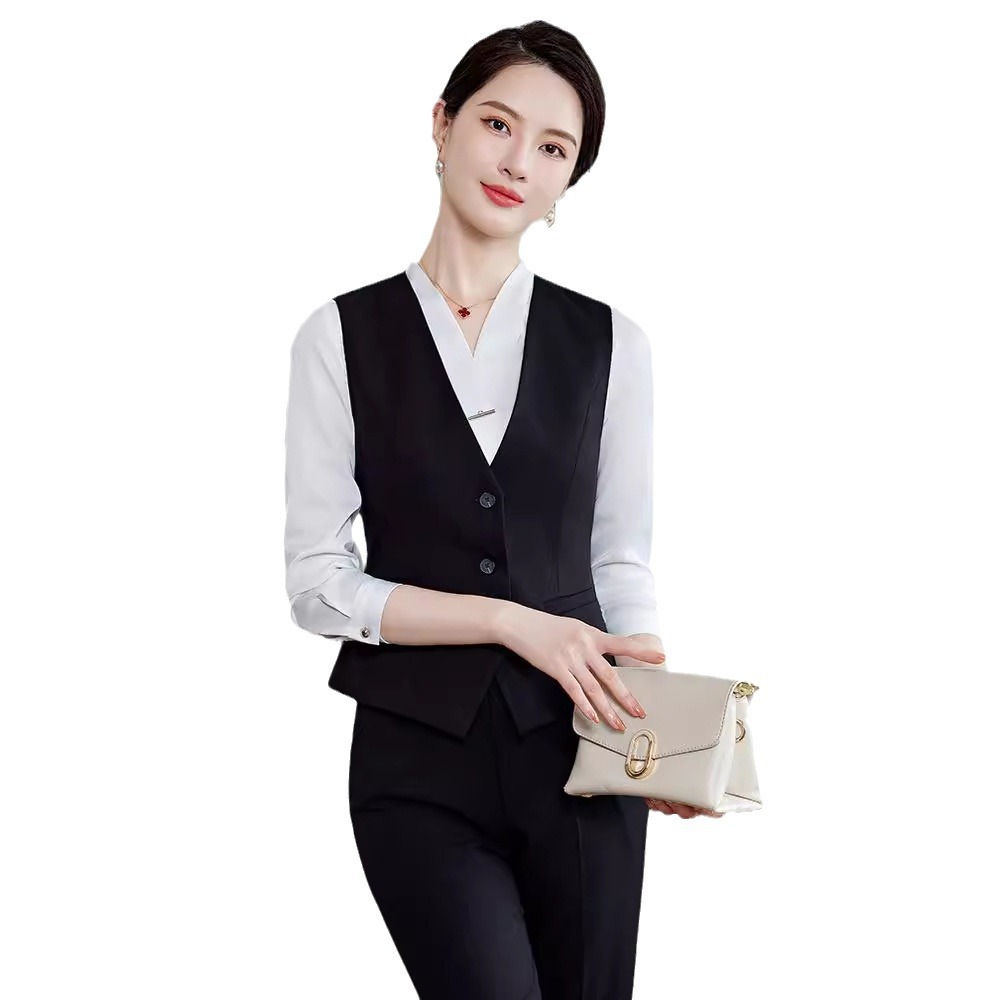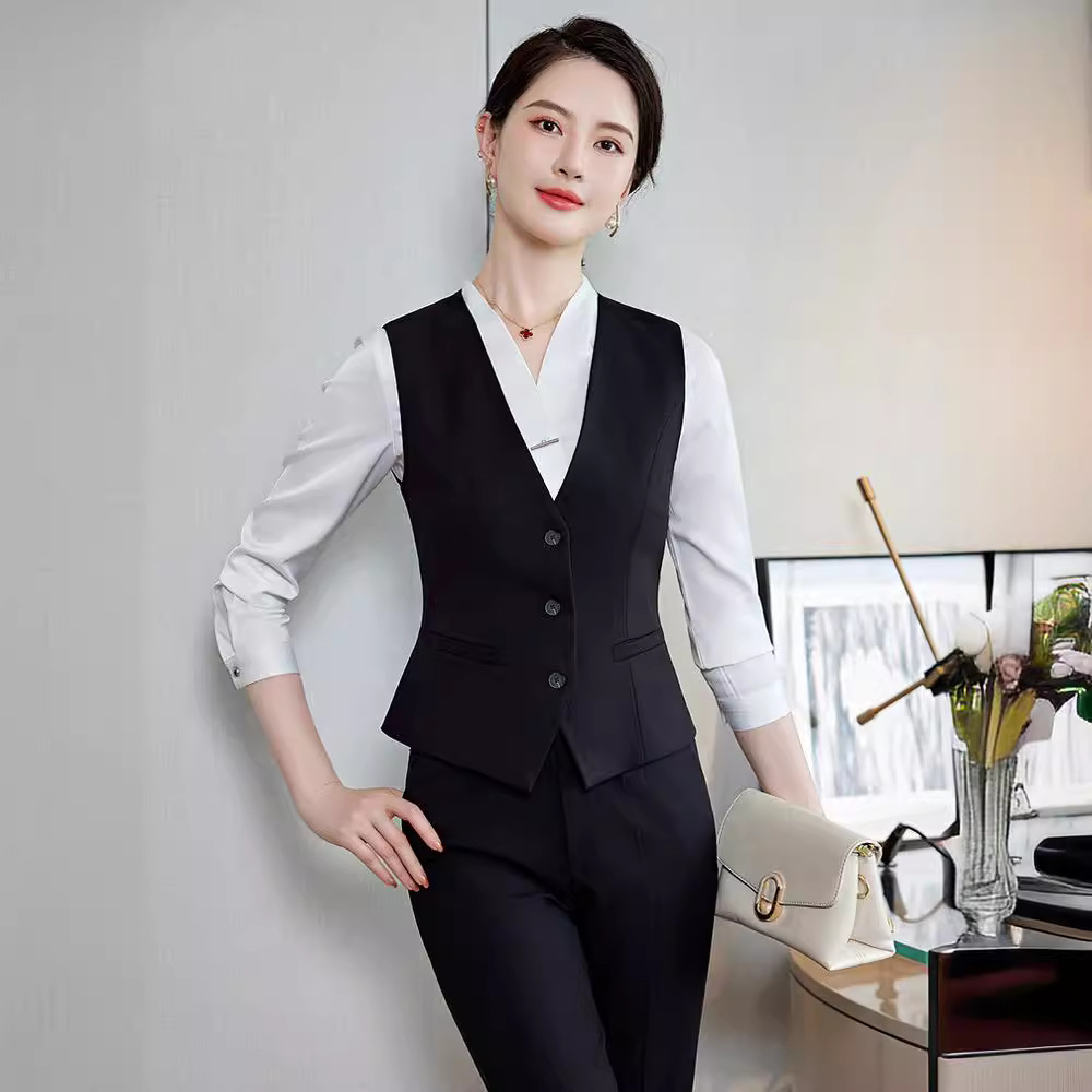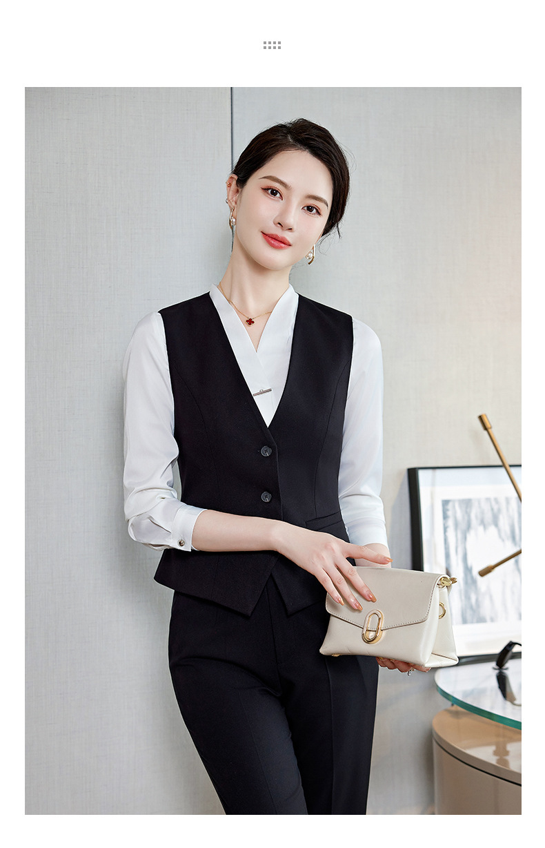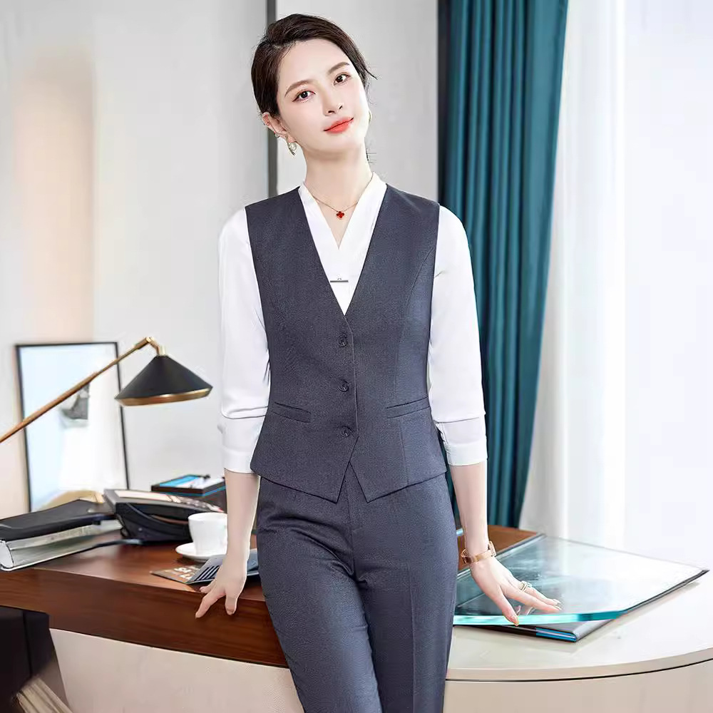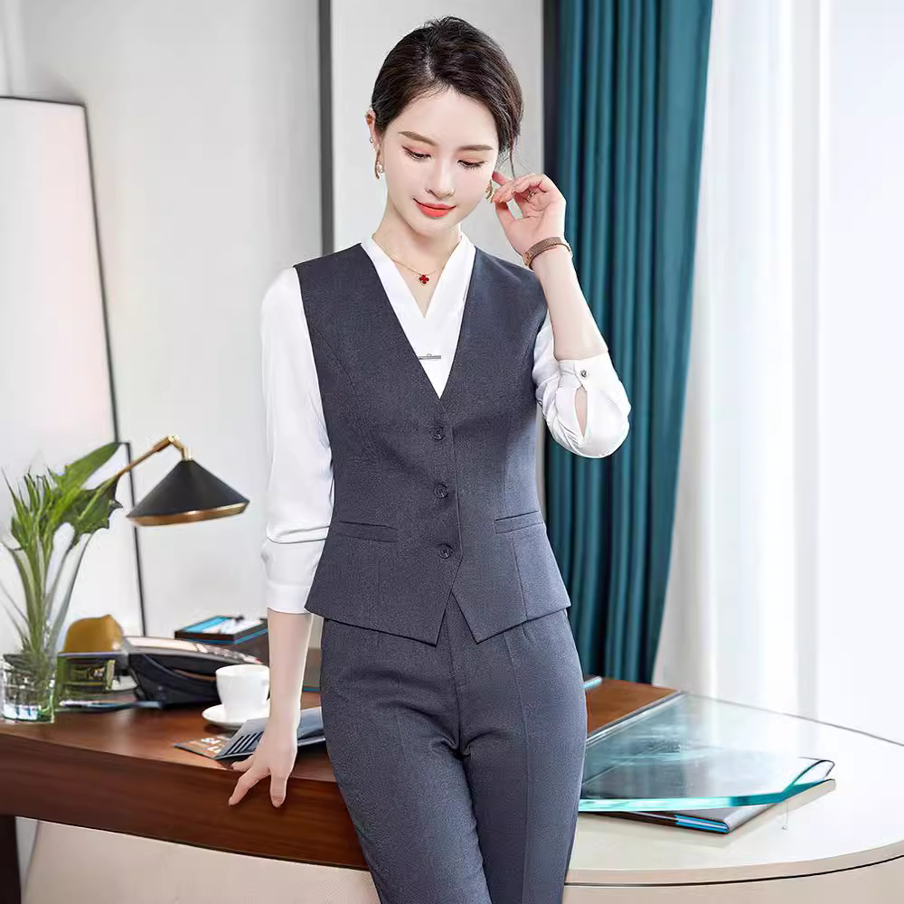 Bộ trang phục này dành cho các bạn nữ làm công việc đón tiếp, phục vụ tại các không gian như khách sạn, tiền sảnh. Thiết kế dạng áo gile kết hợp với quần tây tạo nên một bộ đồng phục chỉn chu, lịch sự. Chất vải co giãn nhẹ mang lại sự thoải mái cho những ngày làm việc dài. Sản phẩm dễ dàng phối cùng áo sơ mi bên trong và mặc trực tiếp như một bộ trang phục hoàn chỉnh, giúp bạn tự tin và thuận tiện trong mọi hoạt động. | Tên sản phẩm: Áo Vest Nữ Vest Hàng Mùa Xuân Thu Đông Đồ Công Sở - Thời Trang Nữ | Mã sản phẩm: L2240 - Giá: 640.000đ | Mã nhà sản xuất: SHRYIA-G02Hình ảnh sản phẩm