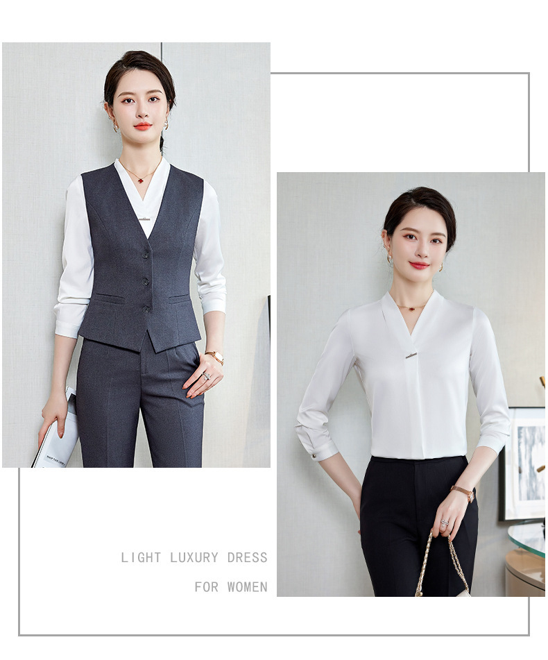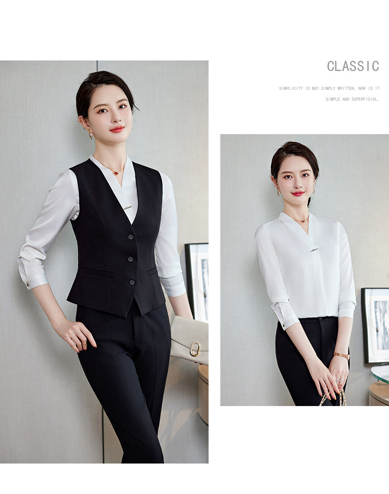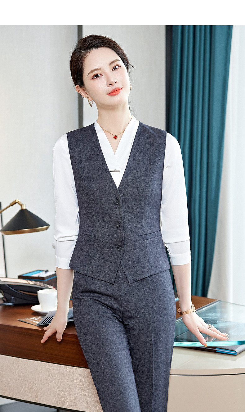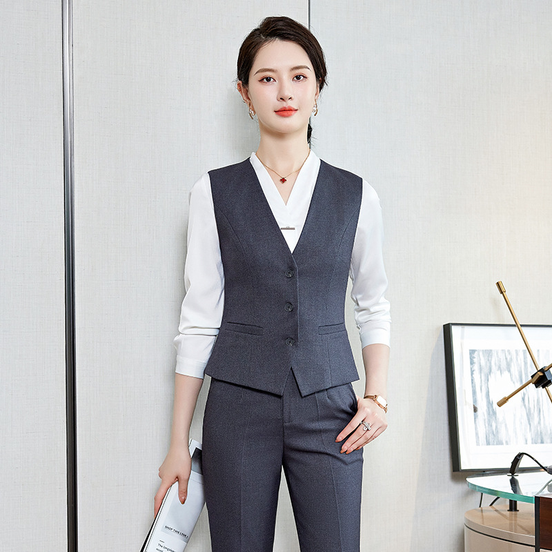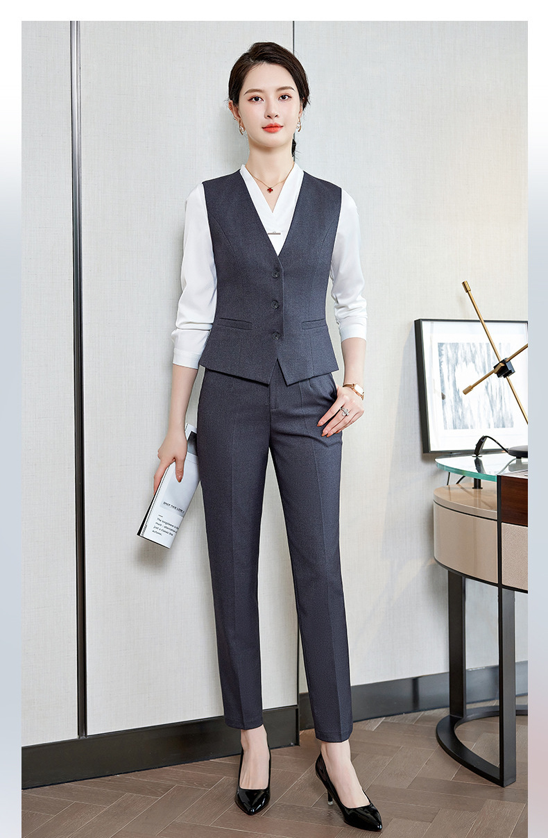 Bộ trang phục này dành cho các bạn nữ làm công việc đón tiếp, phục vụ tại các không gian như khách sạn, tiền sảnh. Thiết kế dạng áo gile kết hợp với quần tây tạo nên một bộ đồng phục chỉn chu, lịch sự. Chất vải co giãn nhẹ mang lại sự thoải mái cho những ngày làm việc dài. Sản phẩm dễ dàng phối cùng áo sơ mi bên trong và mặc trực tiếp như một bộ trang phục hoàn chỉnh, giúp bạn tự tin và thuận tiện trong mọi hoạt động. | Tên sản phẩm: Áo Vest Nữ Vest Hàng Mùa Xuân Thu Đông Đồ Công Sở - Thời Trang Nữ | Mã sản phẩm: L2240 - Giá: 640.000đ | Mã nhà sản xuất: SHRYIA-G02Hình ảnh sản phẩm