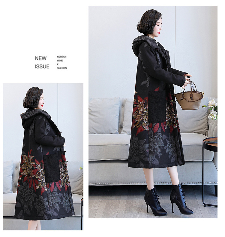 Áo khoác dáng dài qua gối, có mũ trùm và lớp lót bông mềm mại giữ ấm tốt cho mùa lạnh. Kiểu áo phong cách cổ điển, họa tiết dân tộc độc đáo, form rộng thoải mái, phù hợp cho nhiều dịp mặc hằng ngày. Sản phẩm dễ kết hợp cùng quần jeans hay váy thun, mặc đi làm, dạo phố hay giữ ấm ở nhà đều tiện lợi. Chất vải co giãn nhẹ, tạo cảm giác dễ chịu khi mặc cả ngày. | Tên sản phẩm: Áo Khoác Nữ Dài Quá Gối Mũ Liền Hàng Mùa Xuân Thu Đông Trung Niên Phục Cổ Cổ Điển - Thời Trang Nữ | Mã sản phẩm: L2498 - Giá: 2.390.000đ | Mã nhà sản xuất: HADA-G05Hình ảnh sản phẩm