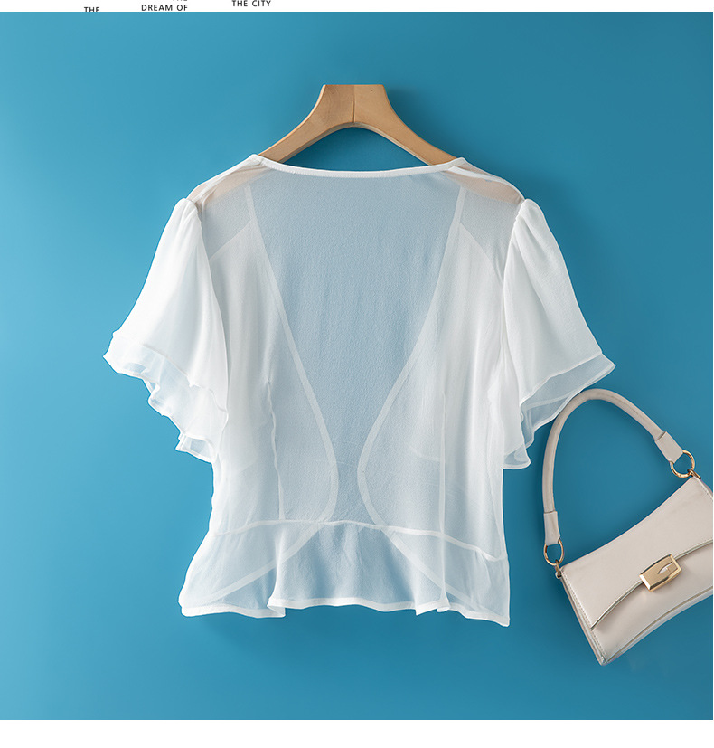 Áo khoác mỏng nhẹ chống nắng, kiểu dáng ngắn tay lỡ phối màu đồng nhất. Chất vải mềm mại từ tơ tằm tự nhiên, mang lại cảm giác mát mẻ, dễ chịu. Tay áo được may hai lớp tinh tế, vừa tạo điểm nhấn lại hạn chế nắng xuyên qua. Có thể mặc như áo khoác mỏng che nắng hoặc khoác nhẹ như áo choàng khi trời se lạnh. Phù hợp dùng khi đi ra ngoài trời hoặc trong phòng máy lạnh. | Tên sản phẩm: Áo Khoác Nữ Chất Liệu Lụa Tơ Tằm Ngắn Tay - Thời Trang Nữ | Mã sản phẩm: L2500 - Giá: 1.350.000đ | Mã nhà sản xuất: SHDA-G04Hình ảnh sản phẩm