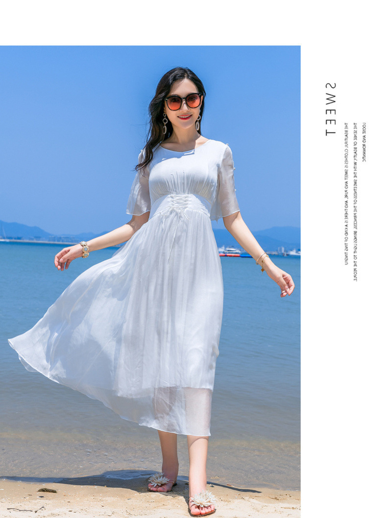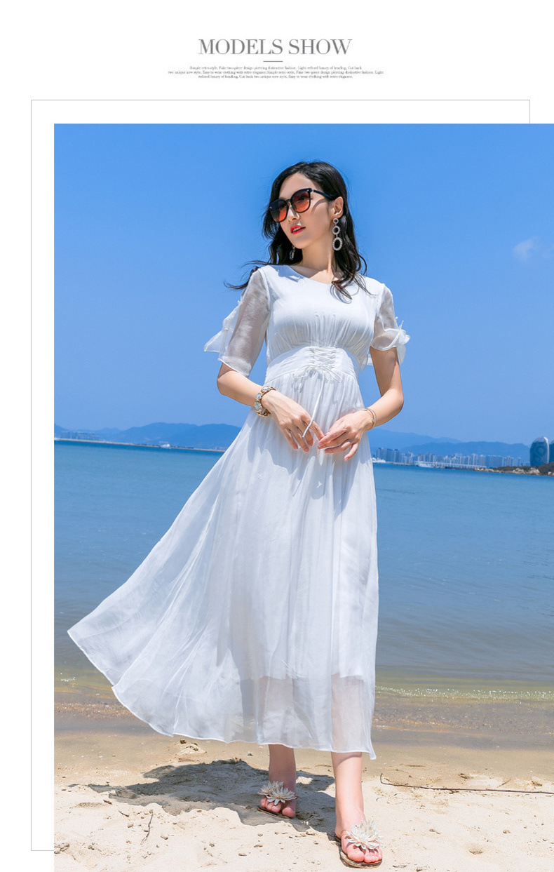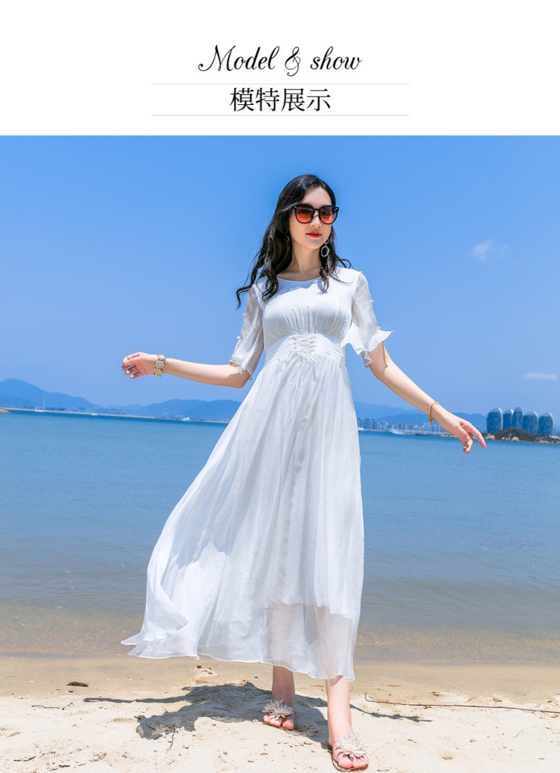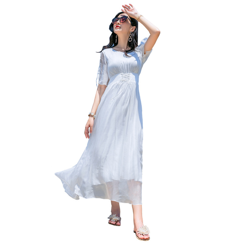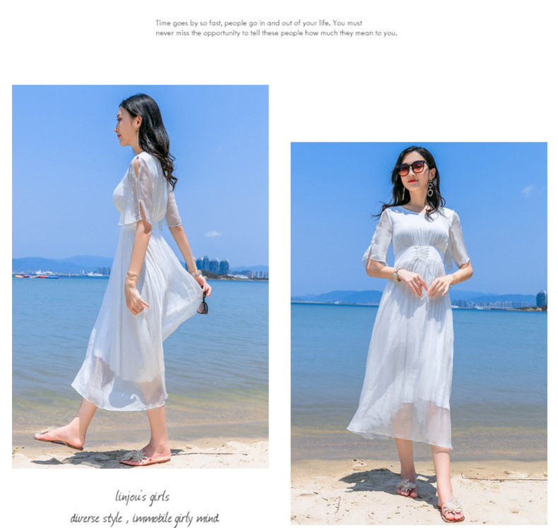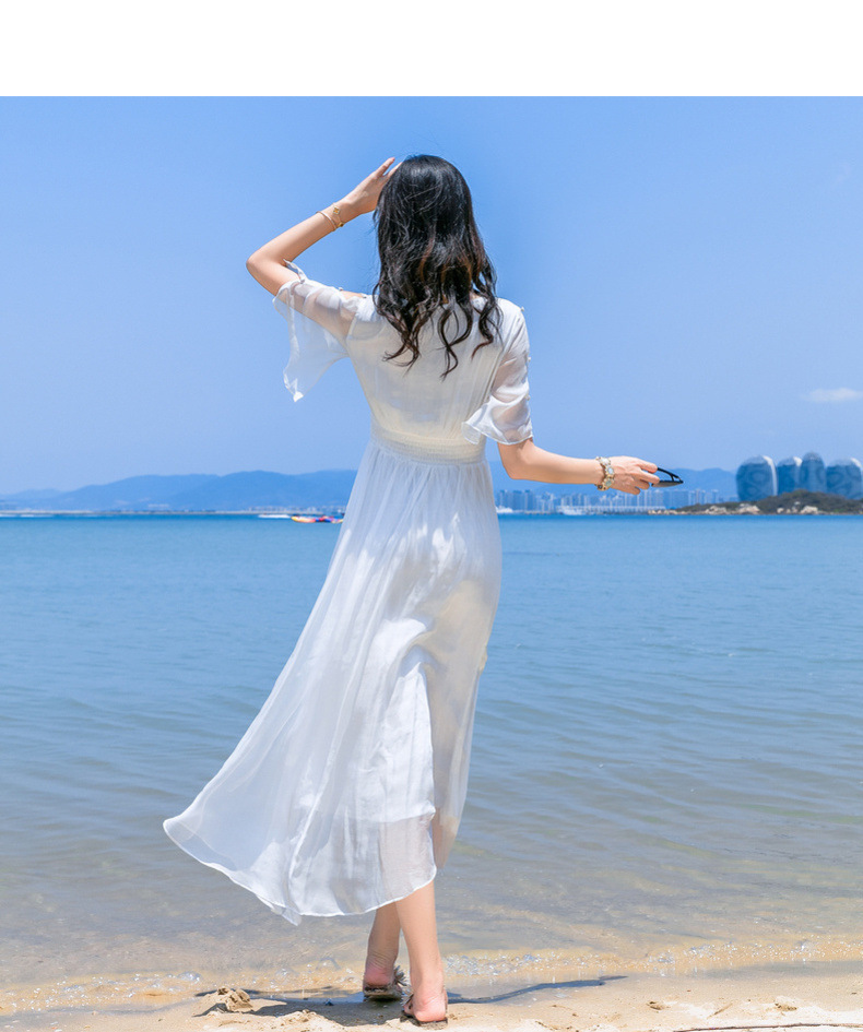 Chiếc váy dành cho những chuyến du lịch biển, được dệt từ sợi tơ tằm tự nhiên mềm mại và thoáng mát. Thiết kế theo phong cách tự do, phóng khoáng với cổ chữ V và thân váy có dây rút co giãn giúp ôn nhẹ vào eo, tôn lên dáng người một cách tự nhiên. Có thể mặc đi dạo phố hay kết hợp với mũ rộng vành để tạo điểm nhấn. Chất vải nhẹ tạo cảm giác dễ chịu khi mặc. | Tên sản phẩm: Váy Đầm Liền Thân Nữ Chất Liệu Lụa Tơ Tằm Cổ Chữ V - Thời Trang Nữ | Mã sản phẩm: L2511 - Giá: 2.210.000đ | Mã nhà sản xuất: SHDA-G05Hình ảnh sản phẩm