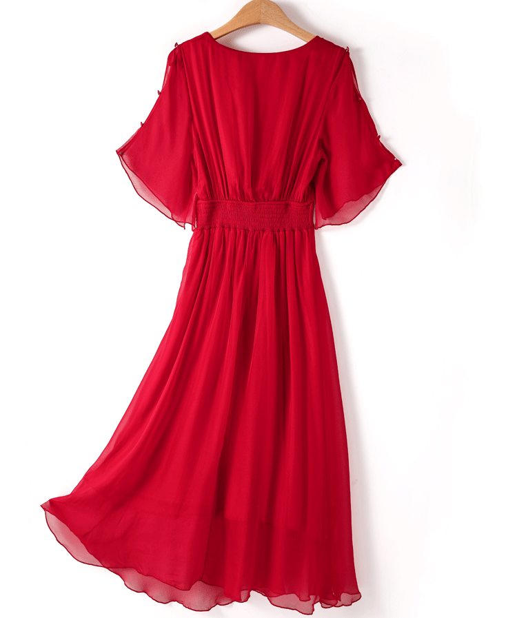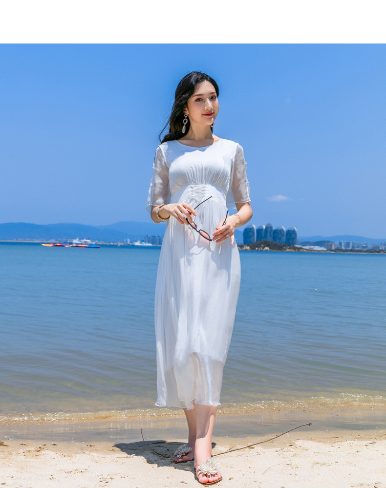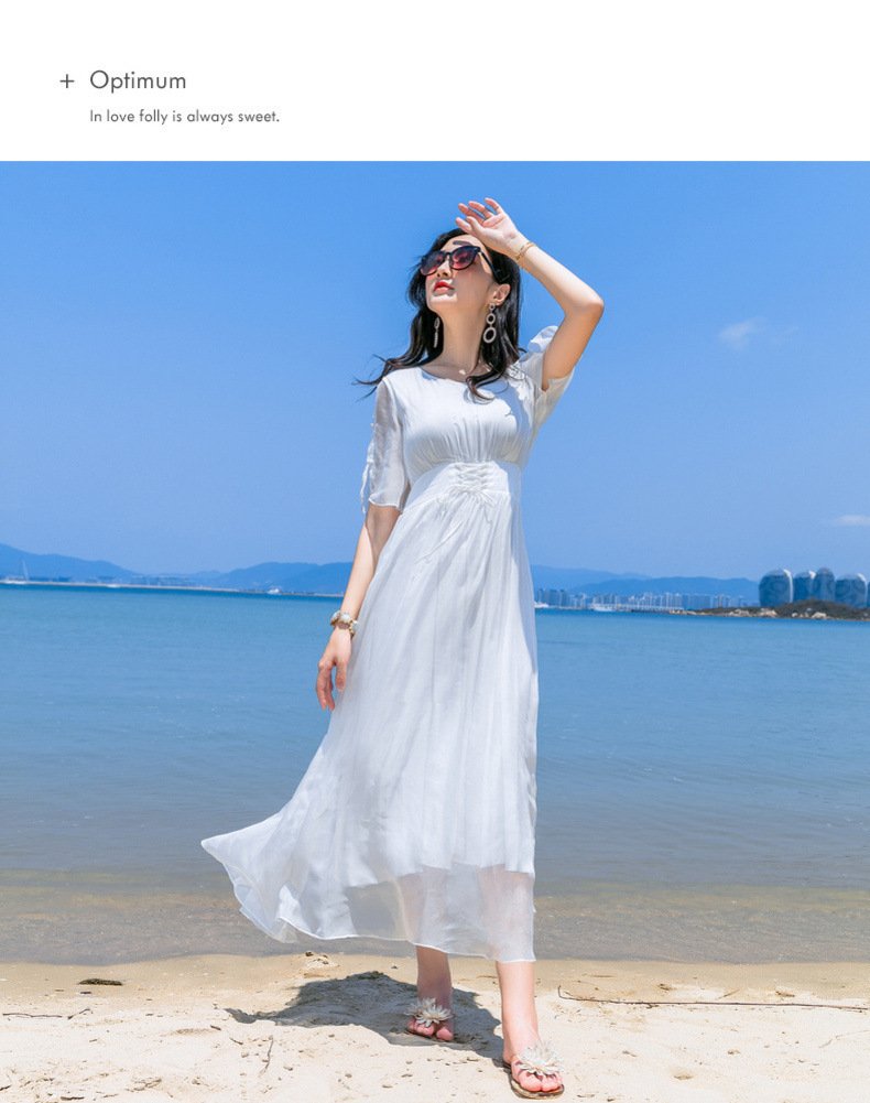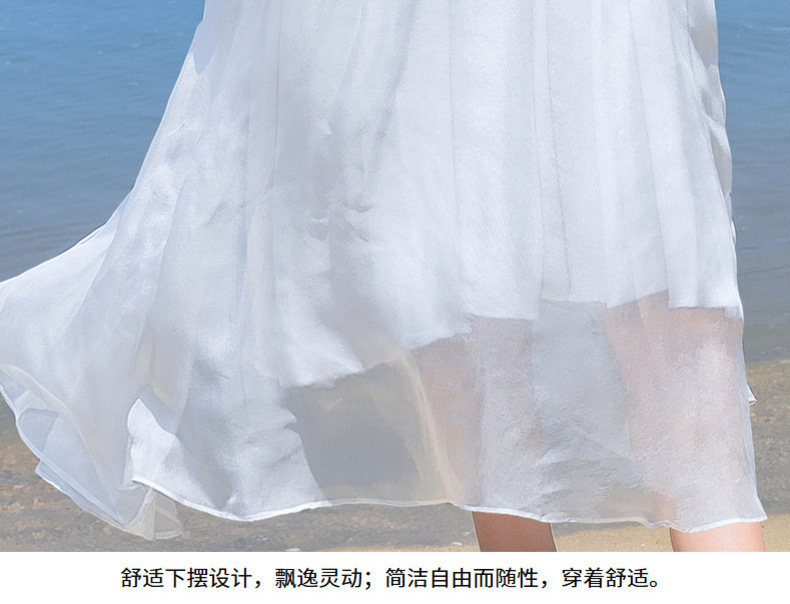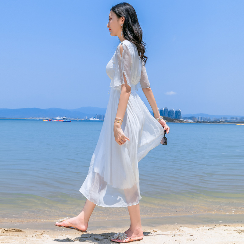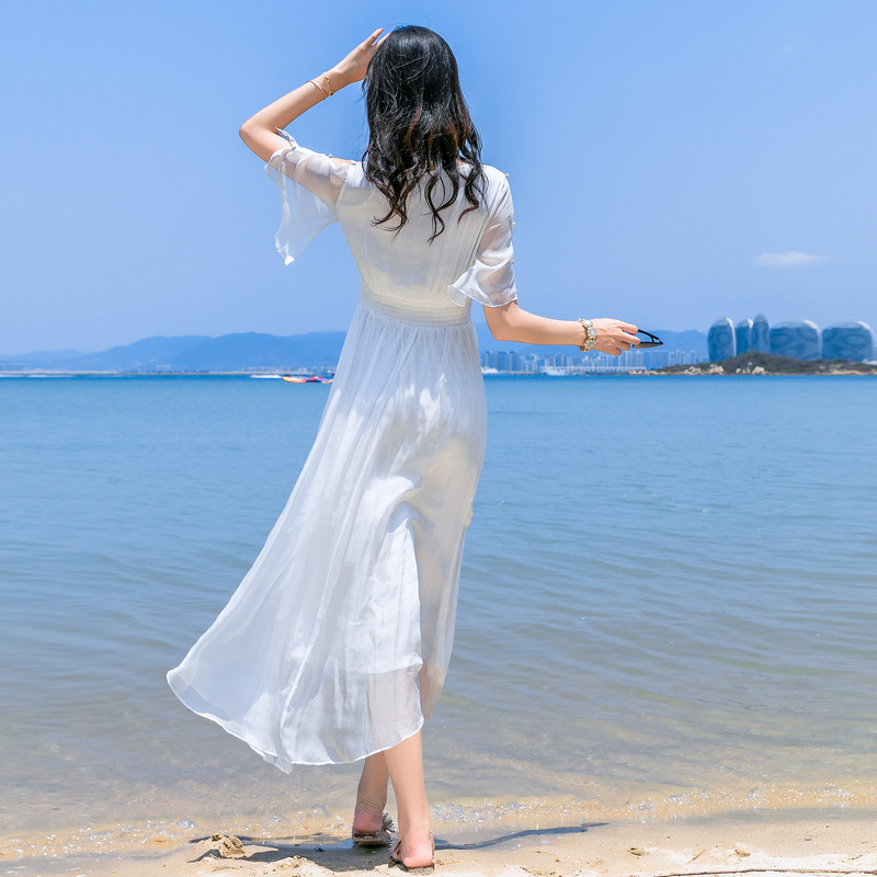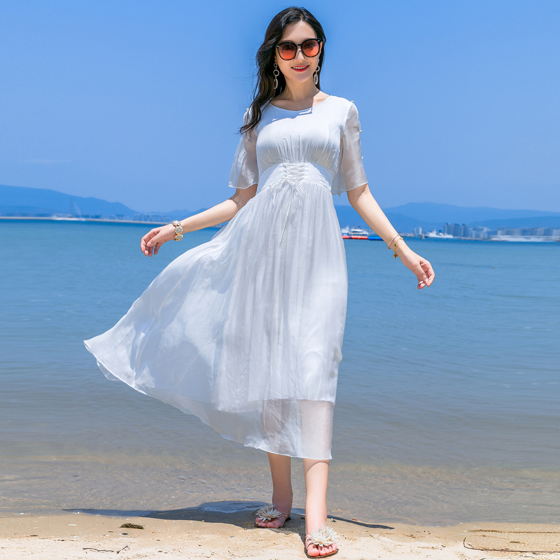 Chiếc váy dành cho những chuyến du lịch biển, được dệt từ sợi tơ tằm tự nhiên mềm mại và thoáng mát. Thiết kế theo phong cách tự do, phóng khoáng với cổ chữ V và thân váy có dây rút co giãn giúp ôn nhẹ vào eo, tôn lên dáng người một cách tự nhiên. Có thể mặc đi dạo phố hay kết hợp với mũ rộng vành để tạo điểm nhấn. Chất vải nhẹ tạo cảm giác dễ chịu khi mặc. | Tên sản phẩm: Váy Đầm Liền Thân Nữ Chất Liệu Lụa Tơ Tằm Cổ Chữ V - Thời Trang Nữ | Mã sản phẩm: L2511 - Giá: 2.210.000đ | Mã nhà sản xuất: SHDA-G05Hình ảnh sản phẩm